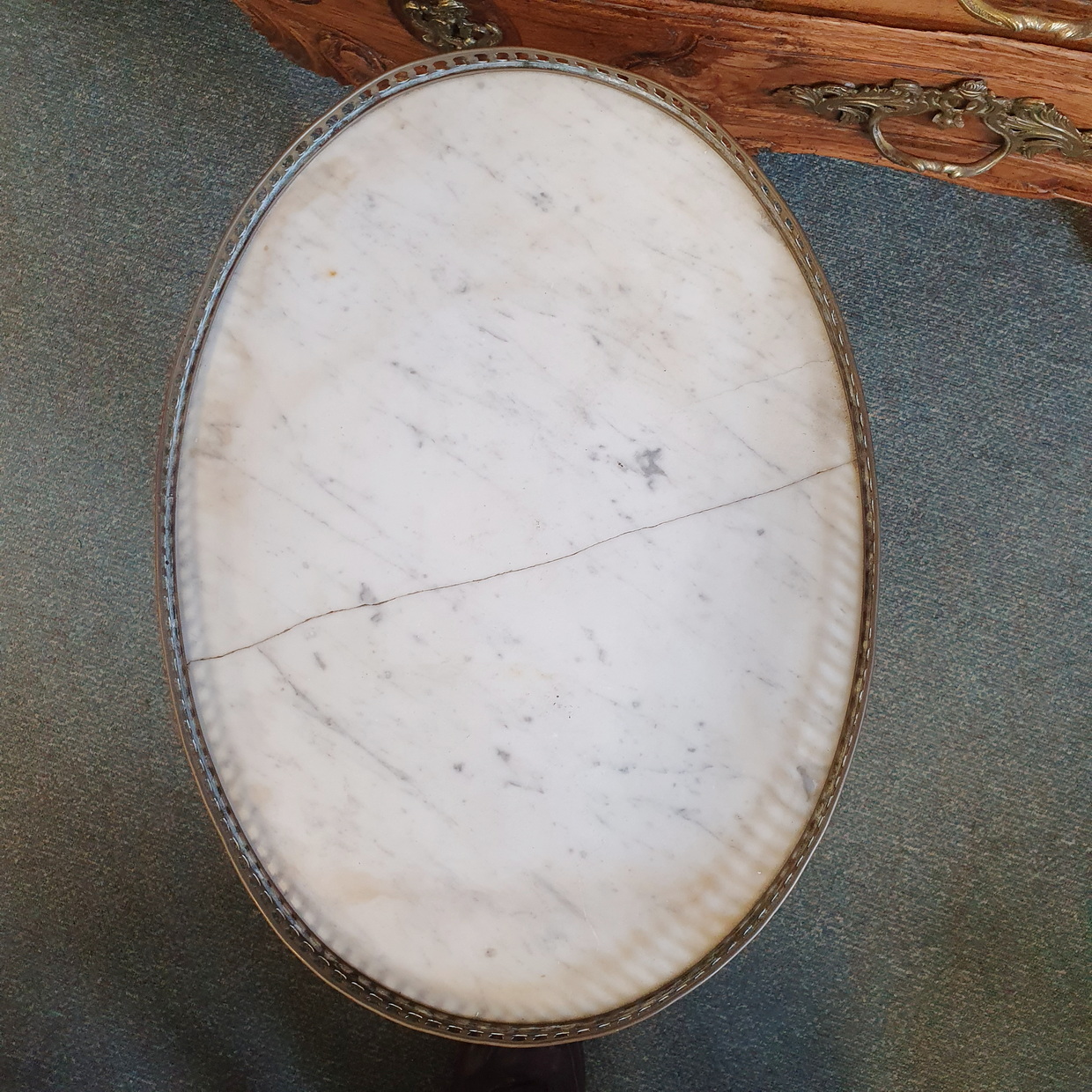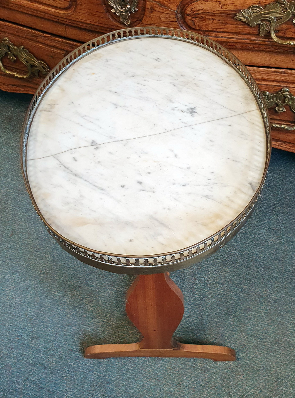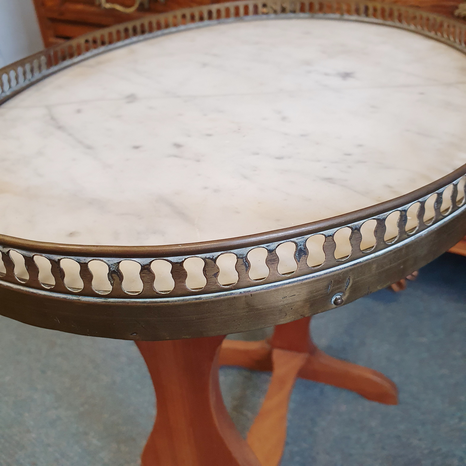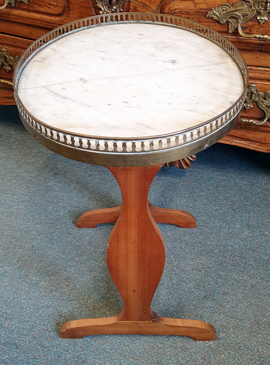 A small, early 20th century French Louis XVI mahogany and Carrara marble Bouillotte salon table, the oval-shaped top decorated with a raised and fretted gilt brass gallery, standing on a pedestal base. Please note a salon table's height is ideal for use as a side table, next to a sofa or an armchair. Area of Paris, circa 1930.