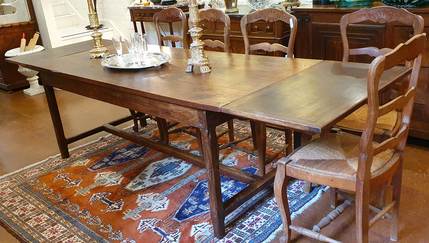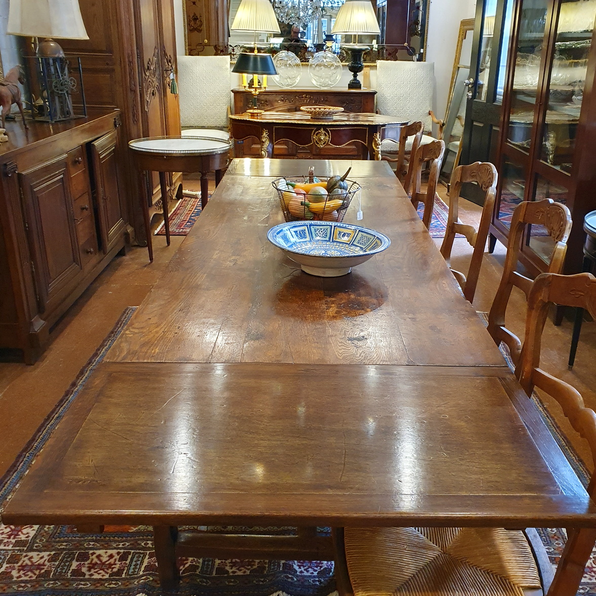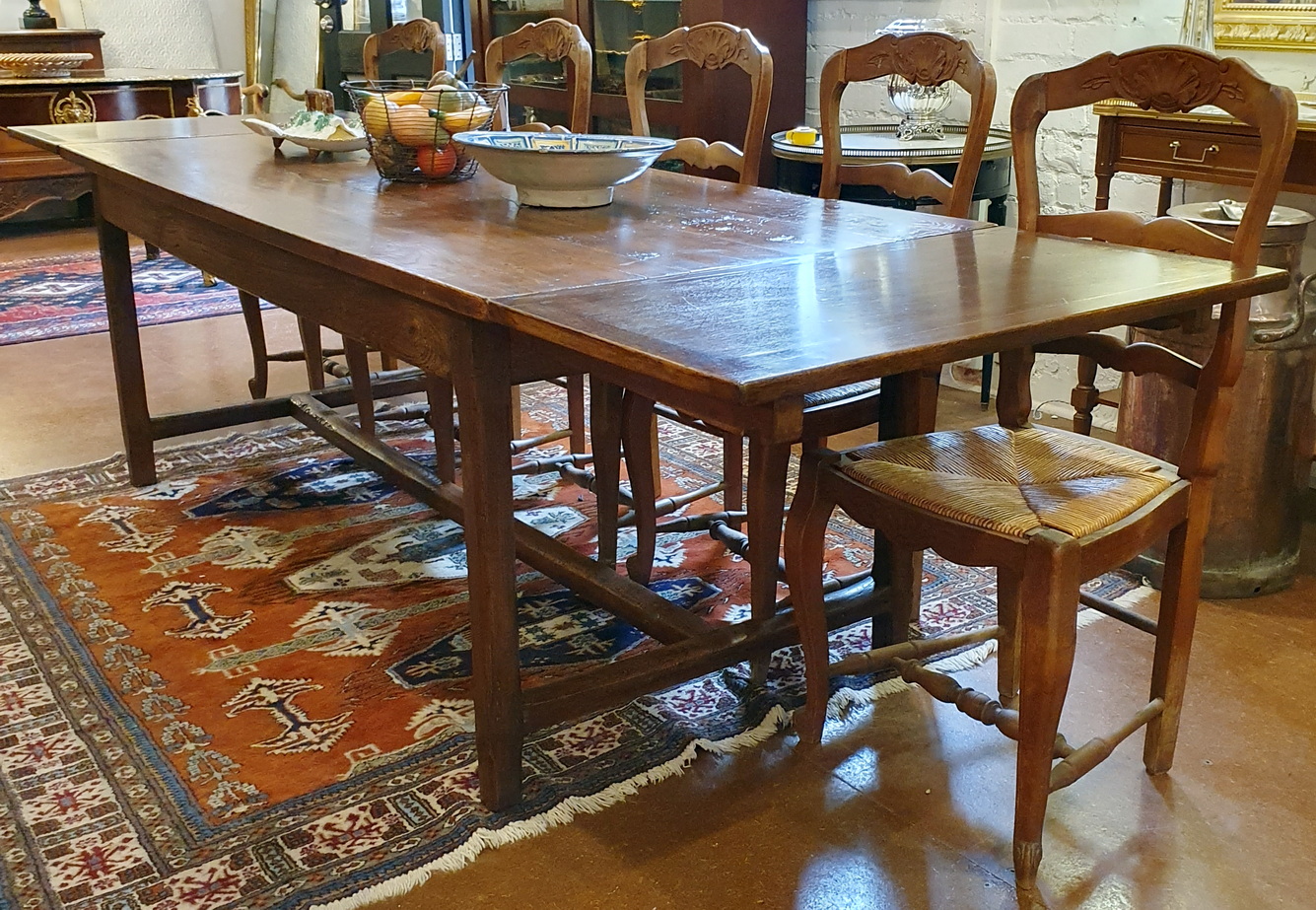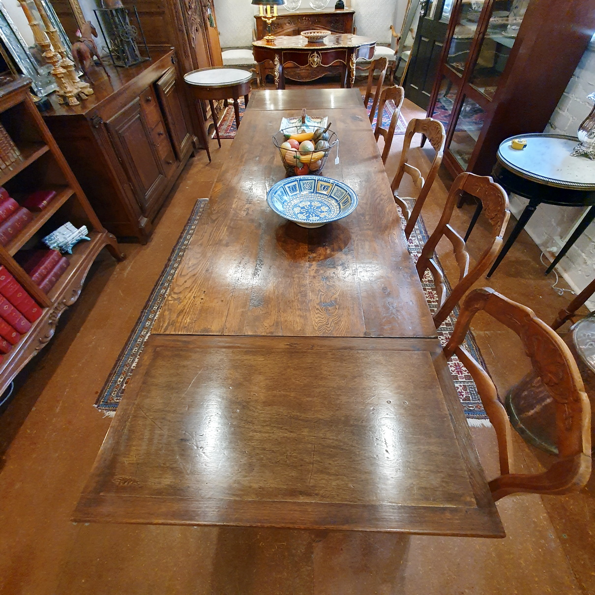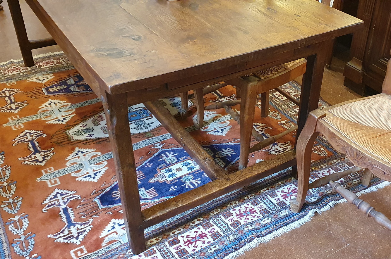 A 19th century French provincial solid oak farmhouse table, the well-burnished top with a rich oak colour above chamfered square-section legs joined by an ‘H’ stretcher. Shallow drawers opens at either end of the table. Please note: this table is fitted with (later) extension leaves that sit sturdily on pull-out prongs. When closed, this table sits 8, with one extension 10 and with both extensions 12 people. Area of Lower Normandy, circa 1880.