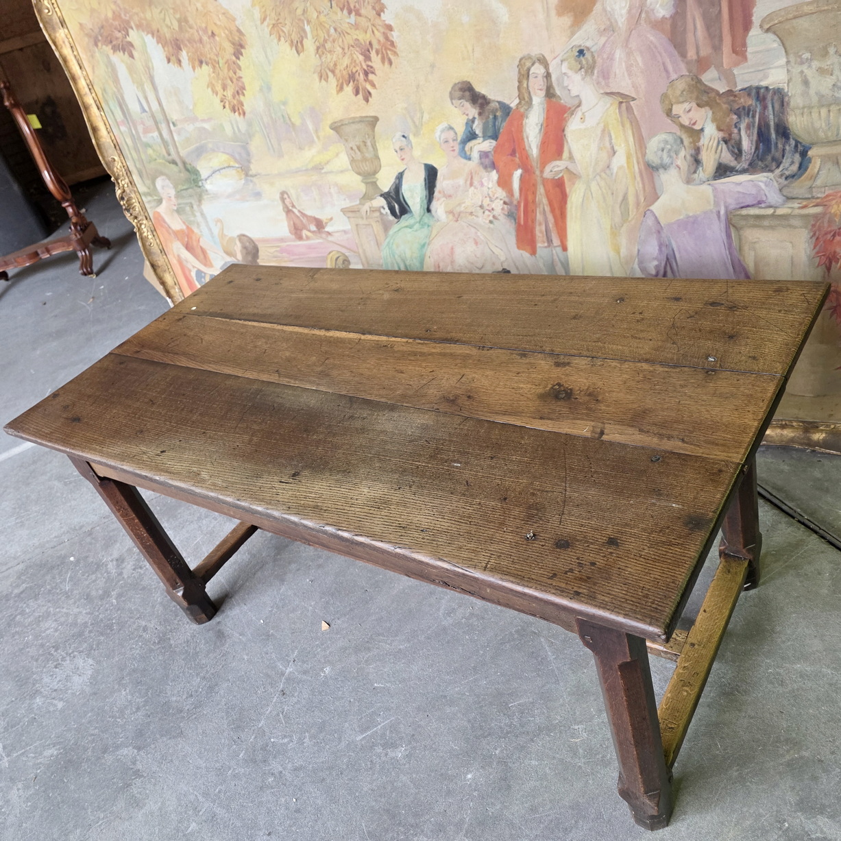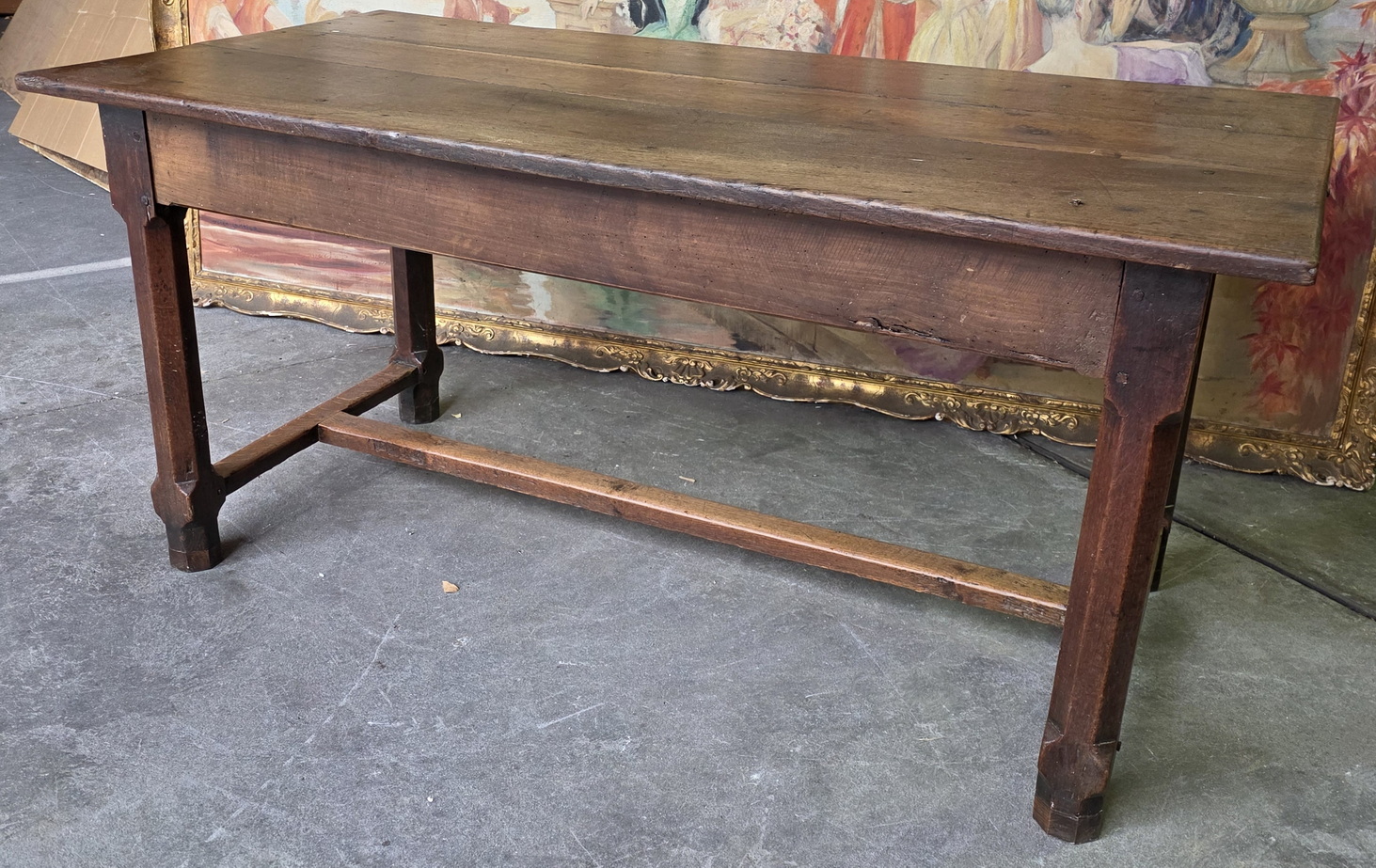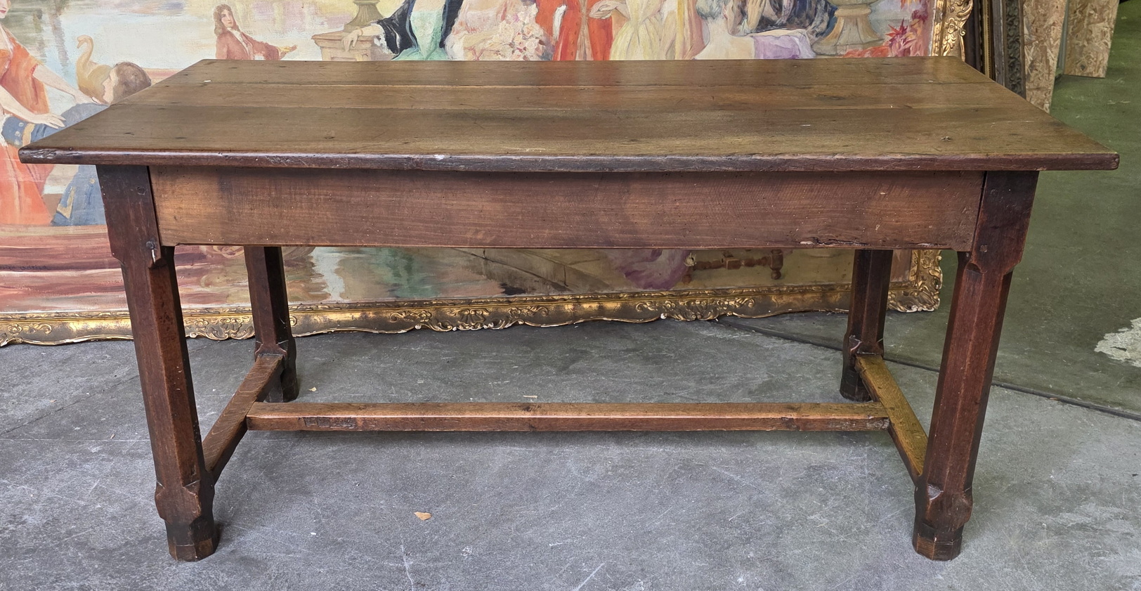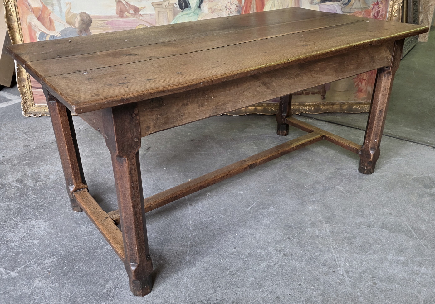 An 18th century French farmhouse kitchen table, the solid oak table top beautifully burnished by use and retaining a soft colour, showing markings from kitchen work, standing on chamfered square-section oak legs joined by an 'H' stretcher. The table shows its early construction techniques, including early type of saw cuts and structural joints with wooden peg. Area of the Lower Normandy, circa 1780.