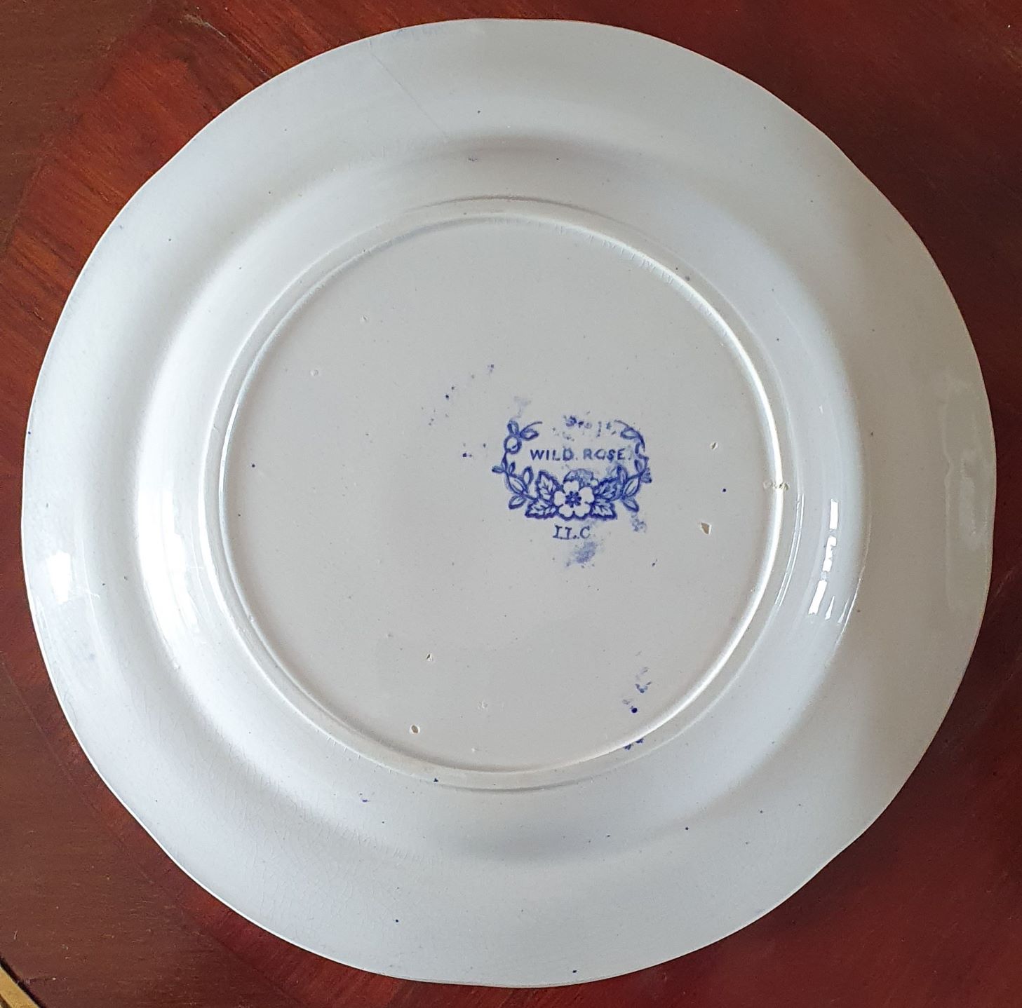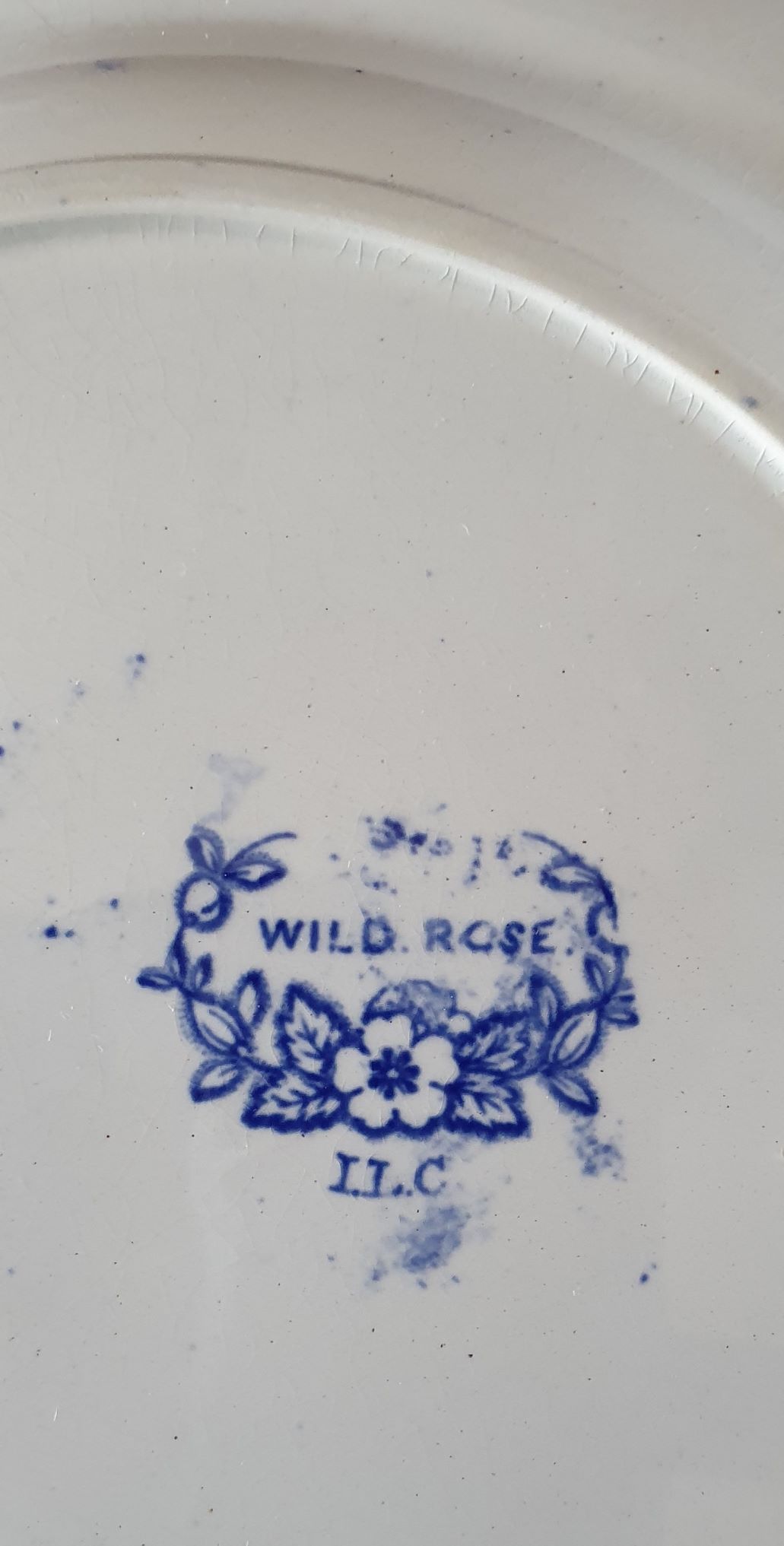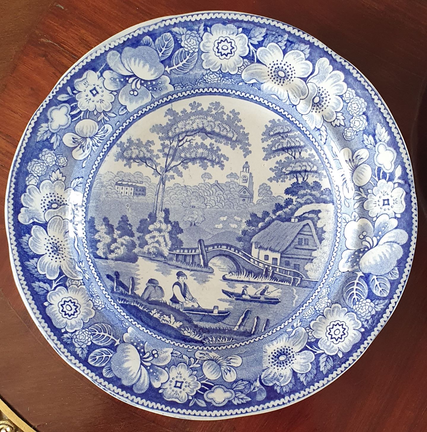 A set of eight early 19th century English Middlebro' Pottery 'Wild Rose' pattern blue printed plates, the centre of the plates depicting boatmen, a bridge and a manor home in the background, surrounded by a border of stylised rose flowers and foliage. Please note: this set of eight comes with an extra, ninth plate. Area of Yorkshire, circa 1840.