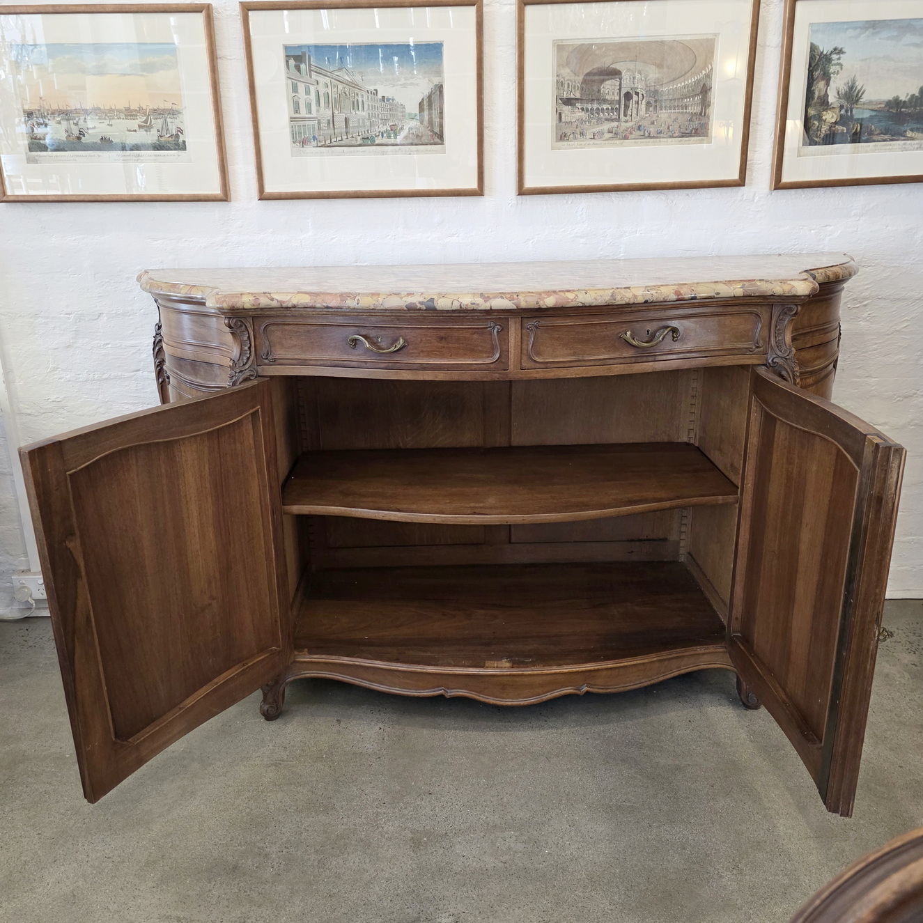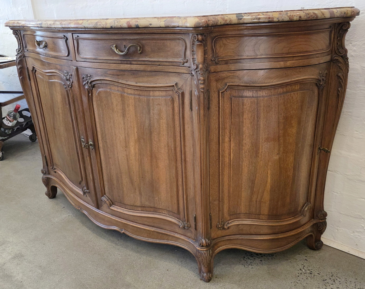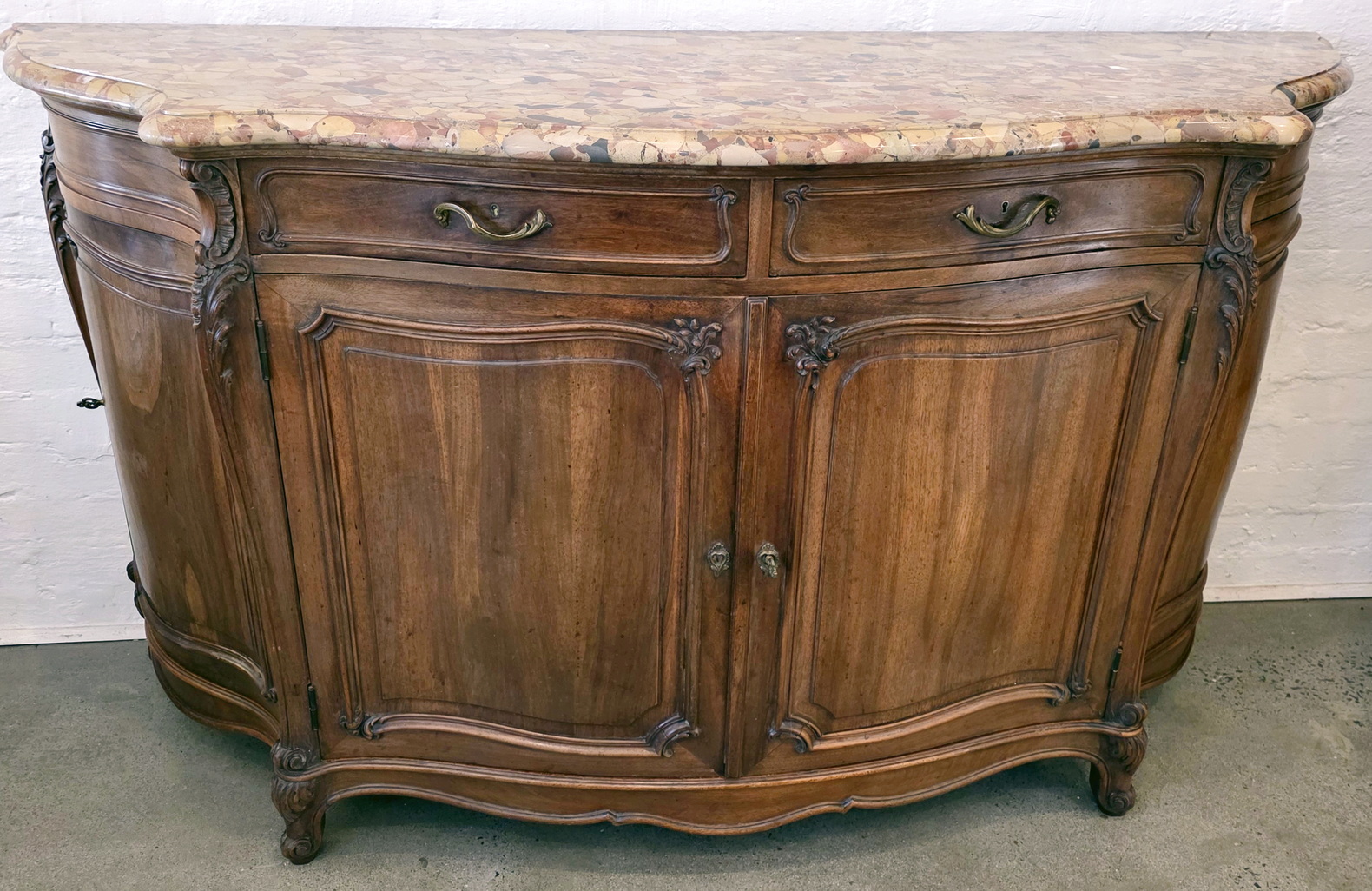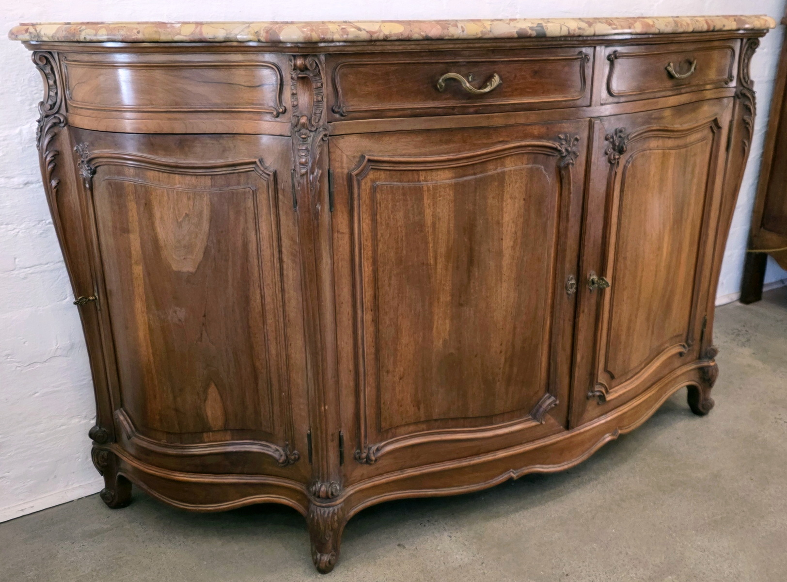 A French Louis XV style, extra wide 'Buffet d'Enfilade' four door sideboard, the wonderful serpentine and bombee shaped solid walnut body decorated with finely carved haut relief mouldings and with foliate and stylised seashell motifs. Retaining the original, serpentine-shaped and moulded 'Breche' marble top. Please note the high quality of the cabinetmaking, typical of workshops of the Parisian 'Faubourg Saint Antoine'. The top inscribed with the cabinetmaker's hallmark "Schaal". Please note the nicely faded tonalities of the walnut timbers. Area of Paris, circa 1900.