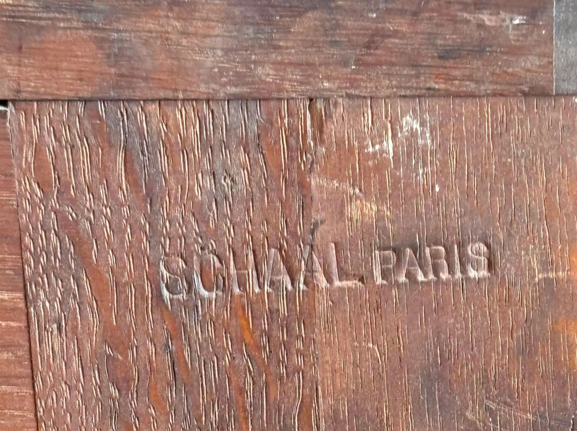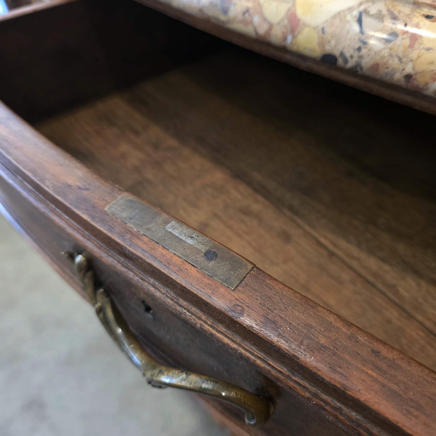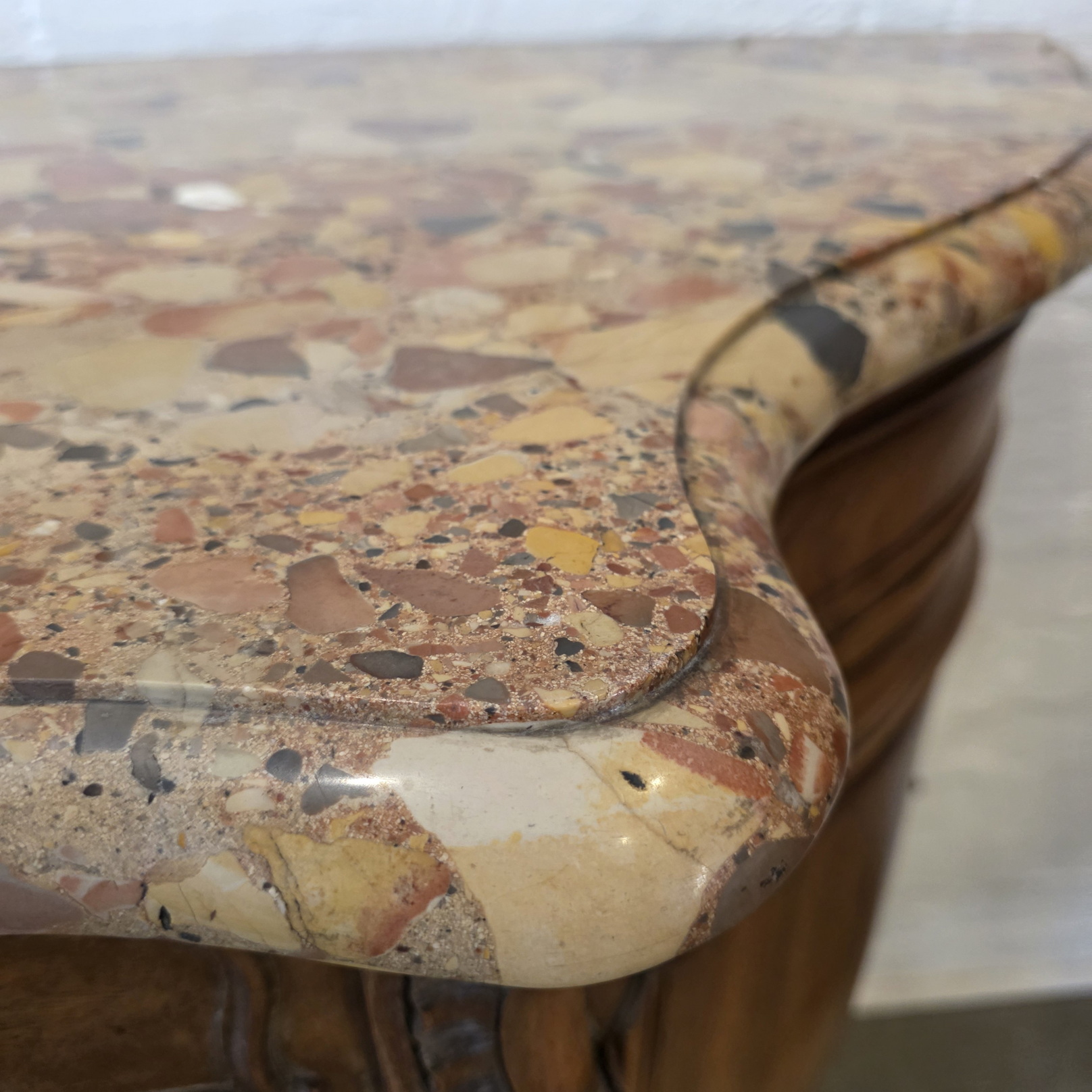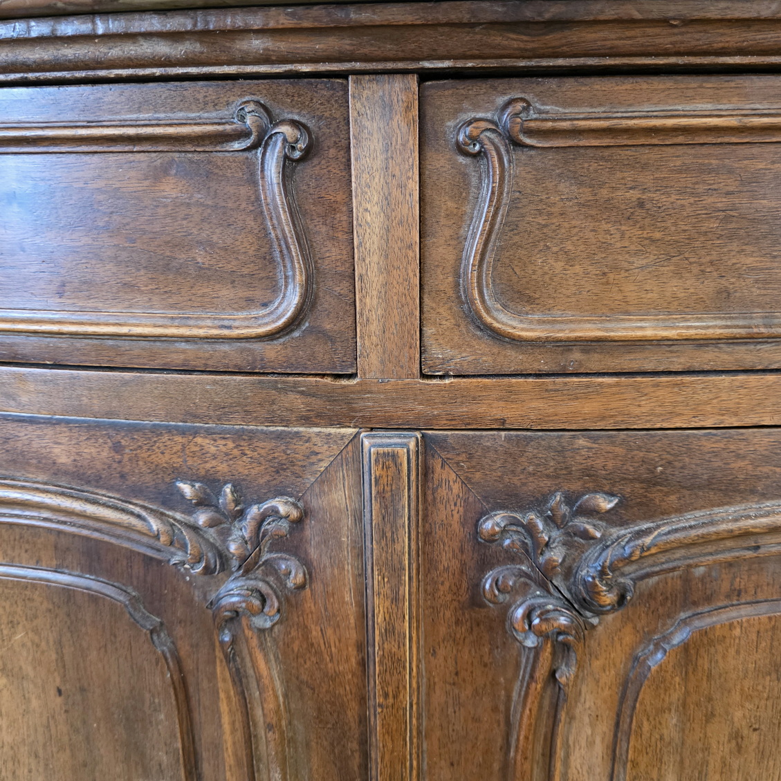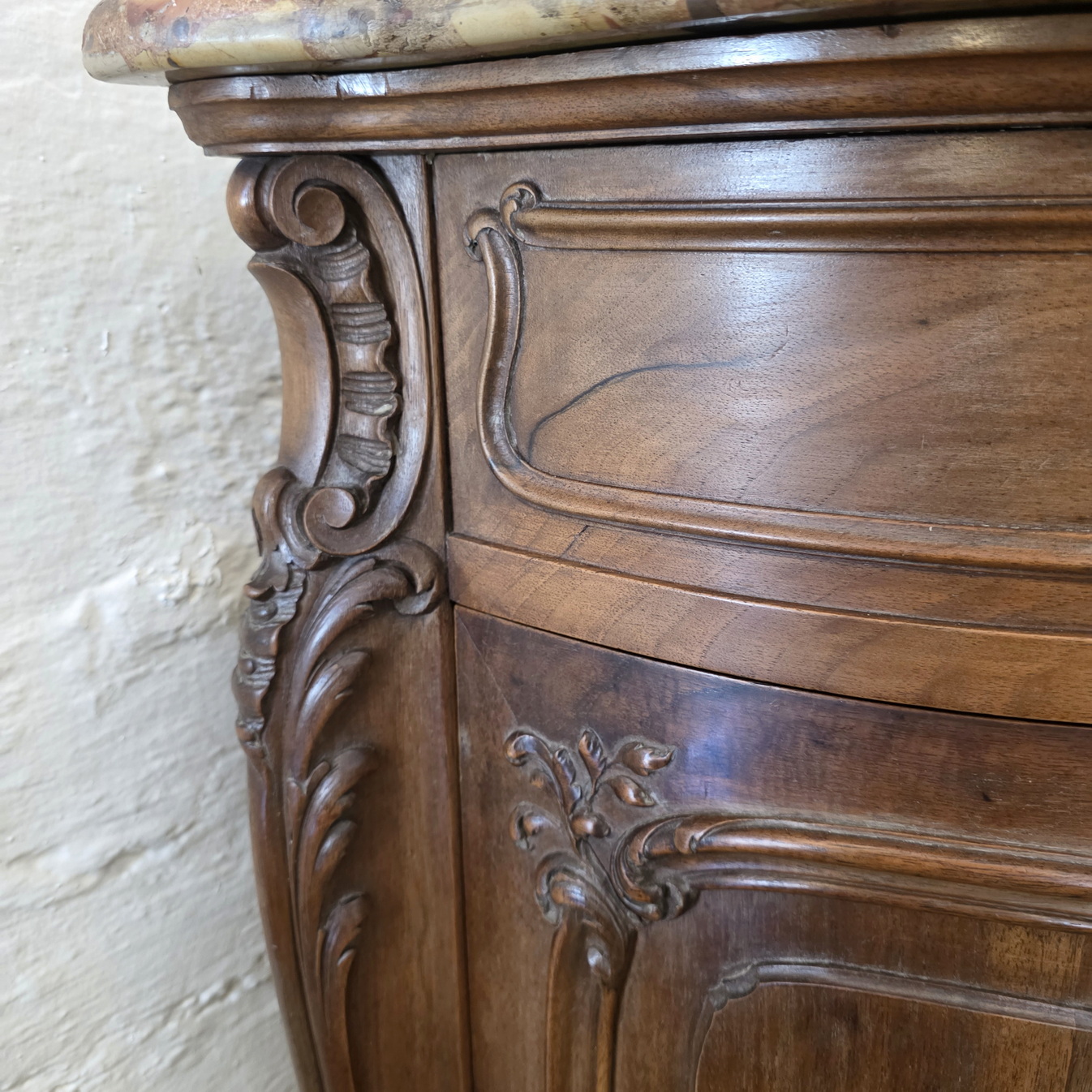 A French Louis XV style, extra wide 'Buffet d'Enfilade' four door sideboard, the wonderful serpentine and bombee shaped solid walnut body decorated with finely carved haut relief mouldings and with foliate and stylised seashell motifs. Retaining the original, serpentine-shaped and moulded 'Breche' marble top. Please note the high quality of the cabinetmaking, typical of workshops of the Parisian 'Faubourg Saint Antoine'. The top inscribed with the cabinetmaker's hallmark "Schaal". Please note the nicely faded tonalities of the walnut timbers. Area of Paris, circa 1900.
