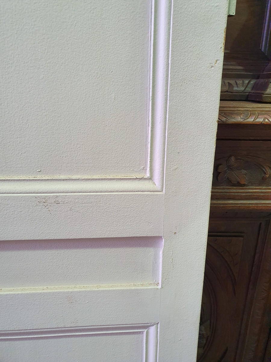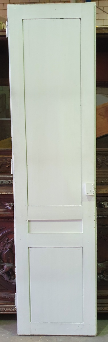 A single, narrow 19th century French internal door, traditionally jointed and hand-planed, white-painted and with several coats of old paint.