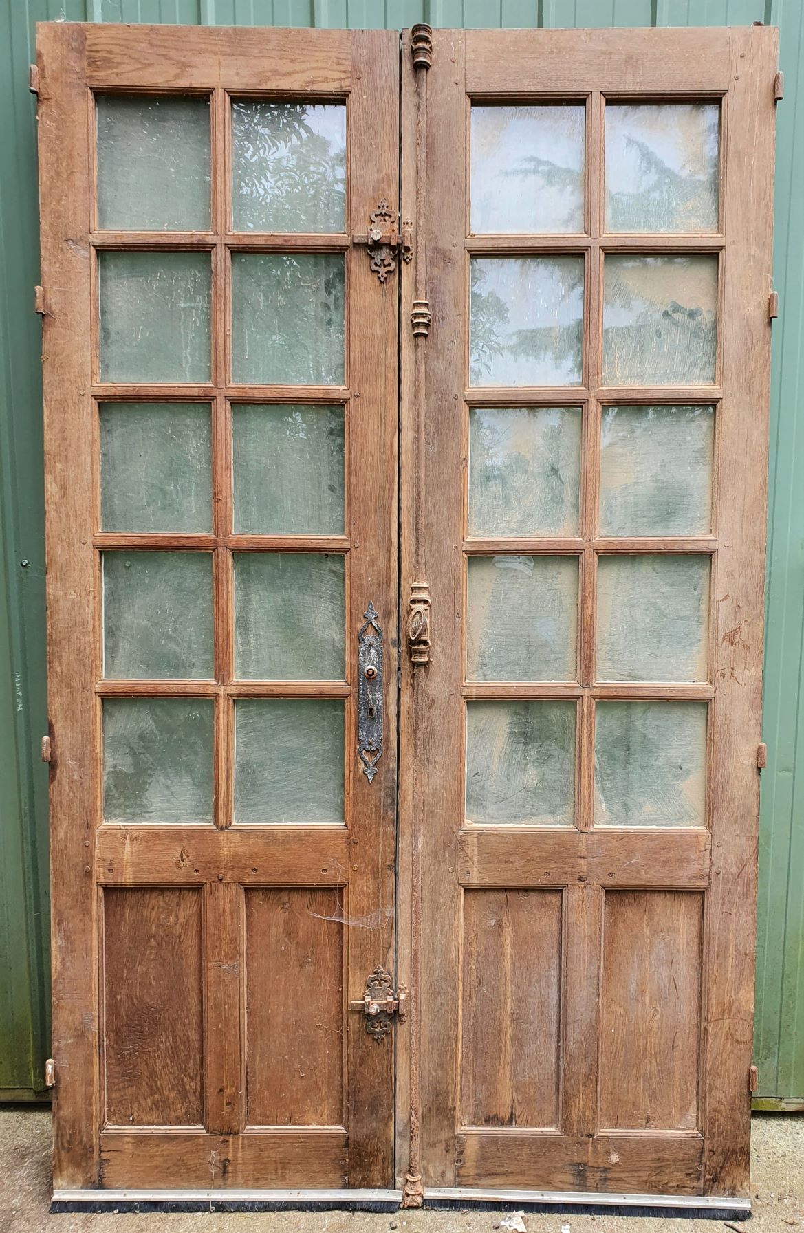 A pair of 19th century French astragaled external/ internal doors, each door made from solid oak, fitted with 10 glass panels above a panelled plinth. Retaining the original locks and wrought iron handles and the original cremorne bolt. Please note the original 'pegged' joints of the doors' construction. Area of Isle de France (Greater Paris), circa 1880.