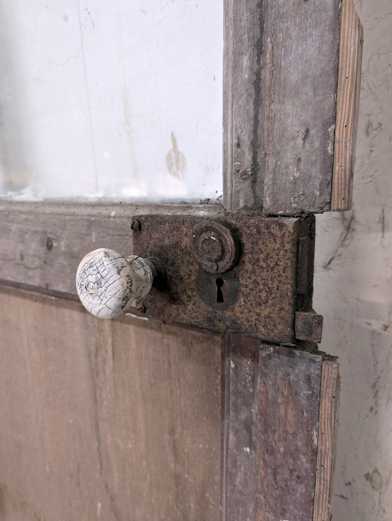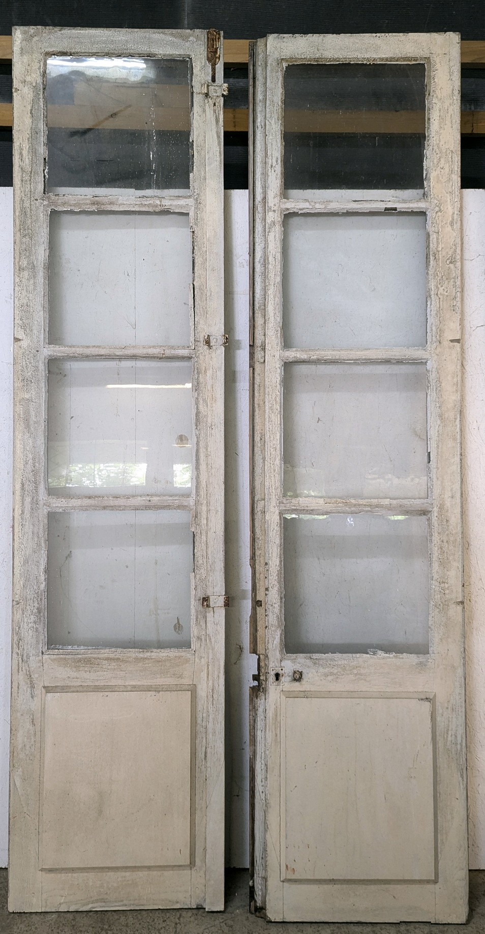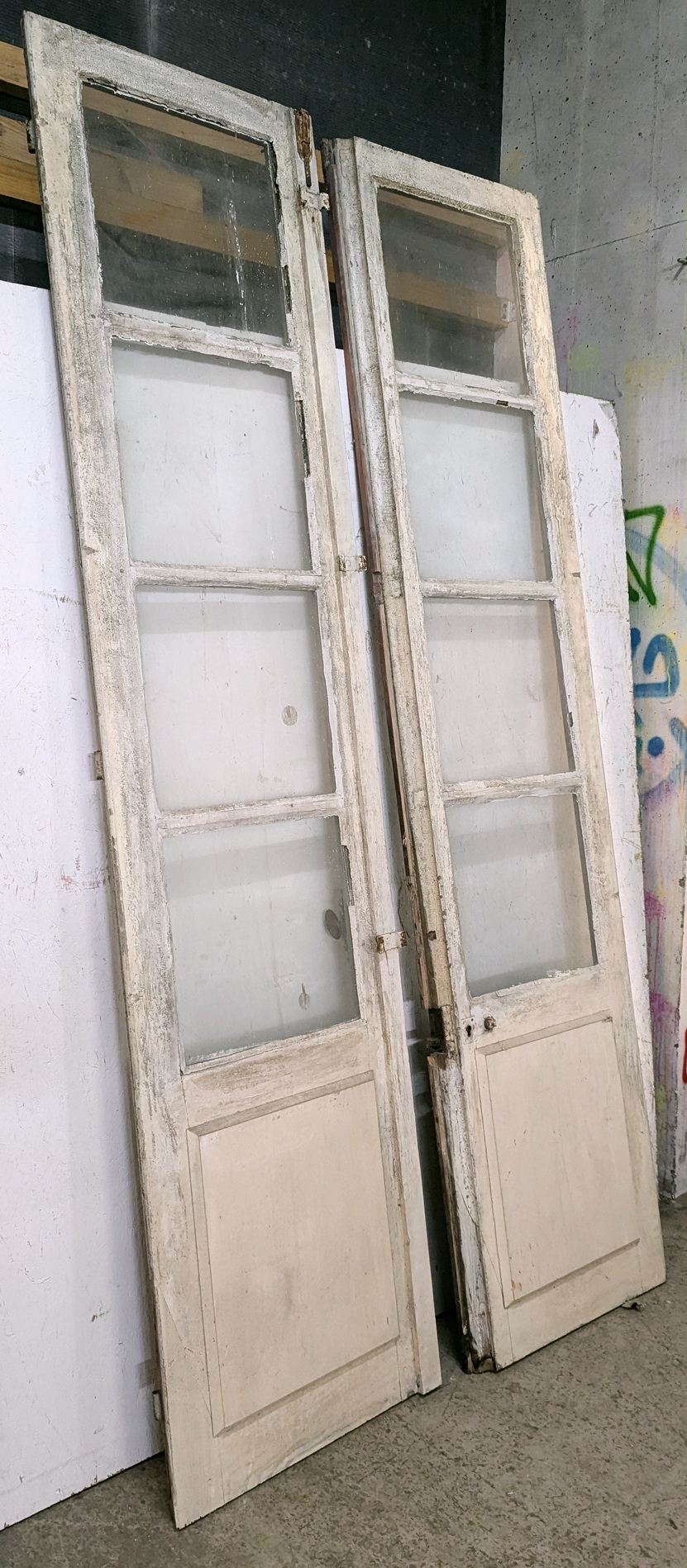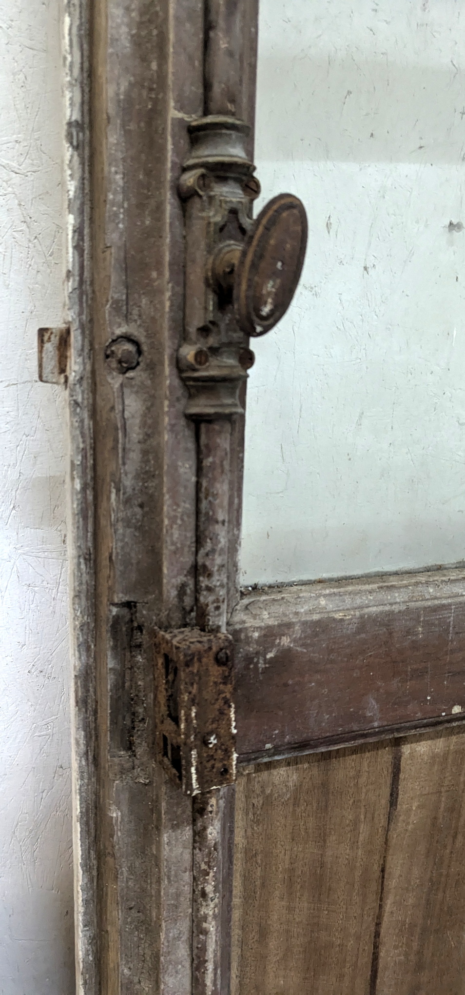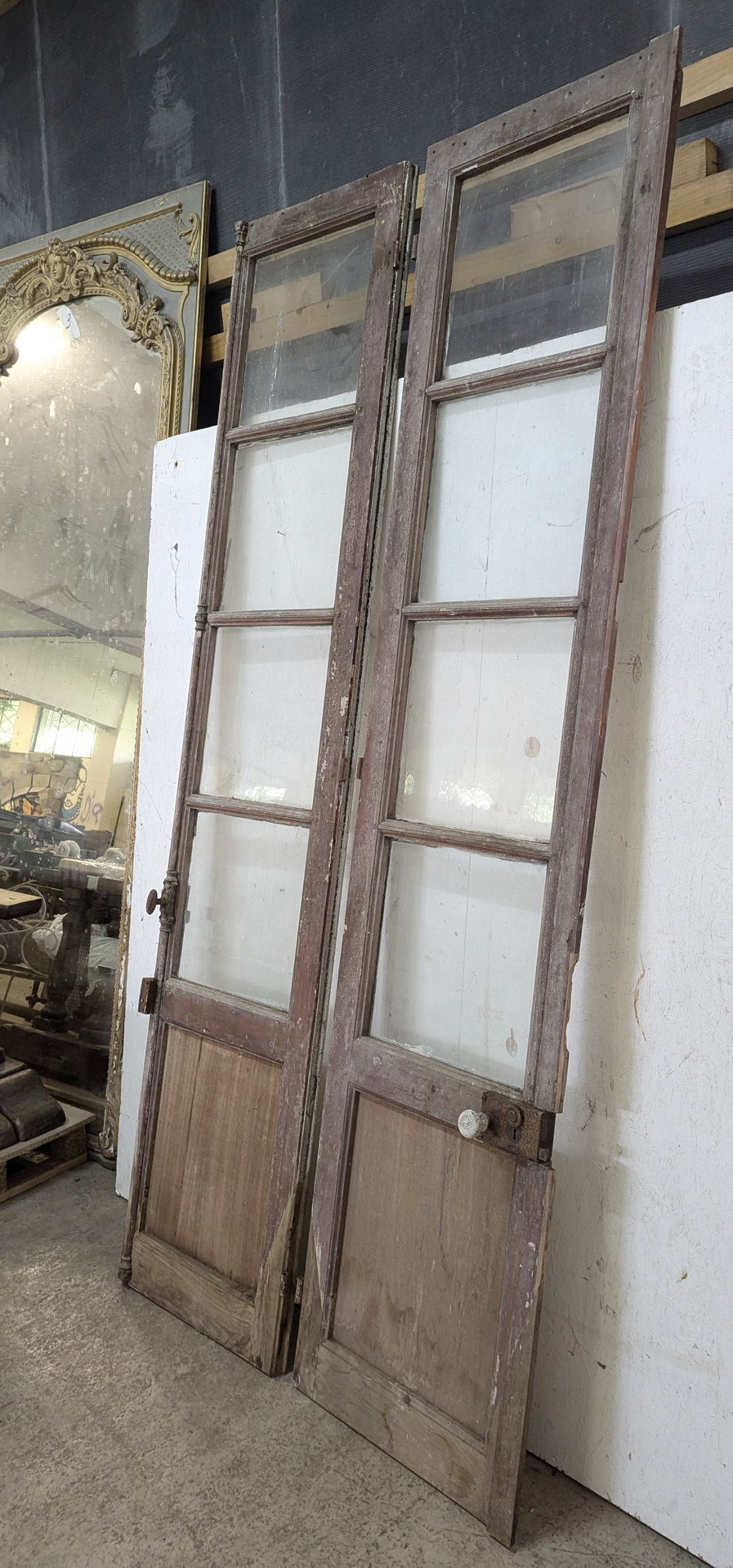 A pair of tall 19th century French external/ internal doors, each fitted with four astragaled glass panels above a panelled plinth. Retaining the original locks and wrought iron handles and the original Cremorne bolt at the rear of the doors. Area of Isle de France (Greater Paris), circa 1880.
