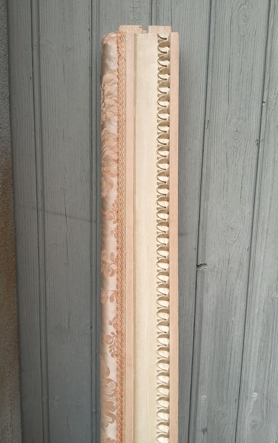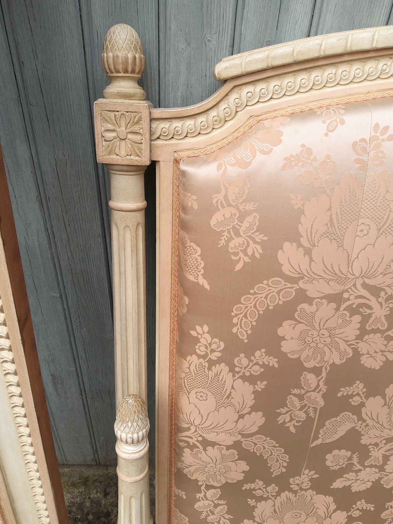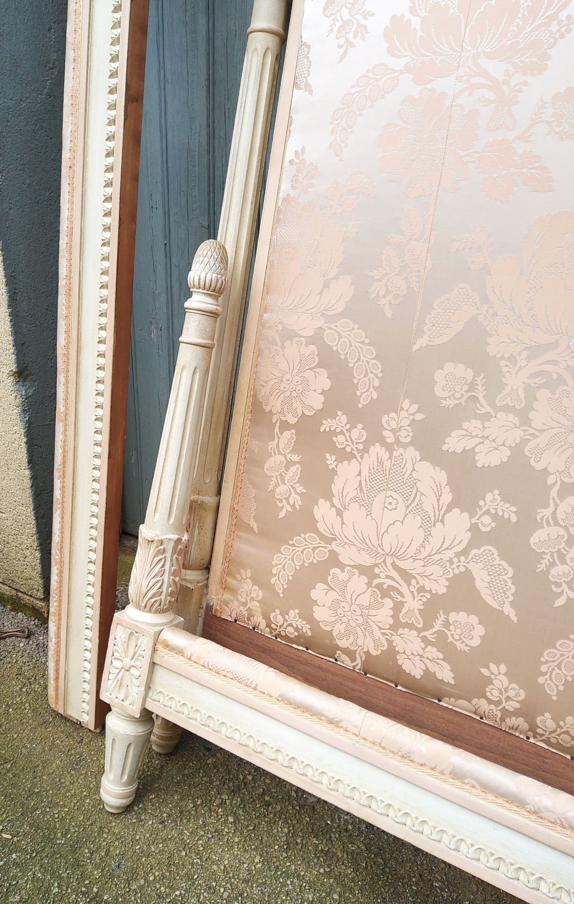 An elegant French Louis XVI style finely carved and painted and upholstered bed, comprising bed head, footer and side rails. This bed will take a standard King size mattress (which is 183 cm wide). The long side rails may need to be lengthened (depending on the make of the mattress), and if required, our workshop can sympathetically extend these. Please note the excellent quality, Neoclassical haut-relief decorations of the bed, and the footer's two elegant pilasters. Area of Paris, circa 1930.