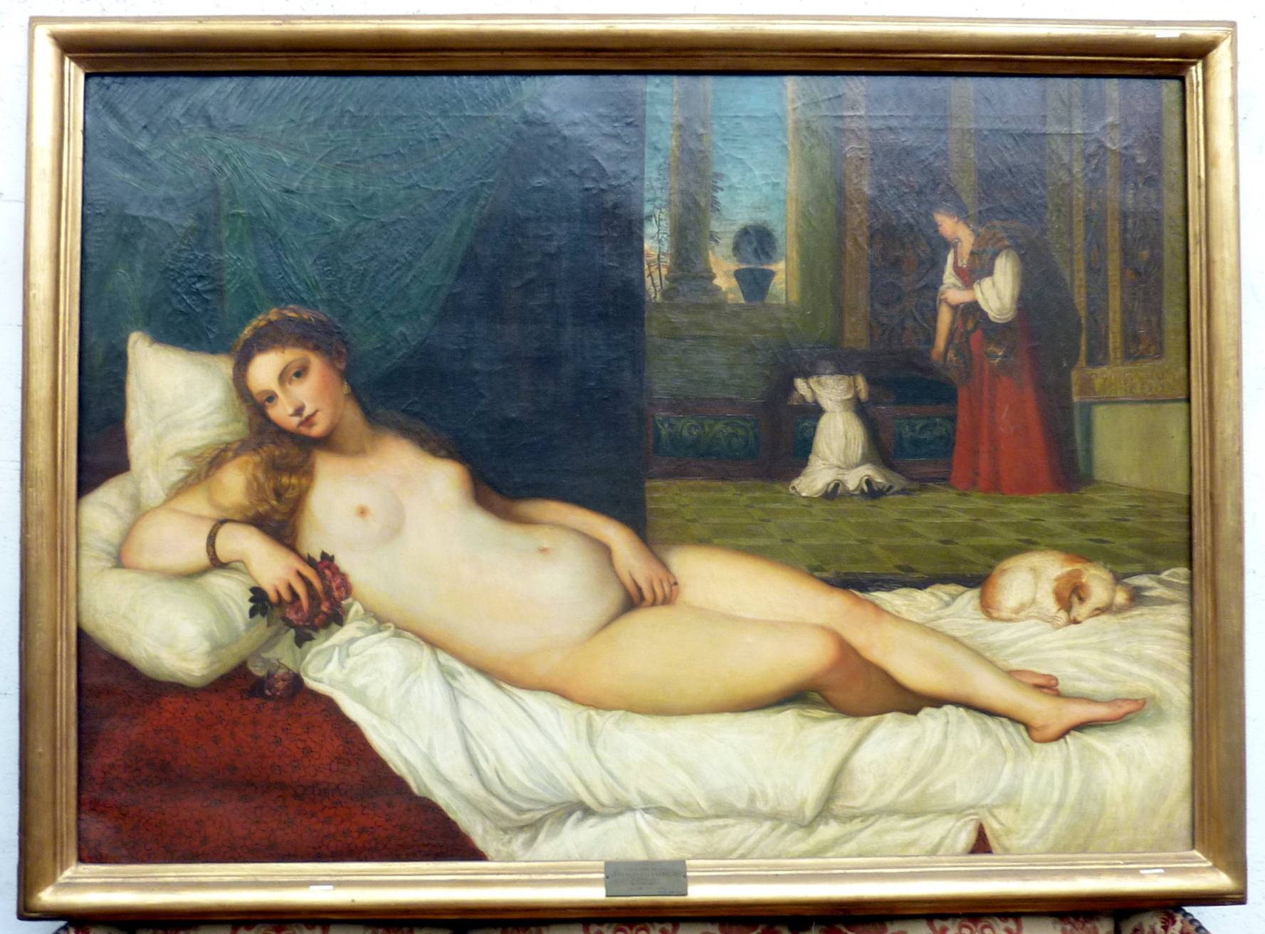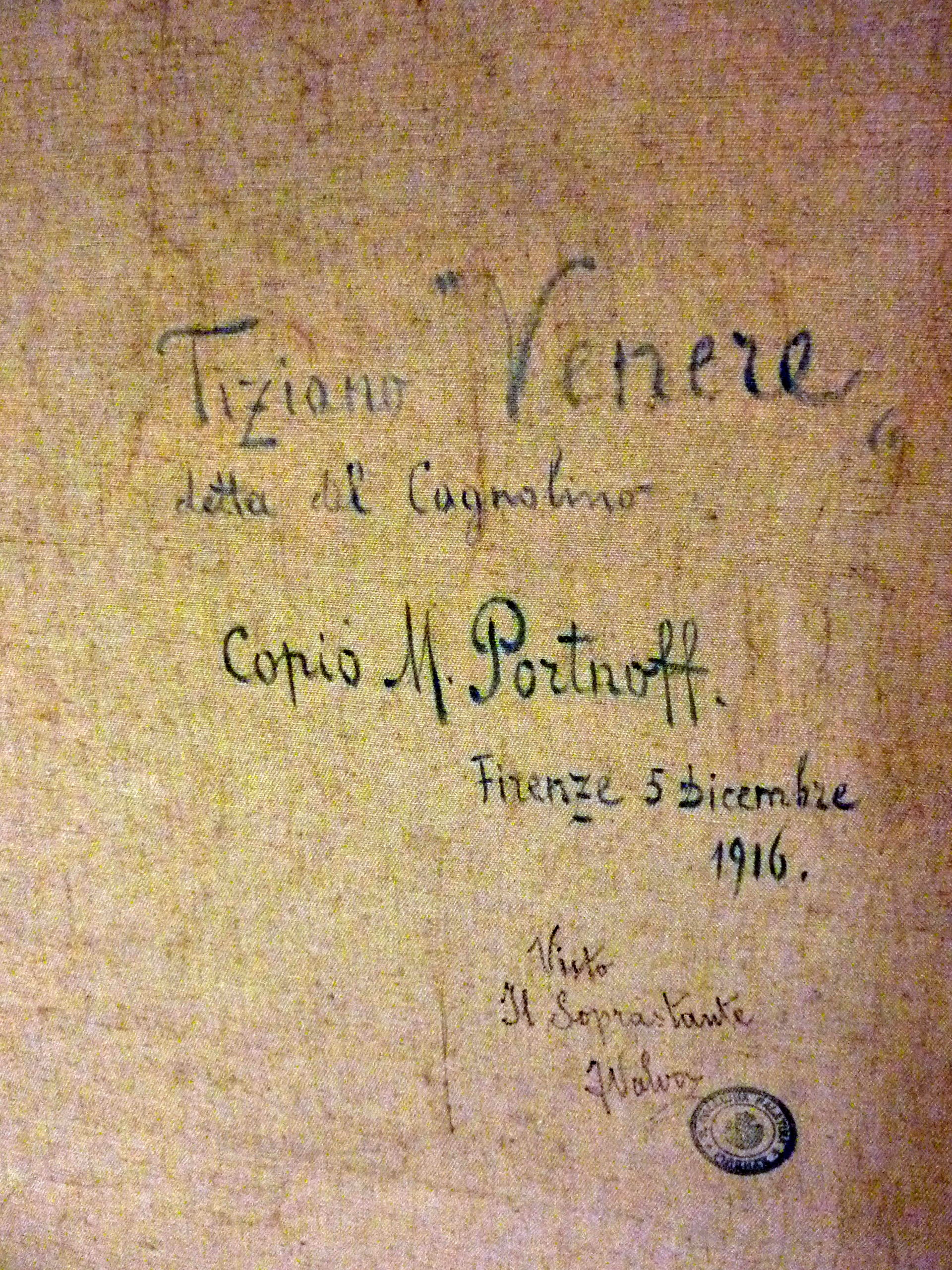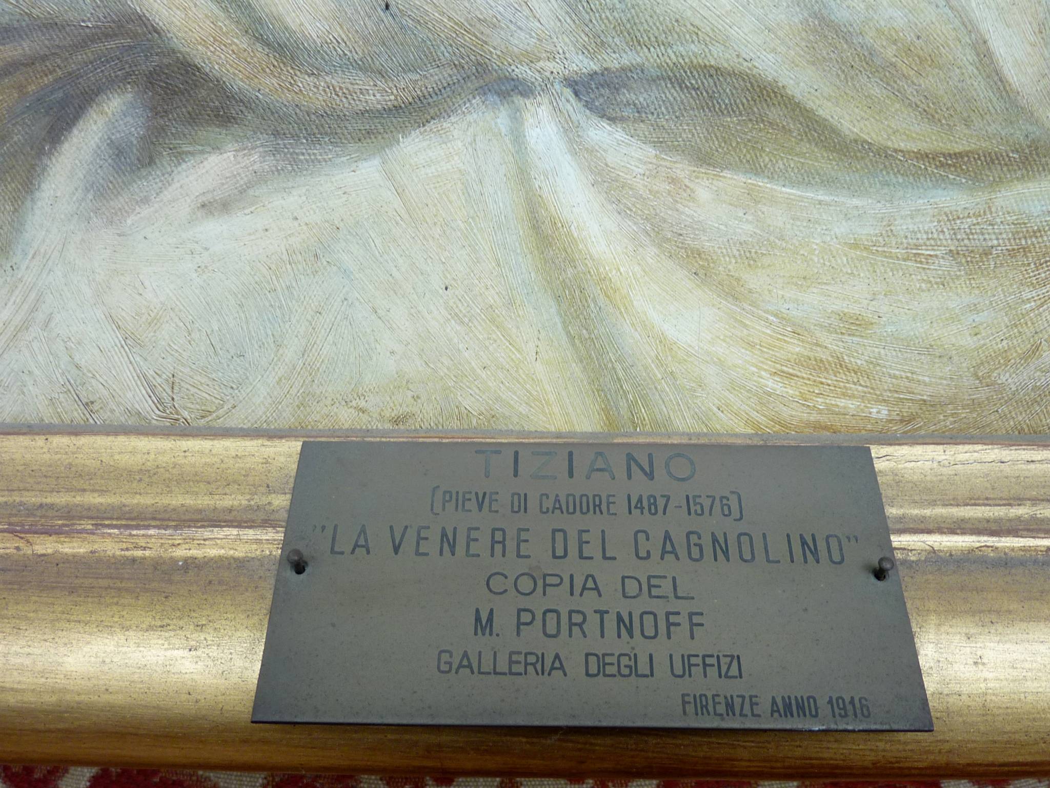 A large, oil on canvas painting faithfully representing Titian's famous "Venus of Urbino", of the same dimensions. This painting was entirely executed in the Palatina Gallery (in the Pitti Palace in Florence), while side-by-side to the original when it was displayed there, (it is now at the Ufizzi Gallery in Florence). Previously known as the "Venere del Cagnolino", (the Venus of the Little Dog), this is a much-studied Renaissance painting that is pivotal to the History of Renaissance Art. Titian completed Giorgione's unfinished "Venus" (a similarly-reclining nude), and was consequently commissioned by the Duke of Urbino to paint his young bride in the style of Giorgione's Venus. The painting was destined for the Duke's private chambers, and not for public viewing - hence the erotic undertones and many allegorical references to love and sex that this painting has. Signed by the painter M. Portnoff, in 1916 . The rear of the canvas has a signed annotation in Italian from the Director of the Palatina Gallery which reads, translated, "Witnessed by the Director", and it is stamped with the Palatina Gallery seal. Many painters have since referenced the original Titian painting, for example Manet's "Olympia", Goya's "La Maya Desnuda", and Gaugin's "The King's Wife".