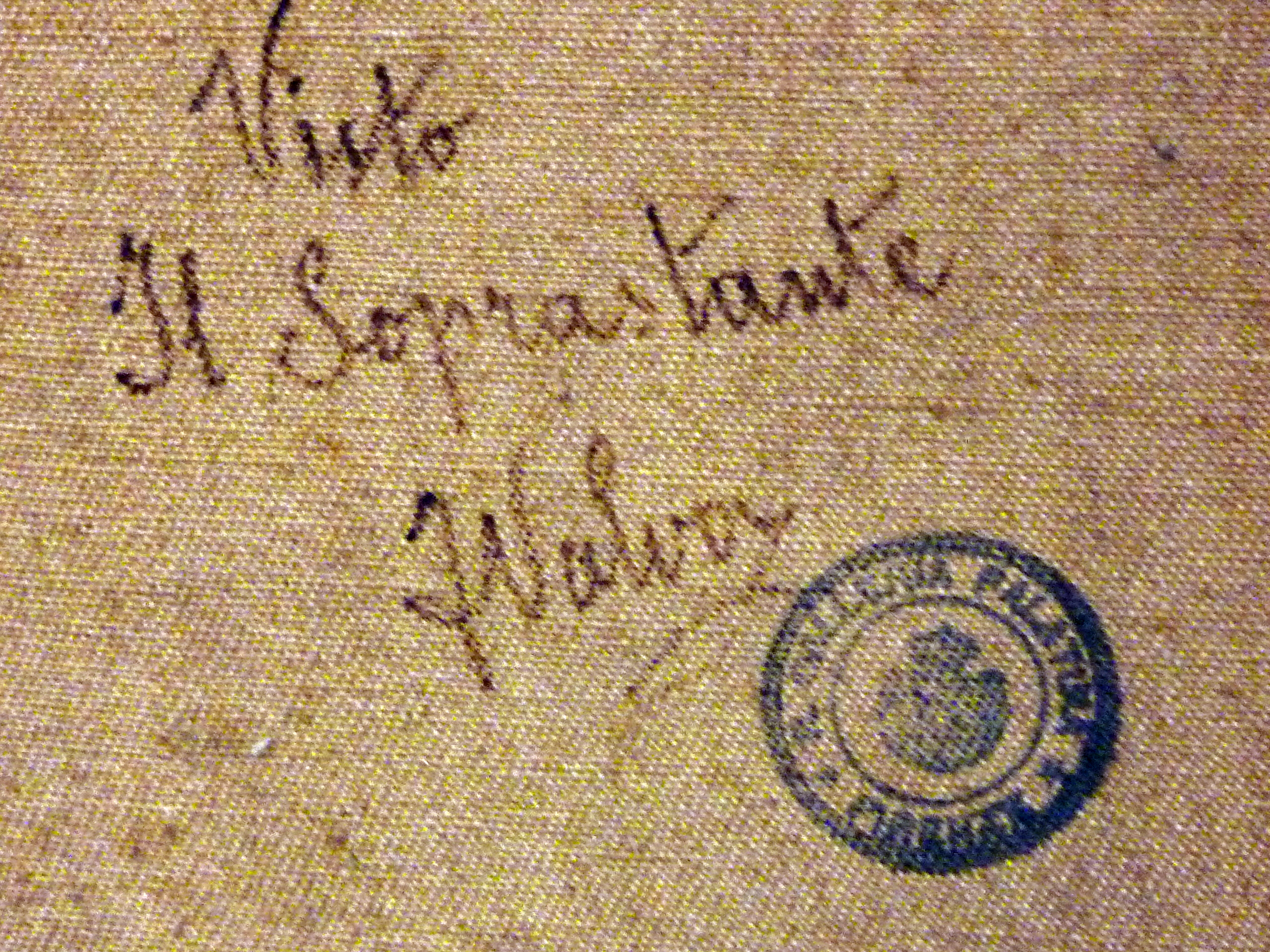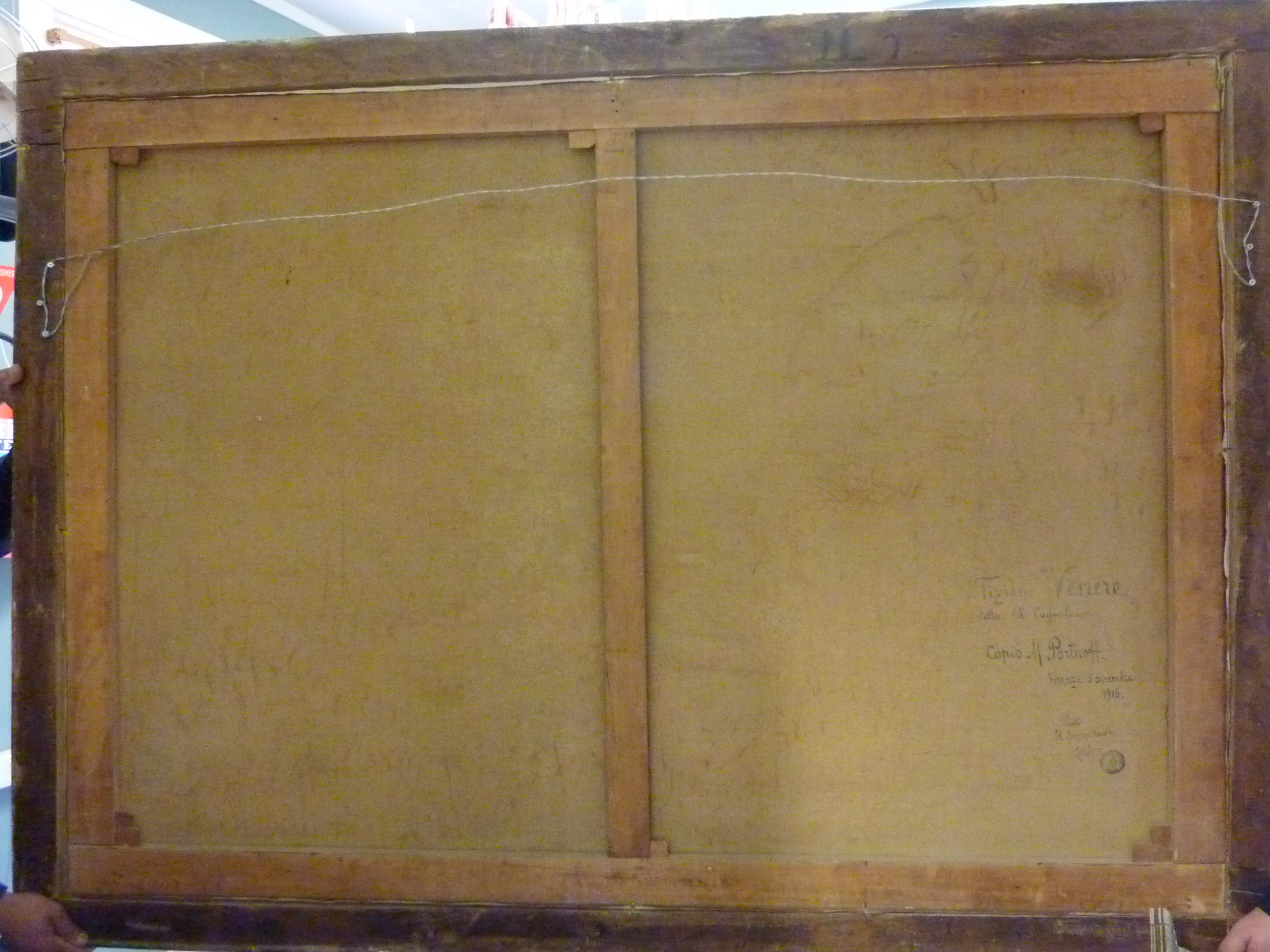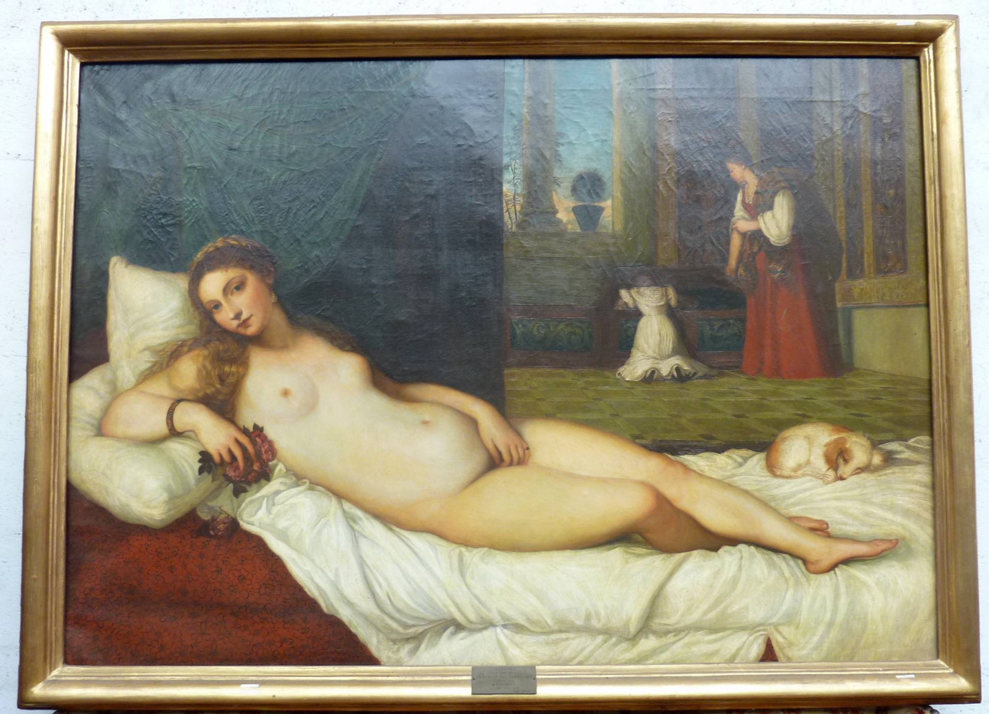 A large, oil on canvas painting faithfully representing Titian's famous "Venus of Urbino", of the same dimensions. This painting was entirely executed in the Palatina Gallery (in the Pitti Palace in Florence), while side-by-side to the original when it was displayed there, (it is now at the Ufizzi Gallery in Florence). Previously known as the "Venere del Cagnolino", (the Venus of the Little Dog), this is a much-studied Renaissance painting that is pivotal to the History of Renaissance Art. Titian completed Giorgione's unfinished "Venus" (a similarly-reclining nude), and was consequently commissioned by the Duke of Urbino to paint his young bride in the style of Giorgione's Venus. The painting was destined for the Duke's private chambers, and not for public viewing - hence the erotic undertones and many allegorical references to love and sex that this painting has. Signed by the painter M. Portnoff, in 1916 . The rear of the canvas has a signed annotation in Italian from the Director of the Palatina Gallery which reads, translated, "Witnessed by the Director", and it is stamped with the Palatina Gallery seal. Many painters have since referenced the original Titian painting, for example Manet's "Olympia", Goya's "La Maya Desnuda", and Gaugin's "The King's Wife".