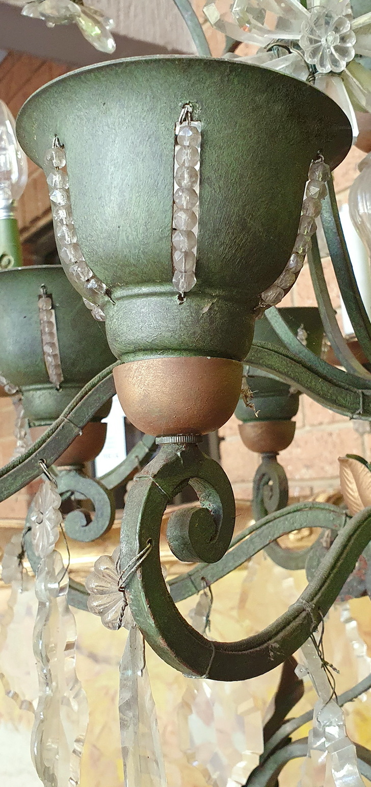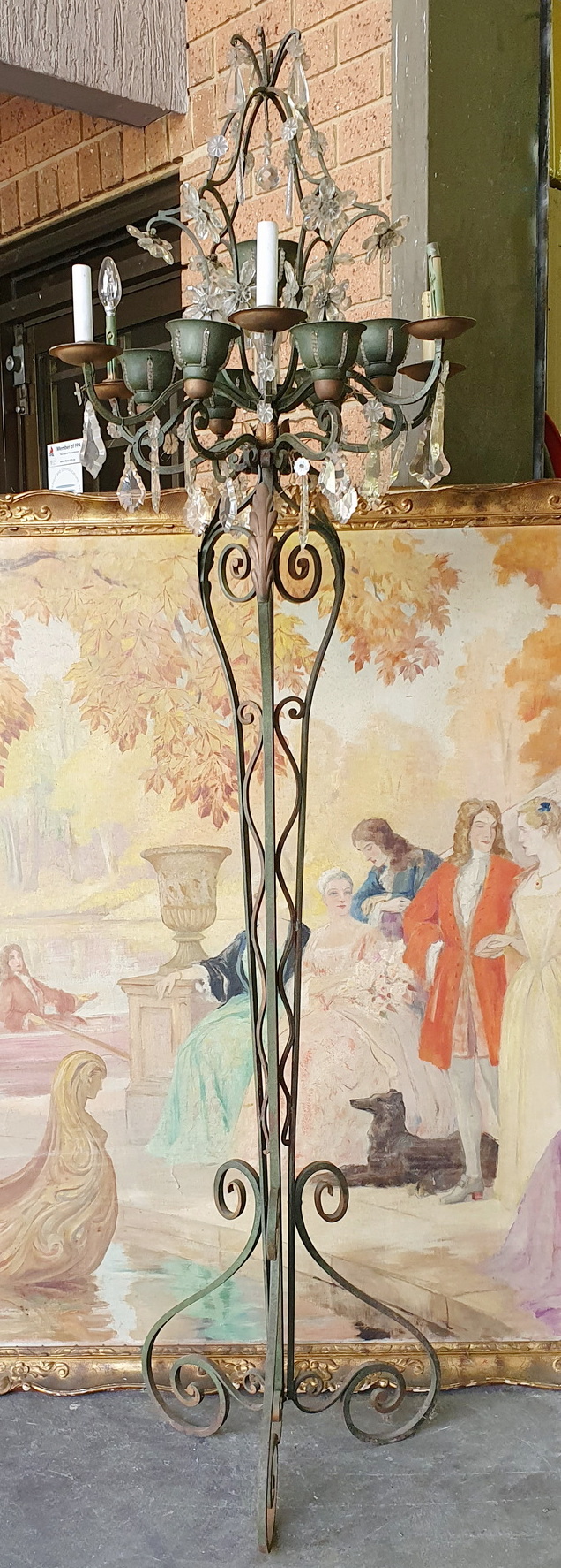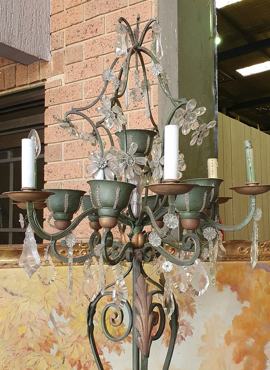 A French Art Deco period, 'Maison Bagues' design, painted wrought iron and crystal Standard light, the top of the light fitted with twelve lights, six external with candle-sleeves, six internal and fitted inside 'cups'. The wrought iron light is interspersed with crystal drops that are arranged into flower-shapes - a central 'rosette' crystal surrounded by 'petal' crystals. Please note that the six internal lights in the 'cups' shine through slots , which are covered with threaded crystal beads. Standing on a well-wrought and tall wrought iron scrollwork stand decorated with Art Deco geometric motifs. Area of Paris, circa 1930.