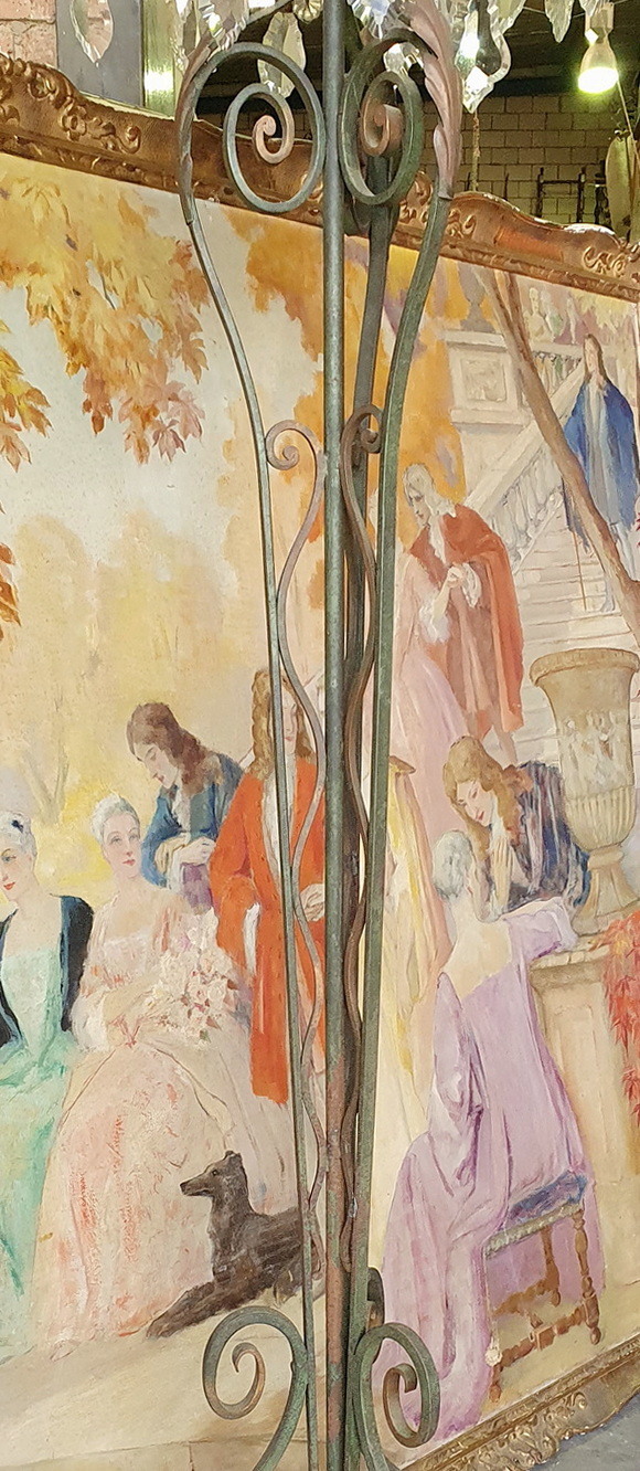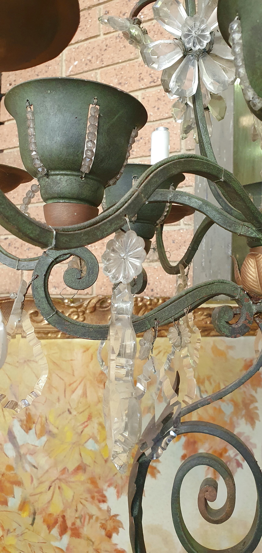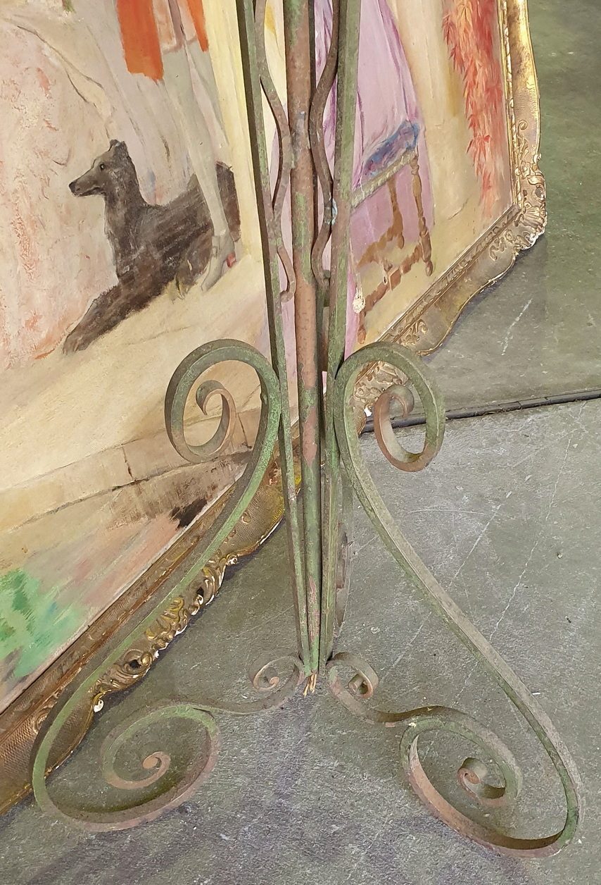 A French Art Deco period, 'Maison Bagues' design, painted wrought iron and crystal Standard light, the top of the light fitted with twelve lights, six external with candle-sleeves, six internal and fitted inside 'cups'. The wrought iron light is interspersed with crystal drops that are arranged into flower-shapes - a central 'rosette' crystal surrounded by 'petal' crystals. Please note that the six internal lights in the 'cups' shine through slots , which are covered with threaded crystal beads. Standing on a well-wrought and tall wrought iron scrollwork stand decorated with Art Deco geometric motifs. Area of Paris, circa 1930.