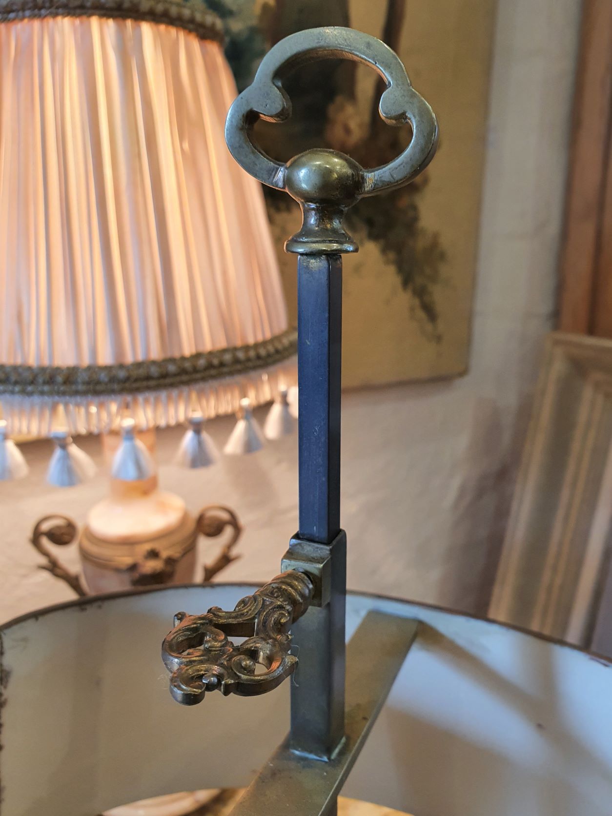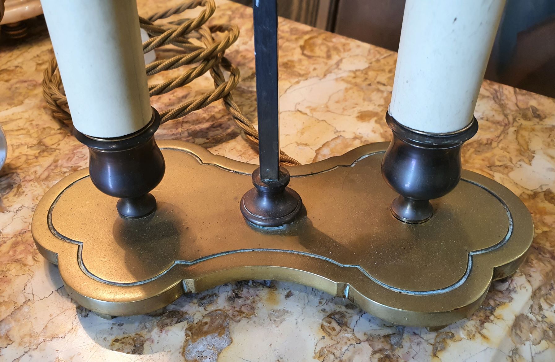 A fine and small-sized, French two-light Bouillotte lamp with its original adjustable-height, red-painted tole shade. Complete and in good condition, this light was originally made for candles, and was electrified in the early 20th century. Area of Paris, circa 1900.