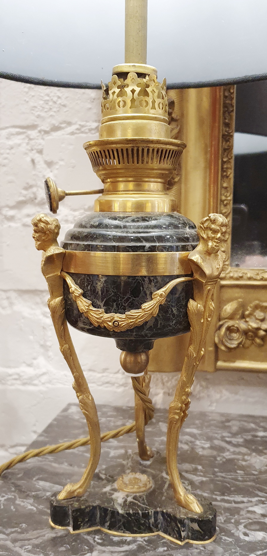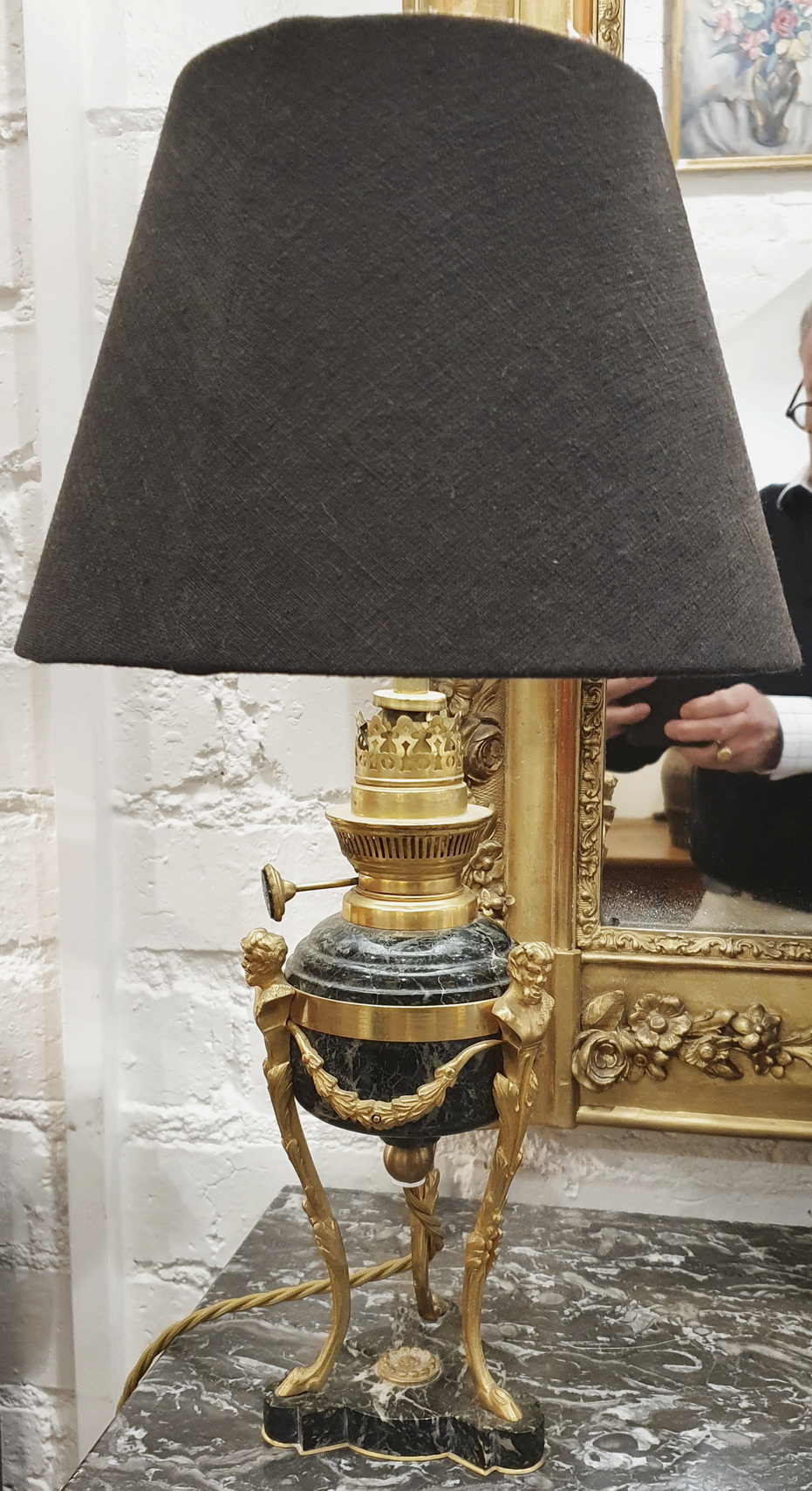 An early 20th century French Empire style, finely cast, chased and gilt brass, Classic Roman urn shaped table light, standing on a turned Gris Saint Anne marble and a tripod pedestal plinth, decorated with caryatids. Fitted with simple, a dark grey linen shade which highlights the fine metalwork of the base. Area of Paris, circa 1930.