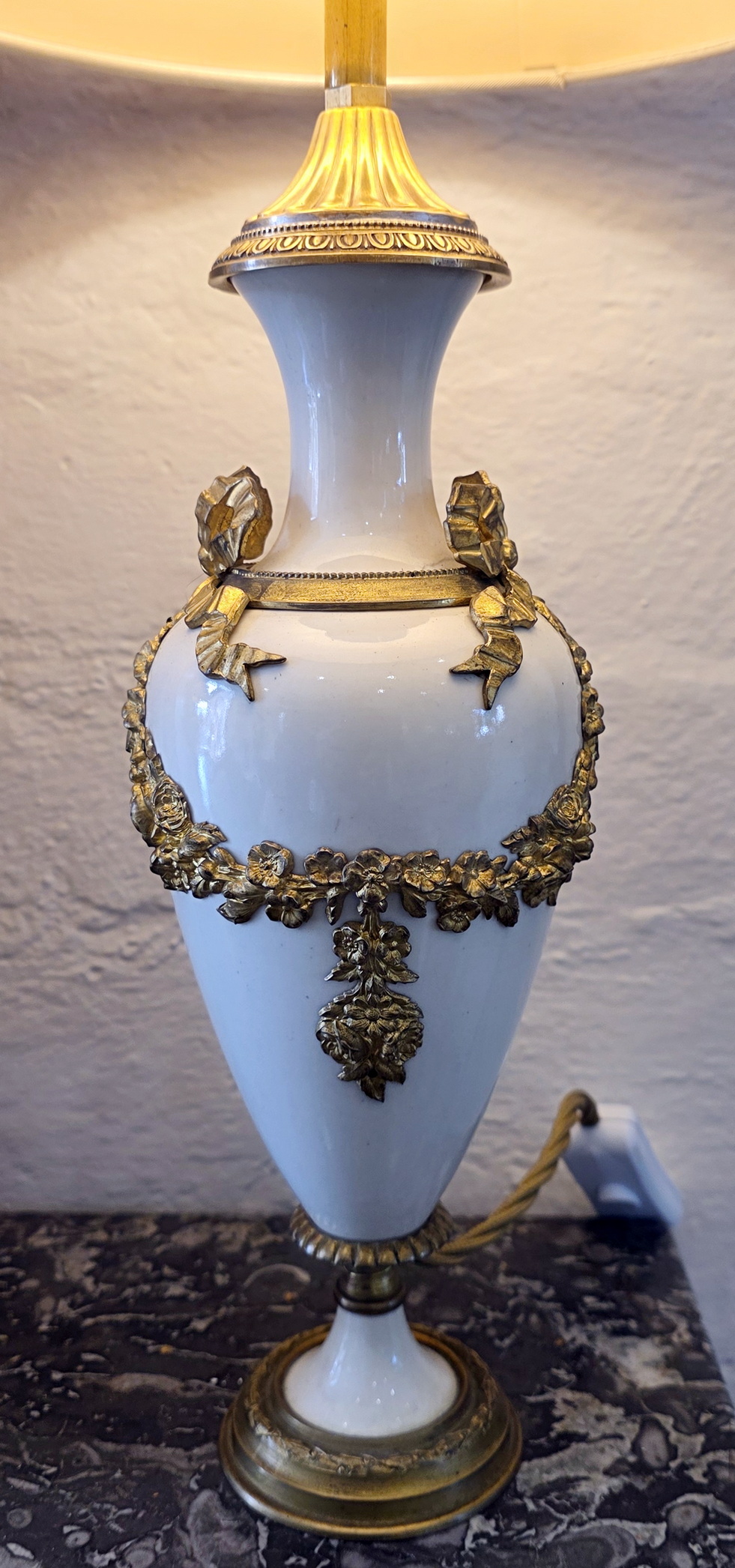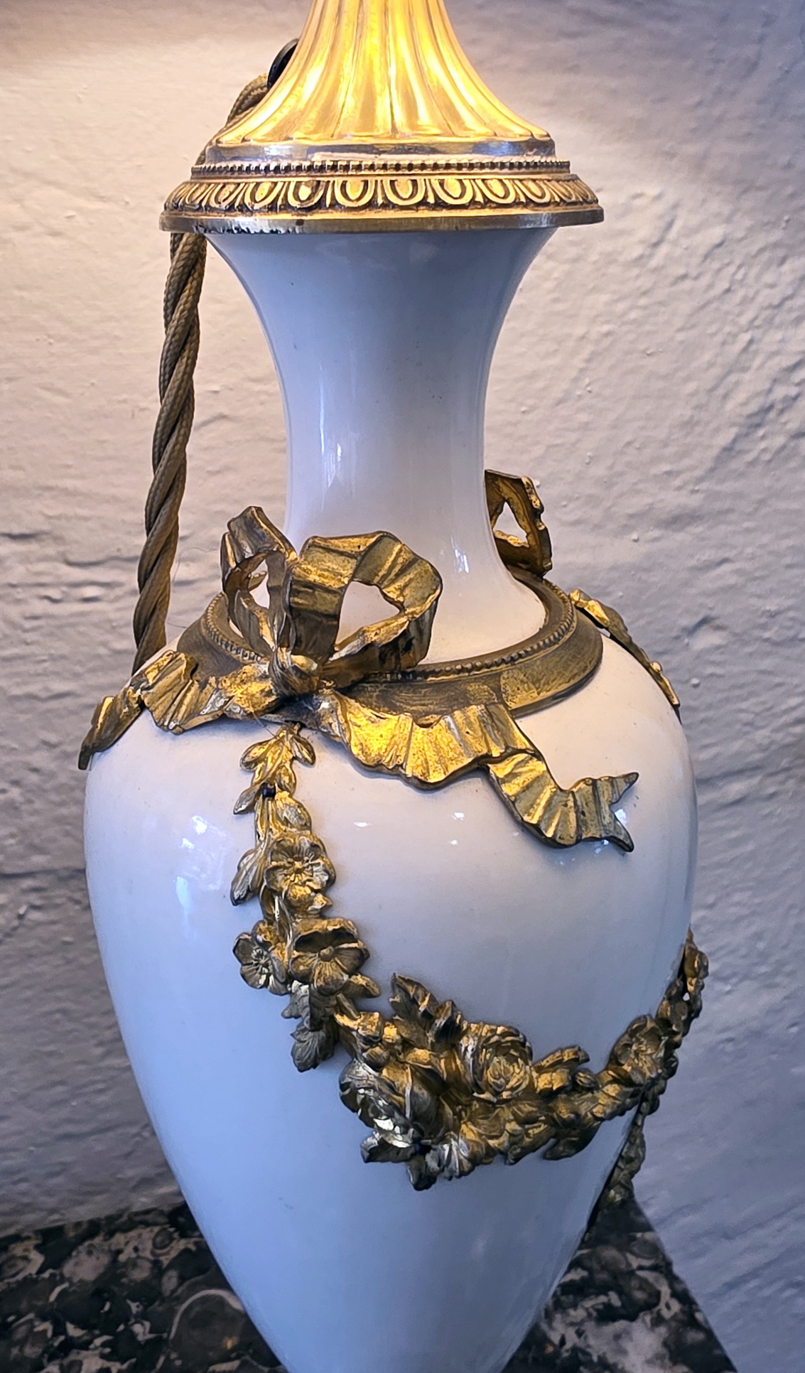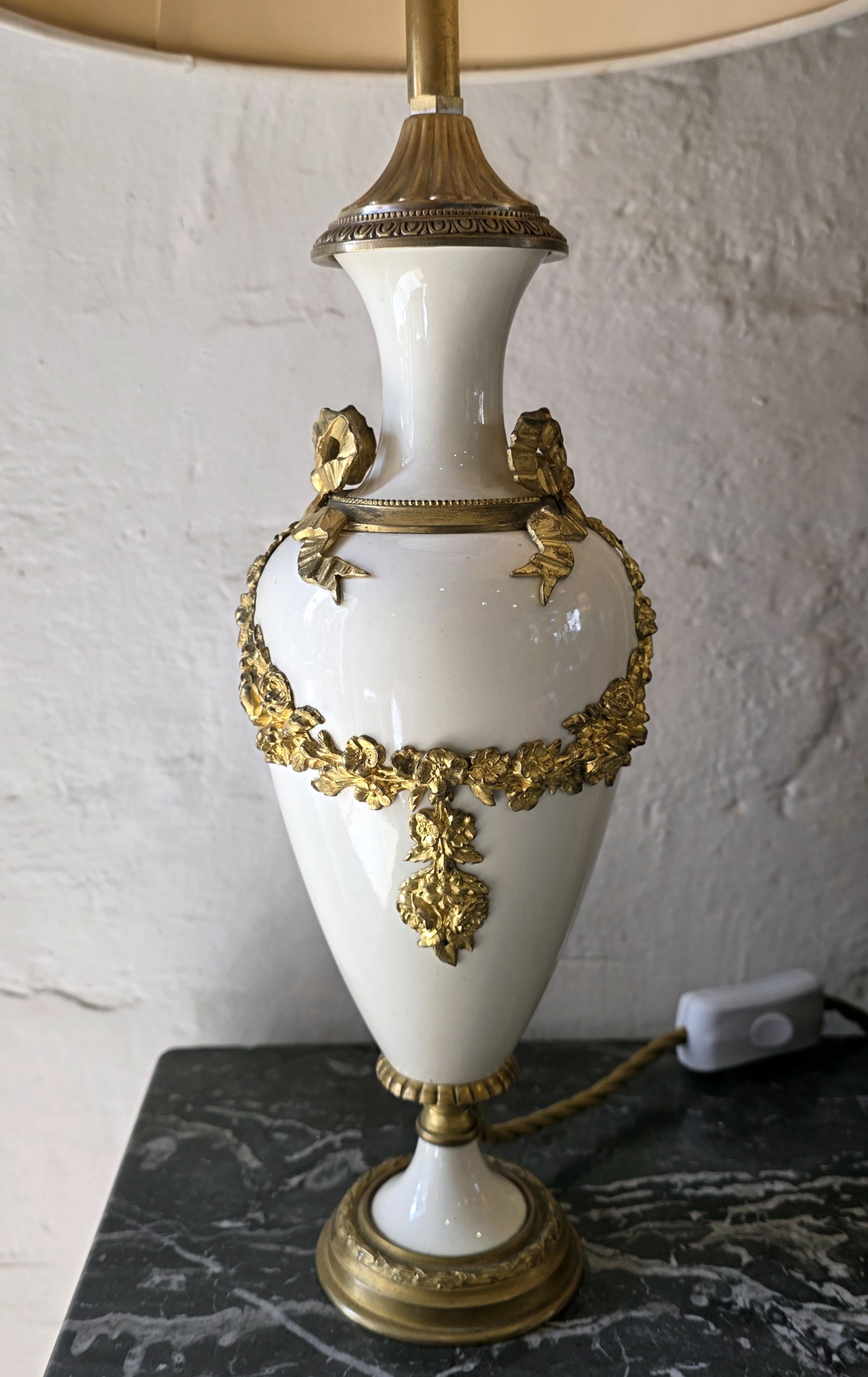 A pair of 19th century French Louis XVI style, finely cast, chased and gilt bronze and turned marble 'Cassolette' urns, later made into table lamps and fitted with silk lampshades. Area of Paris, circa 1870.