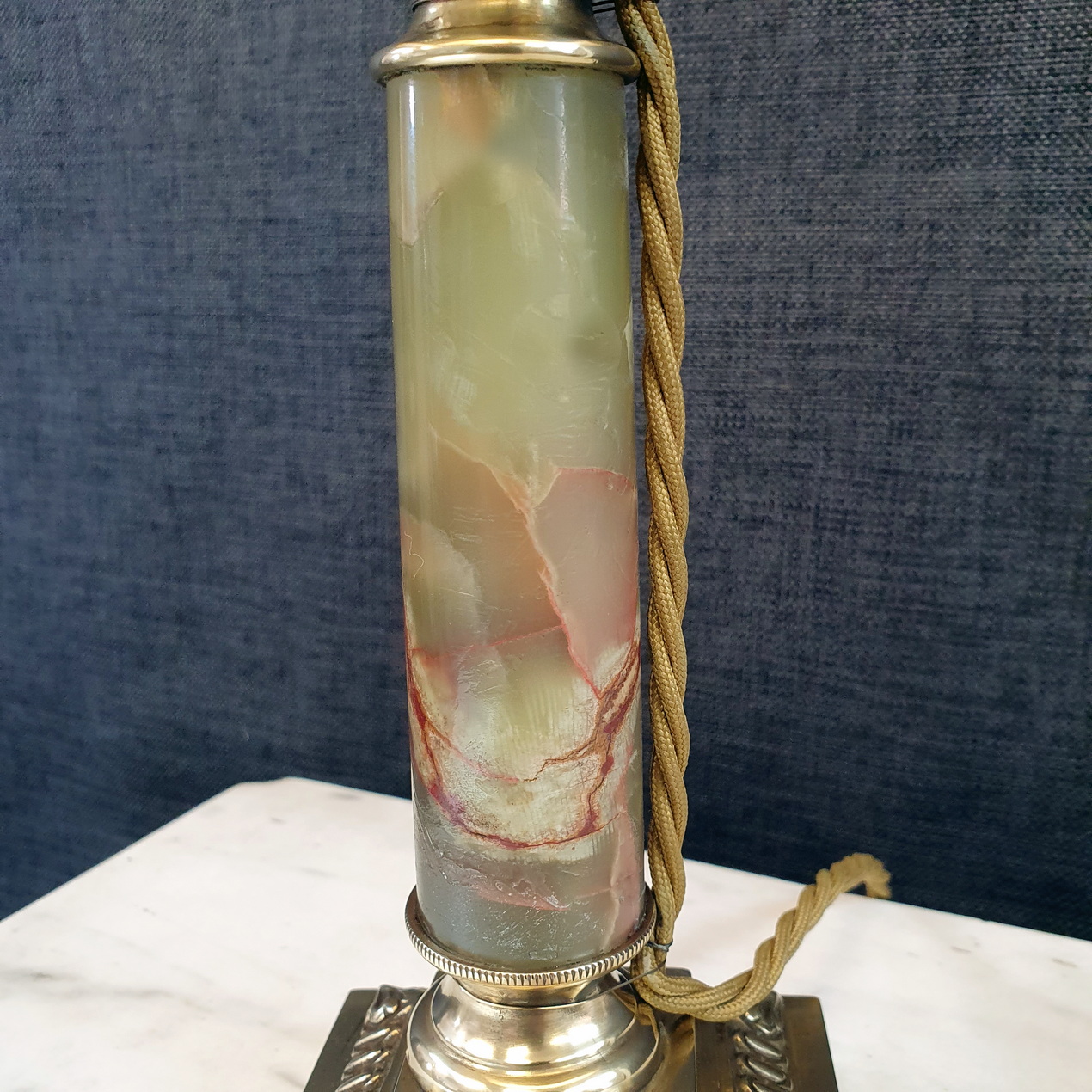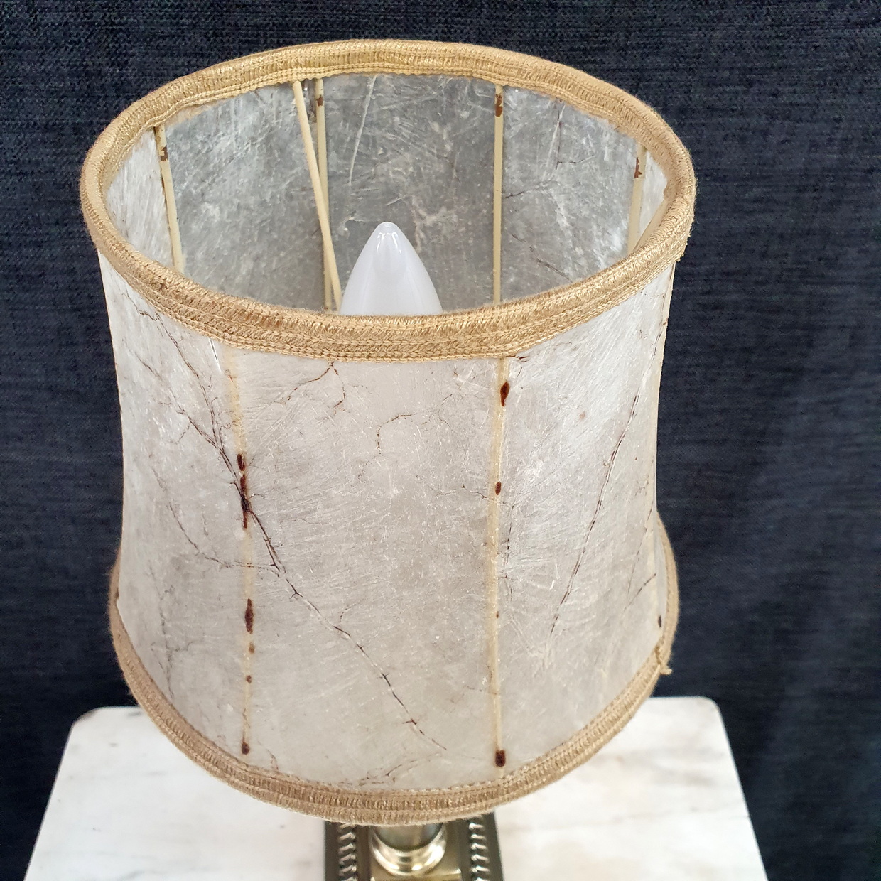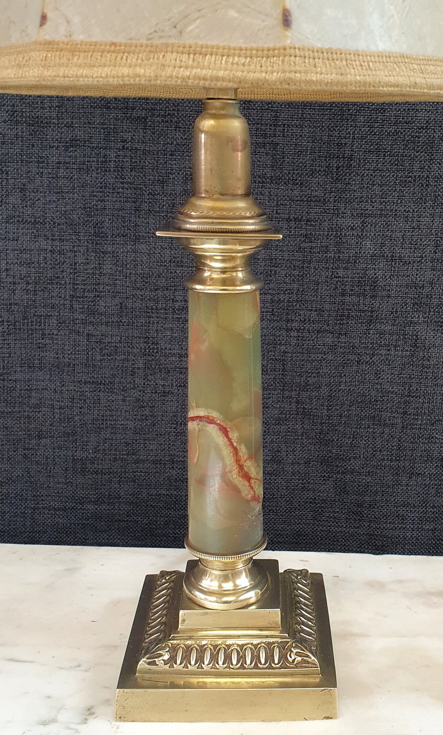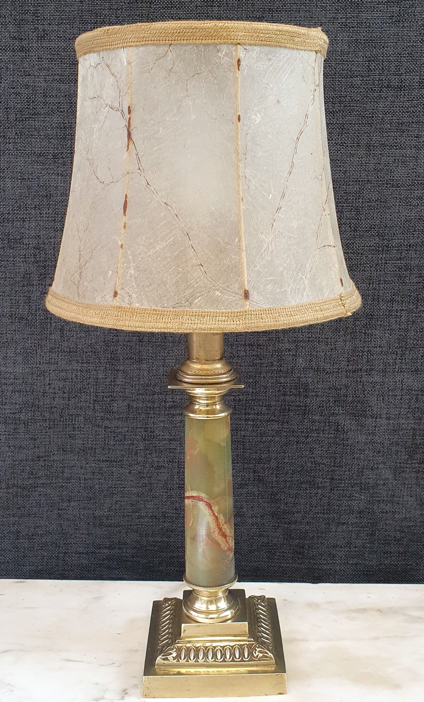 An early 20th century French turned alabaster and finely cast brass table lamp in the shape of a Doric pilaster, standing on a square-section plinth. Fitted with a period parchment lampshade. Area of Paris, circa 1930.