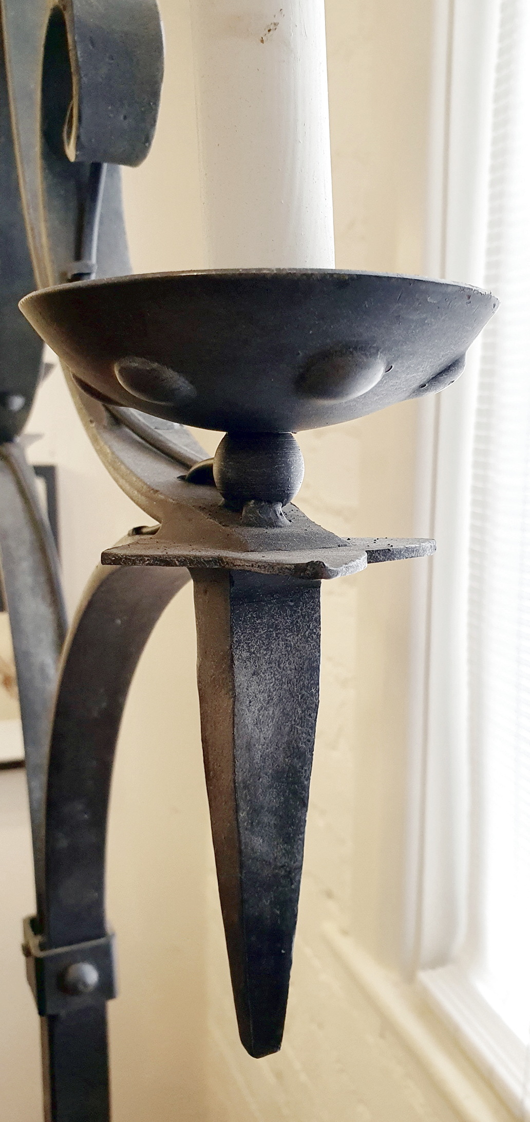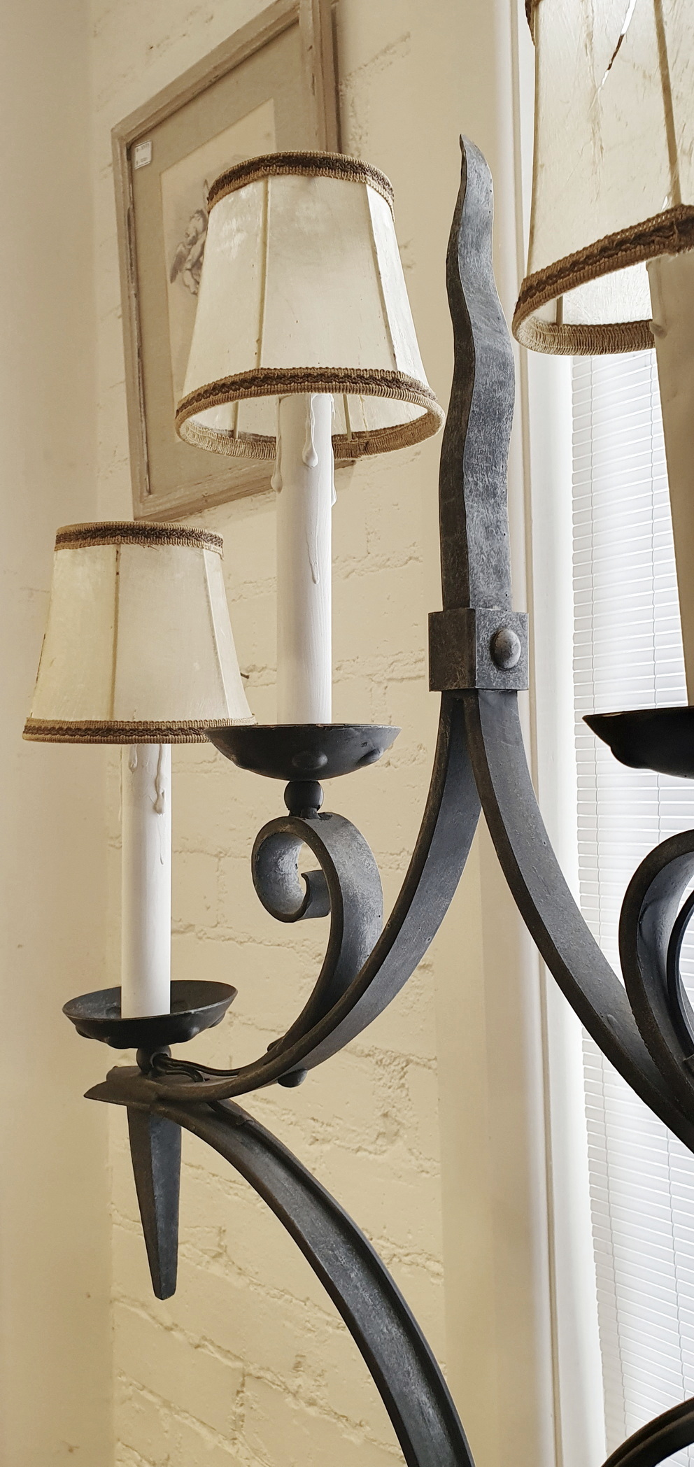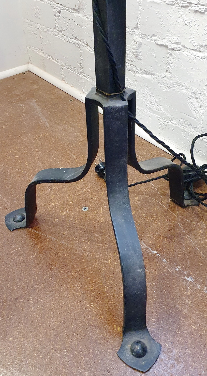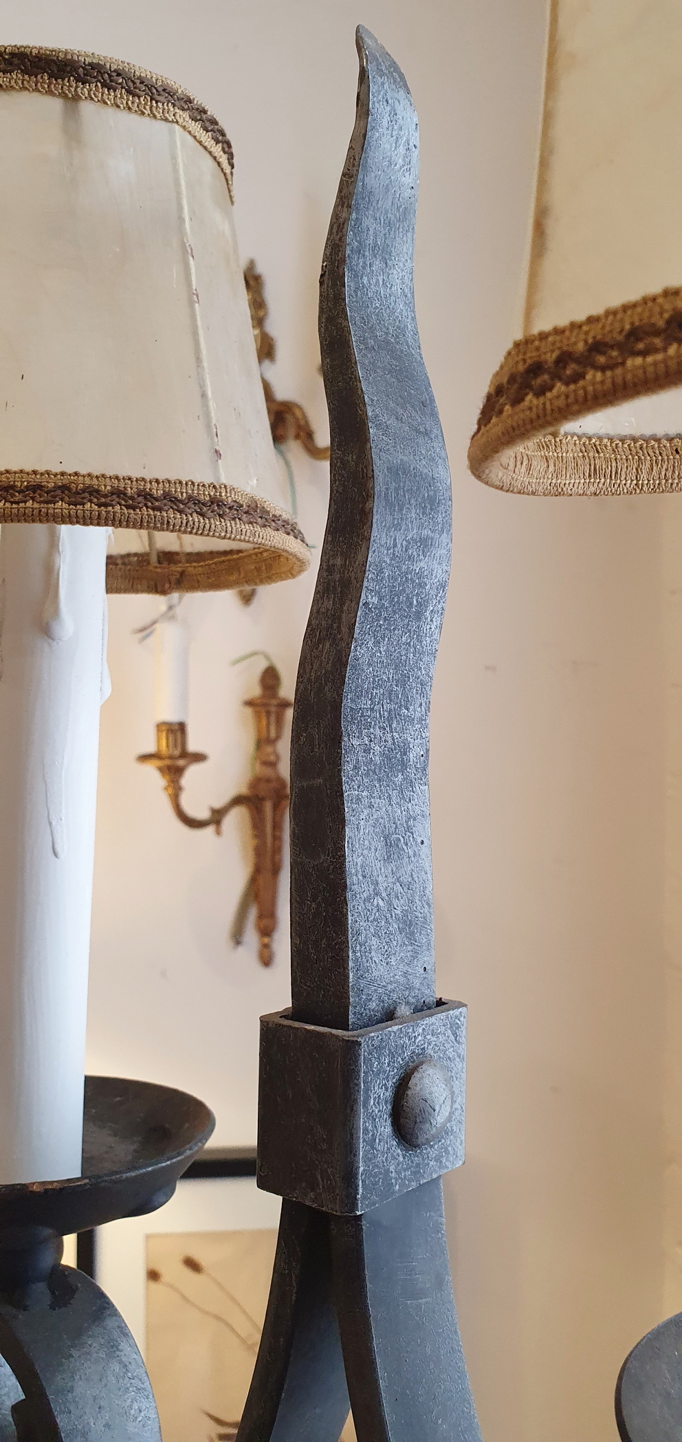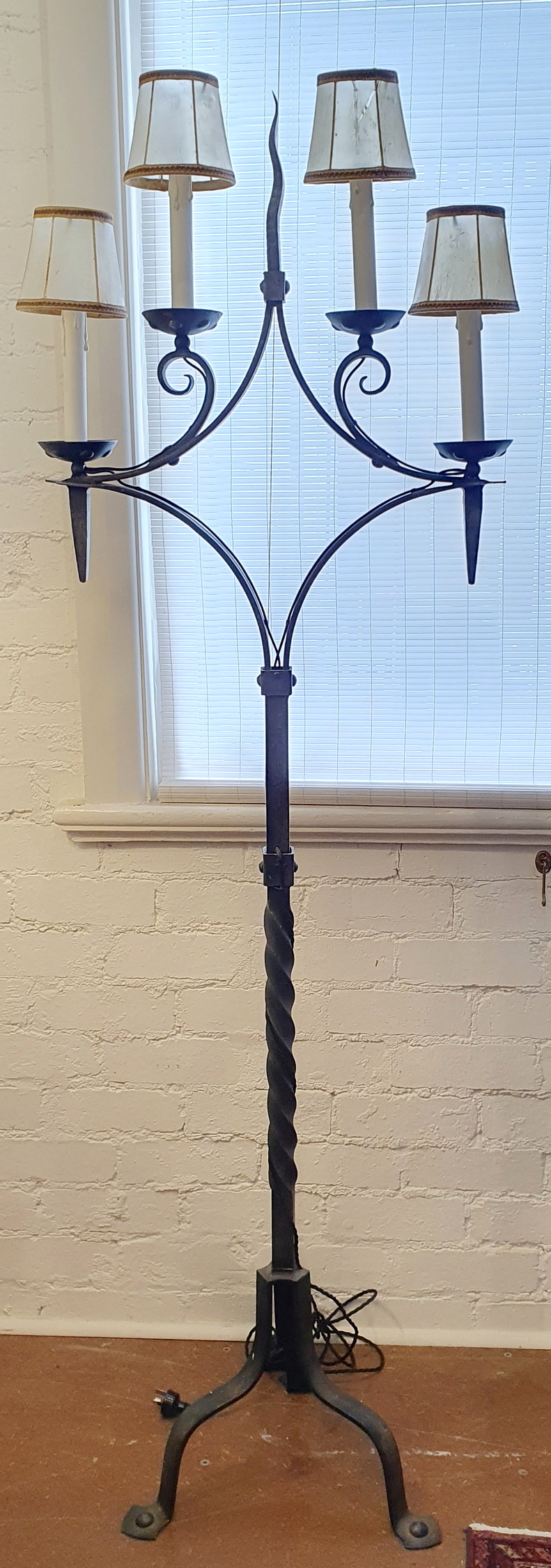 A 19th French Gothic style Candelabrum Standard light, the well-wrought iron tripod base with a twist-turned shaft, the top fitted with four 'torchere' lights and a central, shaped 'epi' spike. Fitted with period parchment lampshades. Area of Isle de France (Greater Paris), circa 1880.