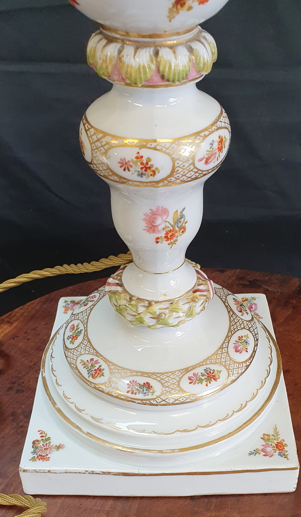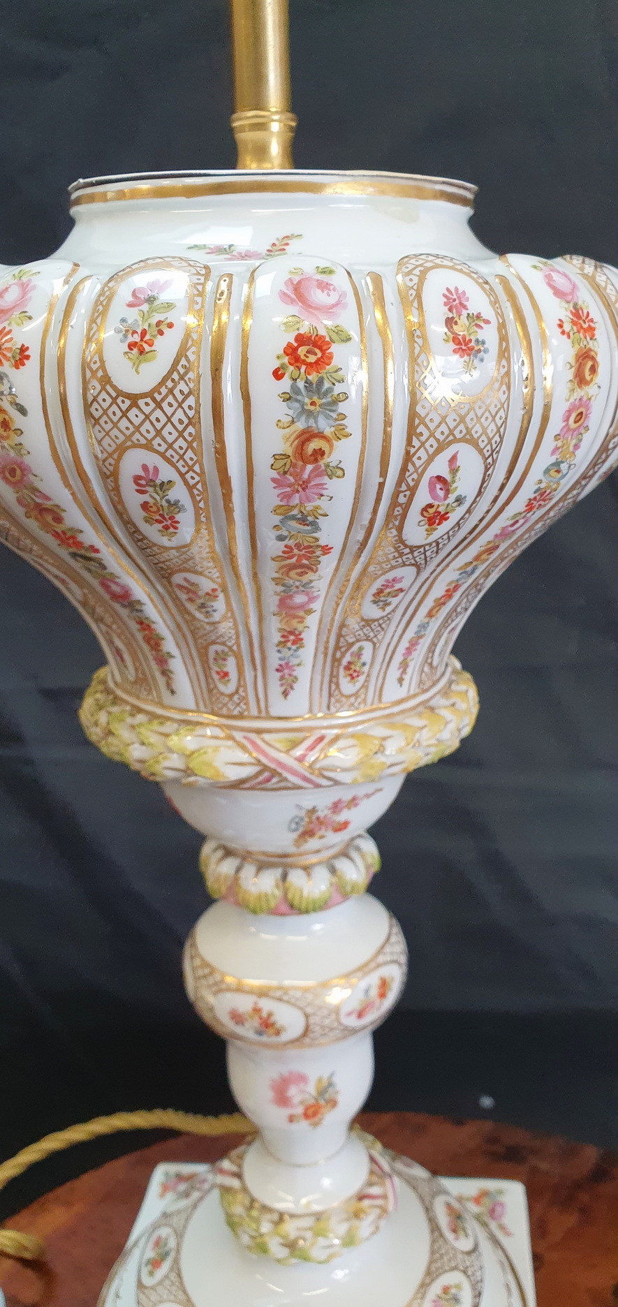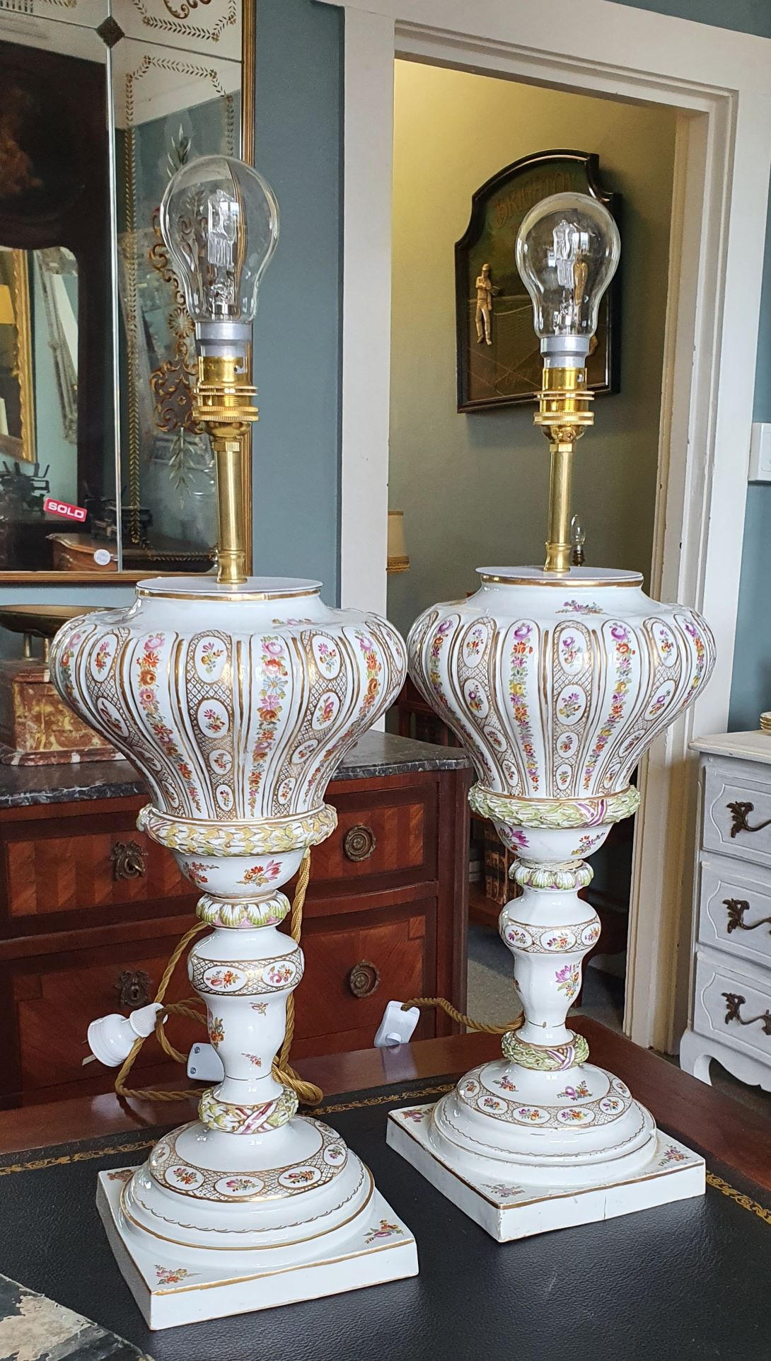 A magnificent pair of 19th century Meissen porcelain baluster-shaped "bottle" vases finely decorated with trellises of flowers and flower-motif cameos, framed by gilt trellises and borders, against a white background. Later sympathetically electrified. The undersides with the Meissen 'crossed-swords' hallmark. Area of Dresden, circa 1870. This pair of silk handmade Parisian lampshades are included in the price.