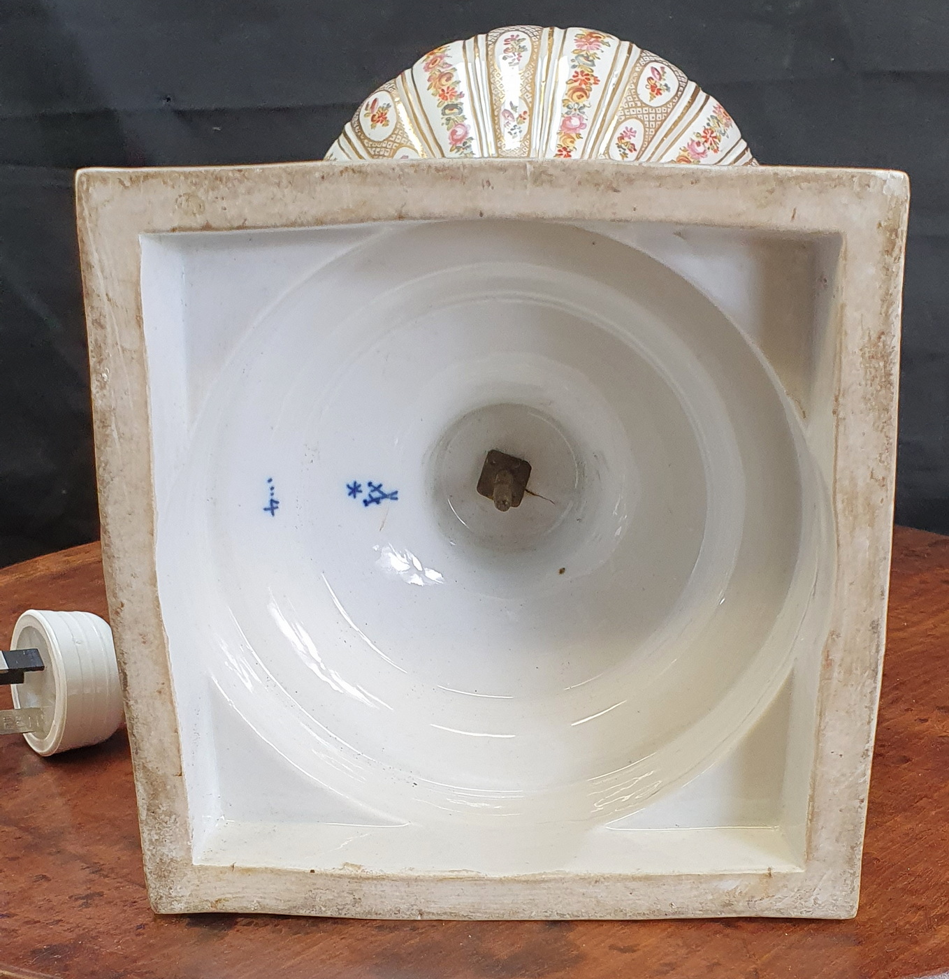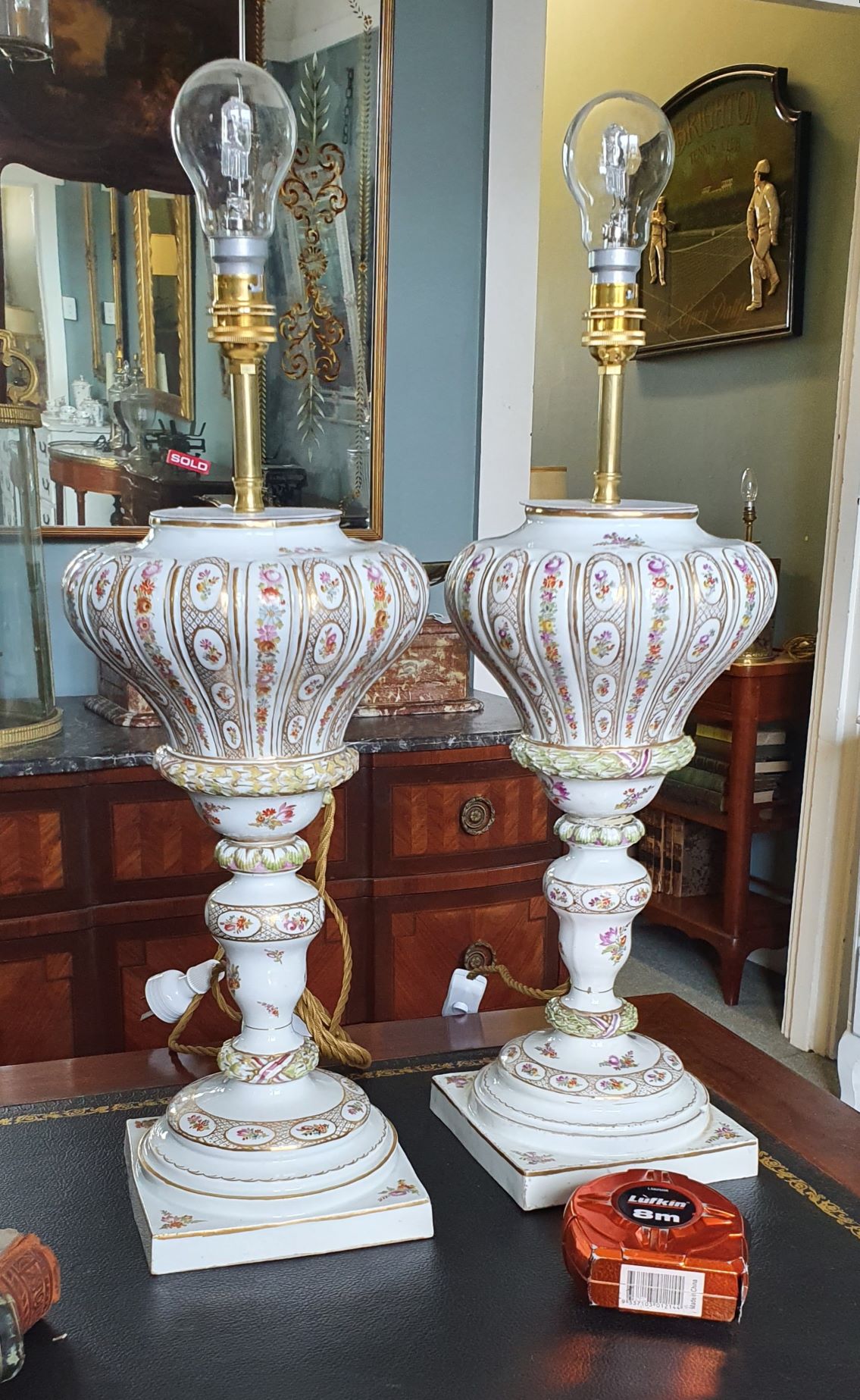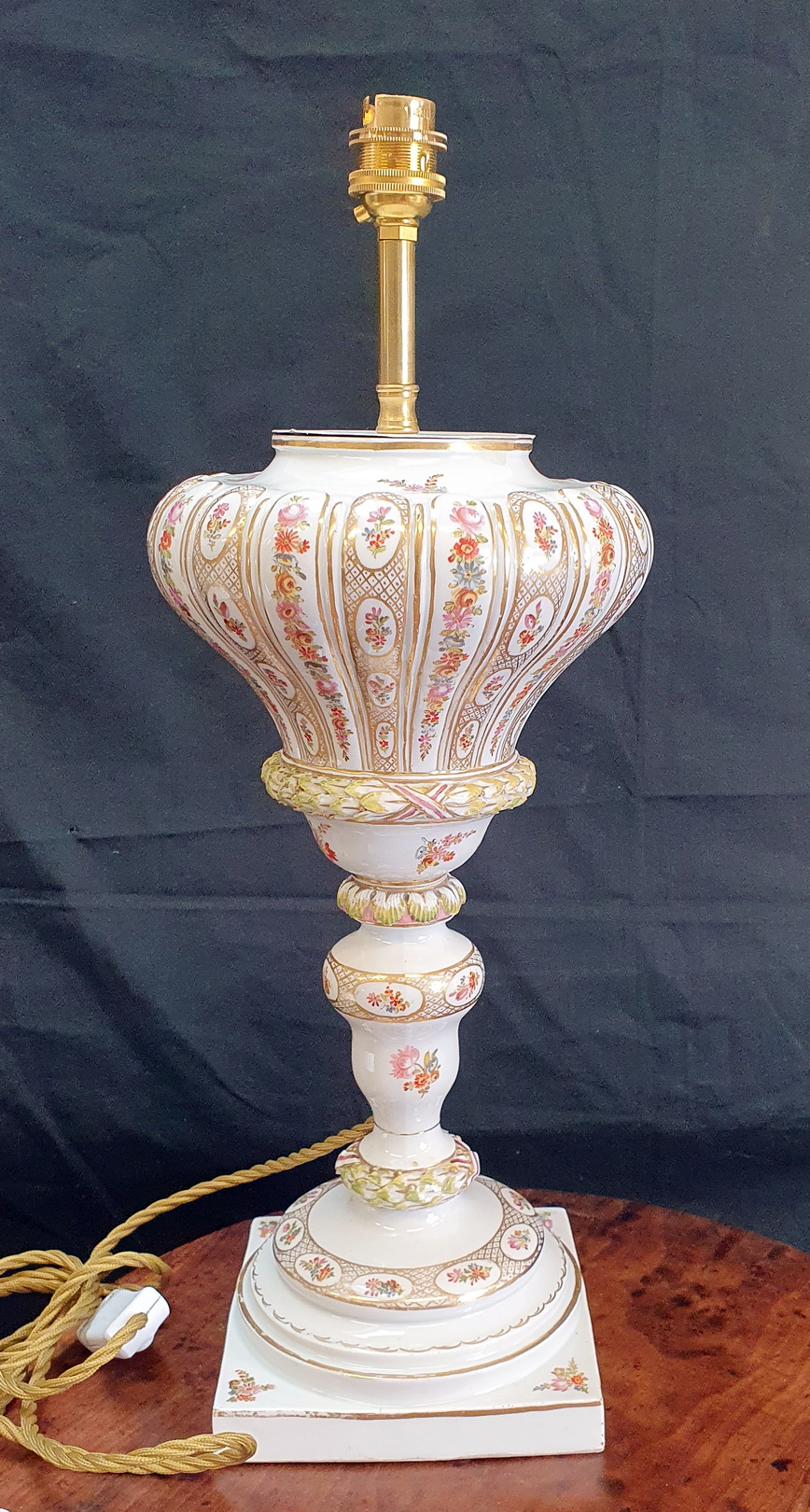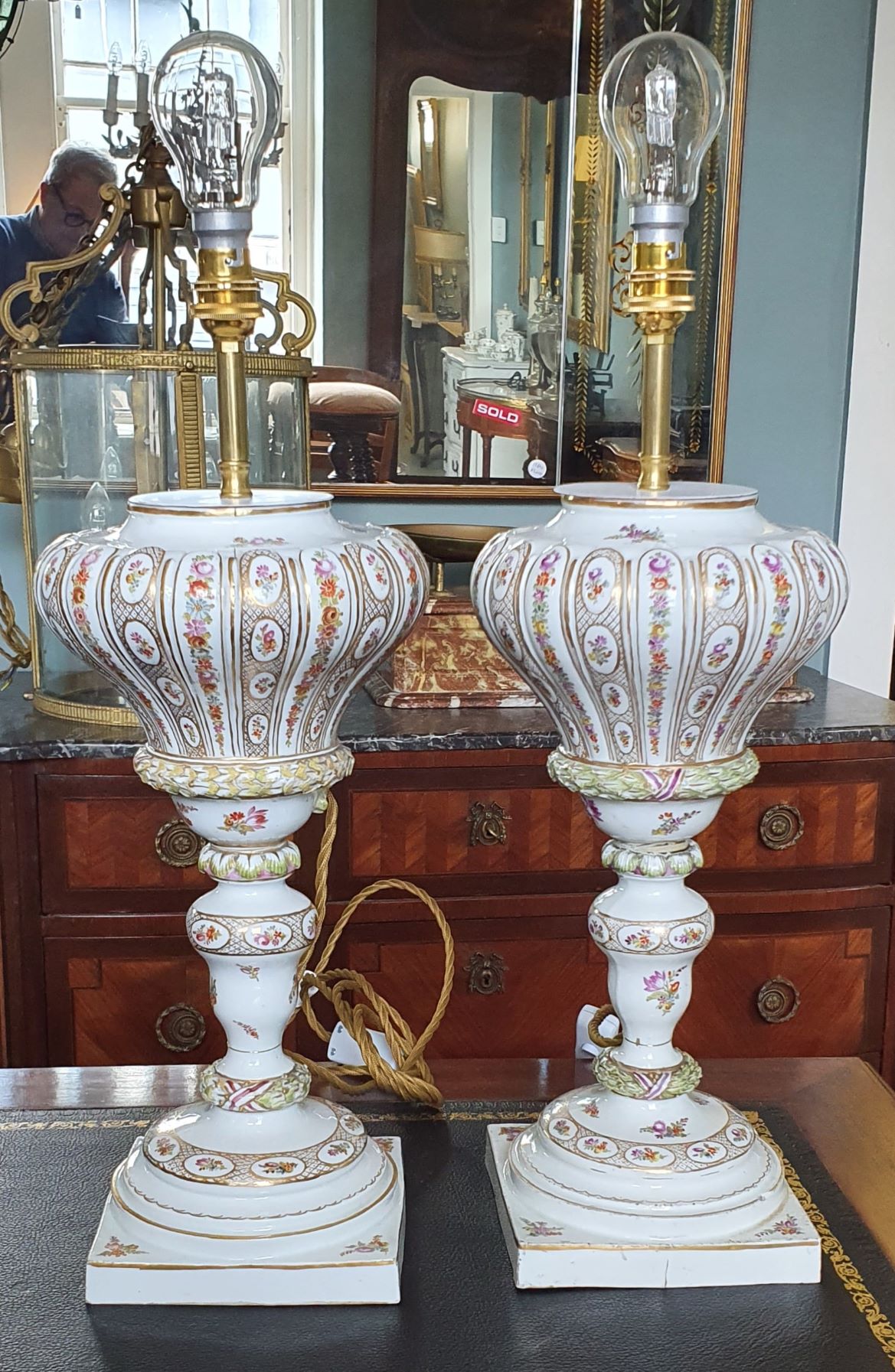 A magnificent pair of 19th century Meissen porcelain baluster-shaped "bottle" vases finely decorated with trellises of flowers and flower-motif cameos, framed by gilt trellises and borders, against a white background. Later sympathetically electrified. The undersides with the Meissen 'crossed-swords' hallmark. Area of Dresden, circa 1870. This pair of silk handmade Parisian lampshades are included in the price.