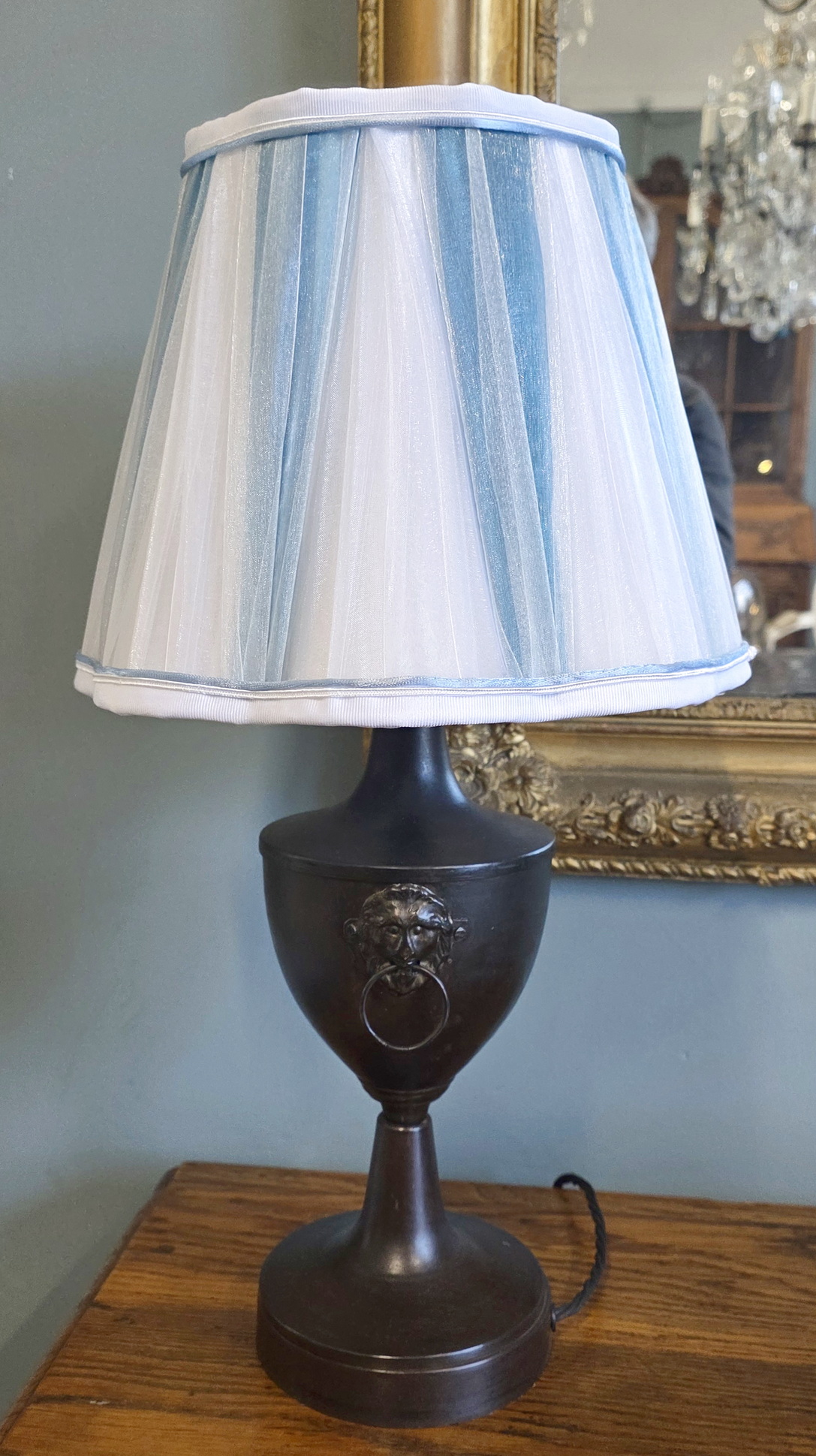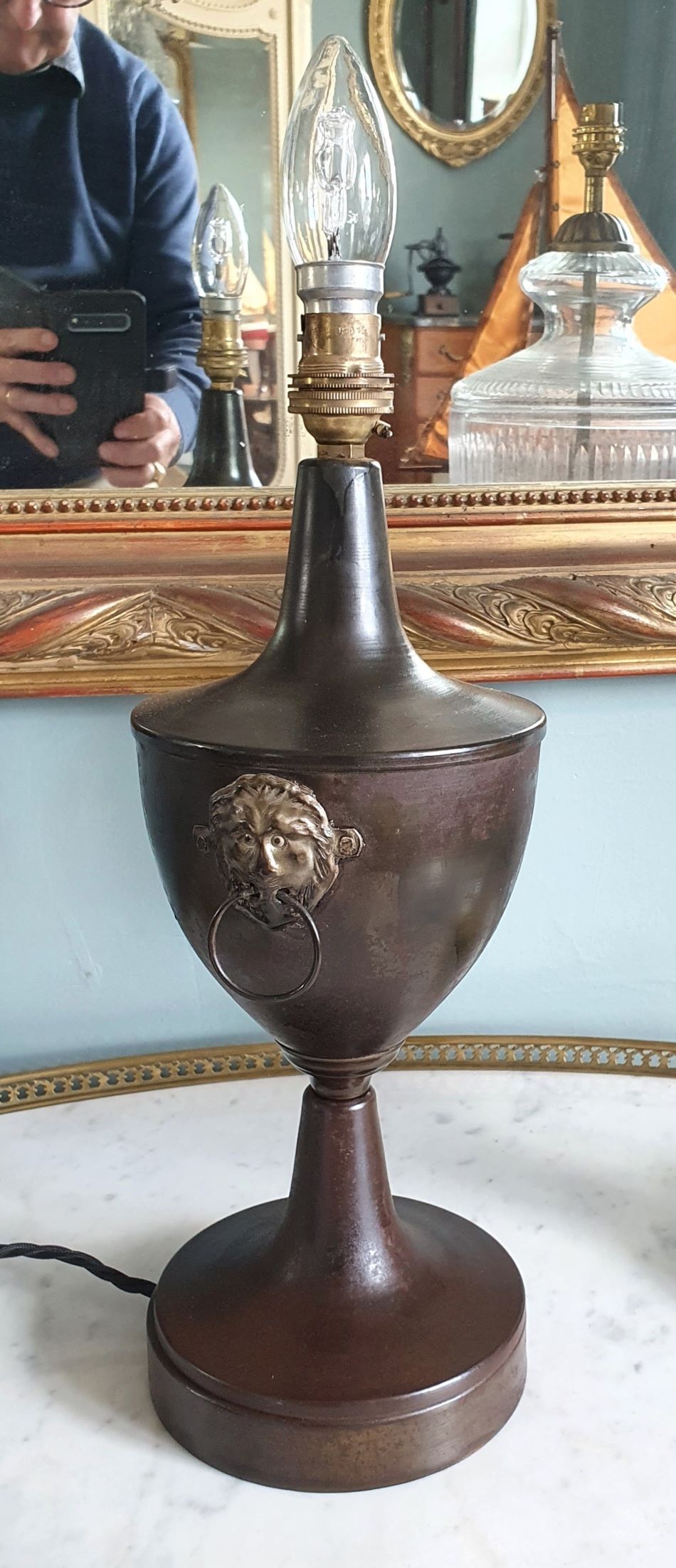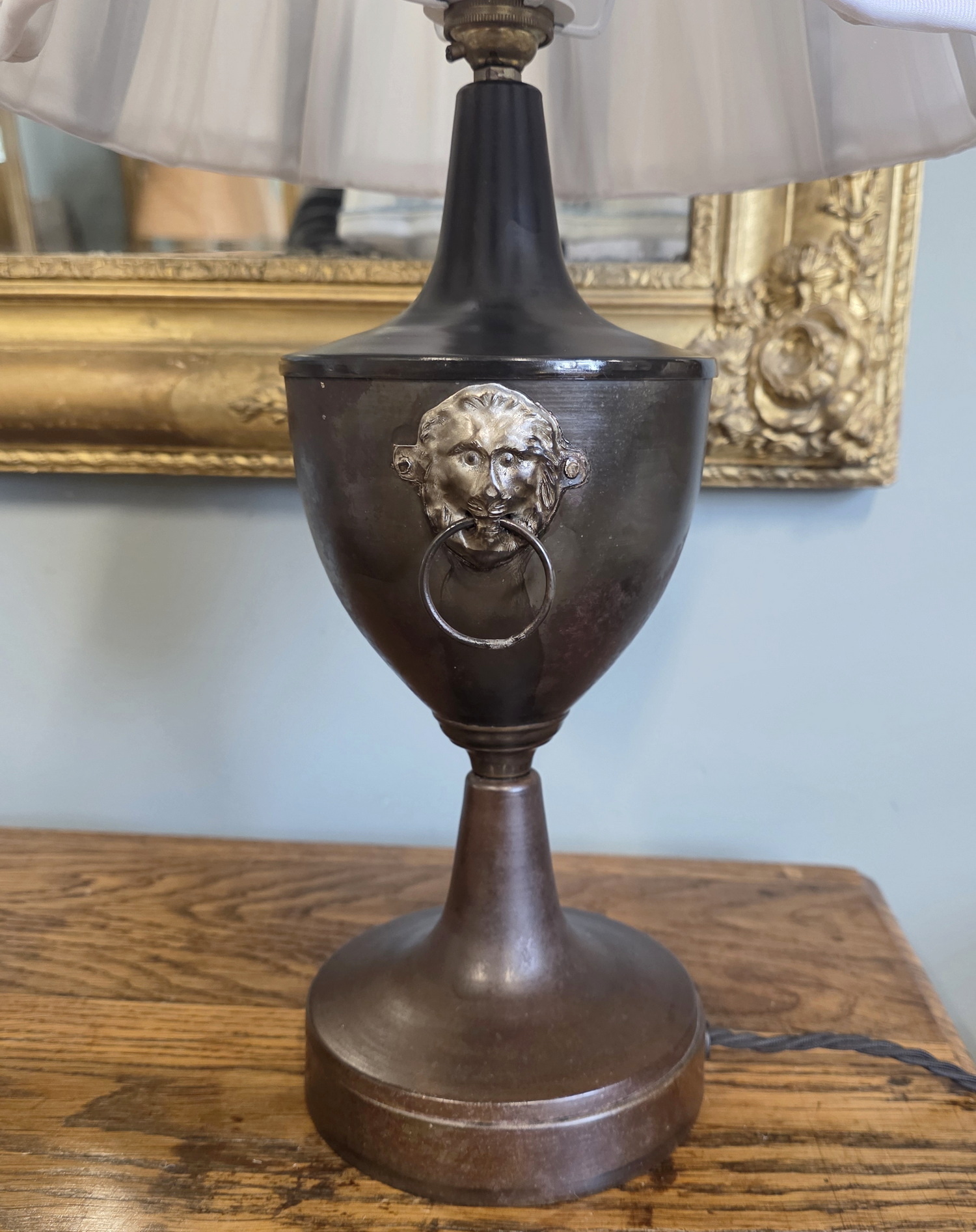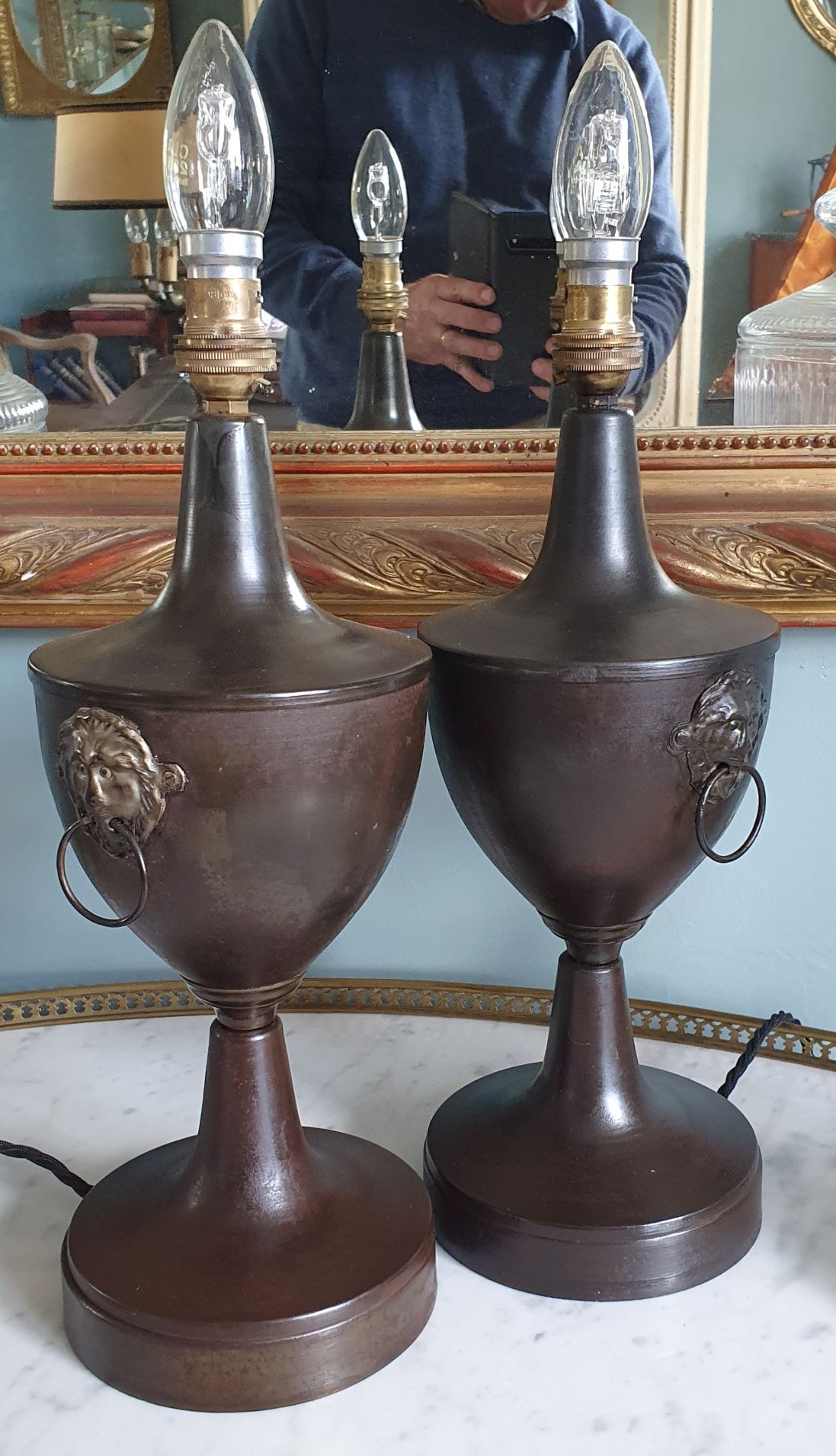 A pair of French Empire style turned and patinated tole-work Classical 'Athenian' urns, made into table lamps, the baluster shaped urns fitted with lions' heads handles and standing on circular plinths. The metal surfaces are nicely burnished and retain a bronze-like patina. Area of Paris, circa 1930.