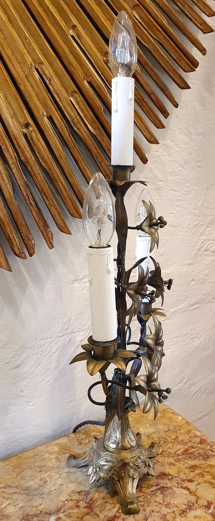 A pair of mid 19th century French Napoleon III period gilt bronze three light candelabra of wonderful personality. Each candelabrum is in the shape of a Classic tripod plinth sprouting a plant with leaves and flowers. The fire-gilt finish has nicely faded over time, retaining a warm glow in the patina. Originally used with candles, this pair of candelabra have been adapted for electricity. Area of Paris, circa 1870.