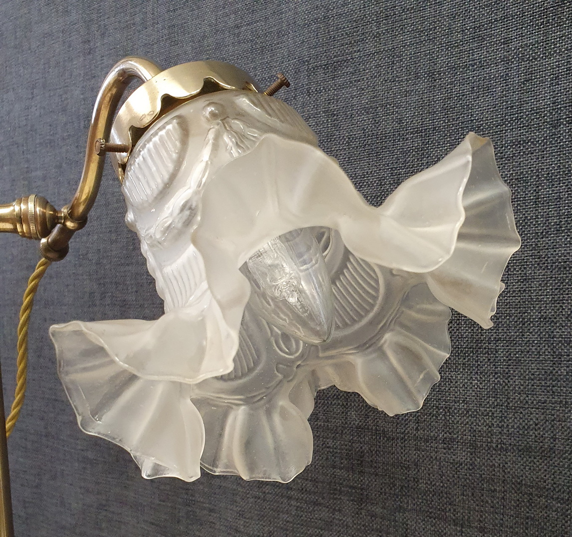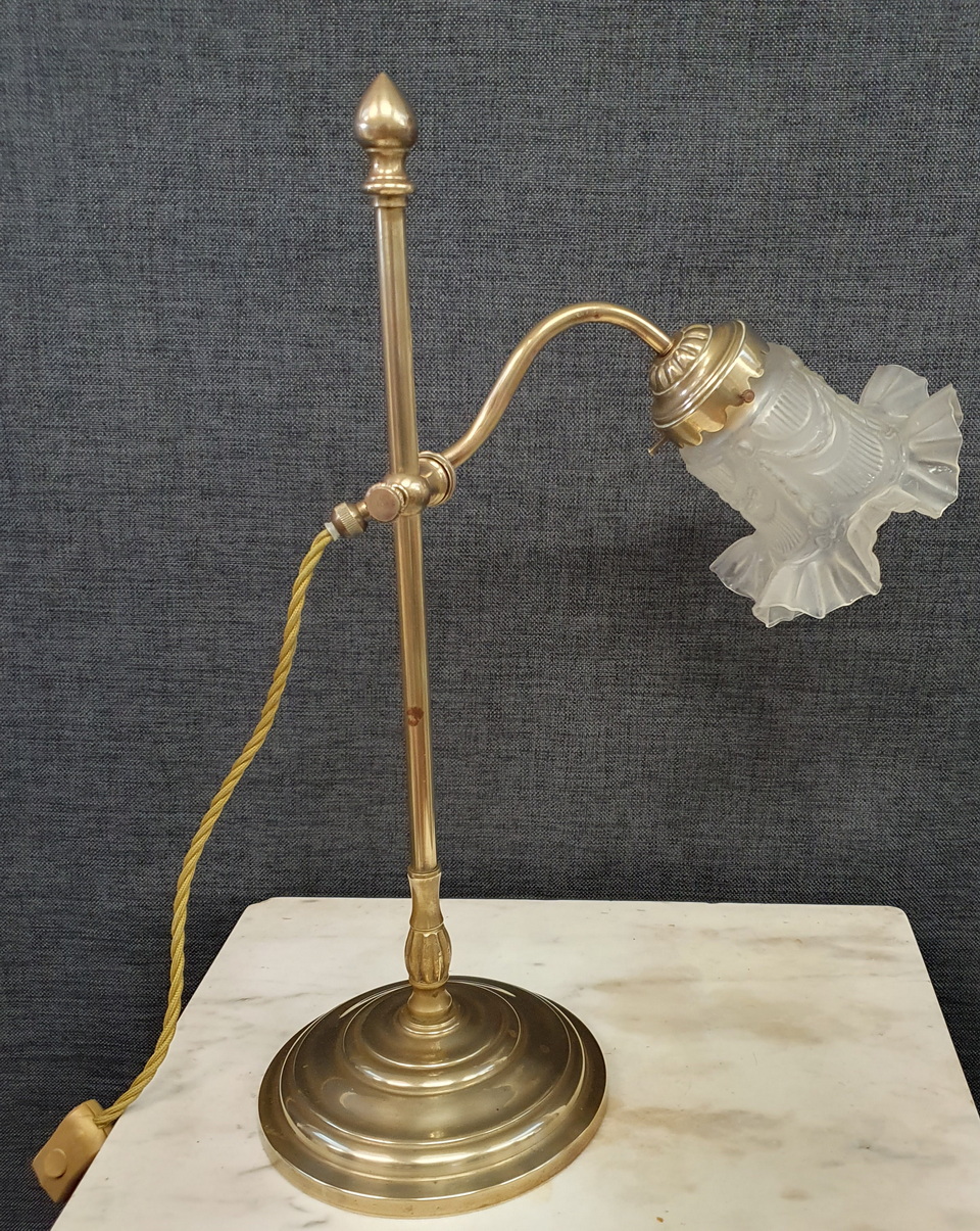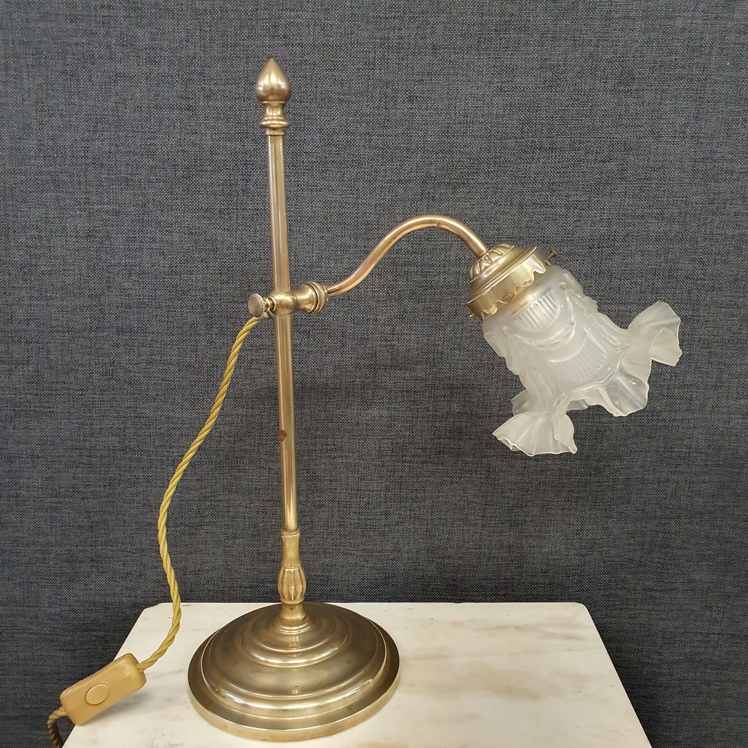 A French polished brass swivelling desk lamp, the heavy circular base supporting a vertical shaft and finial, to which the swivelling and adjustable-height arm is attached. Retaining the original Louis XVI style blown glass 'tulip' shade. Area of Paris, circa 1930.