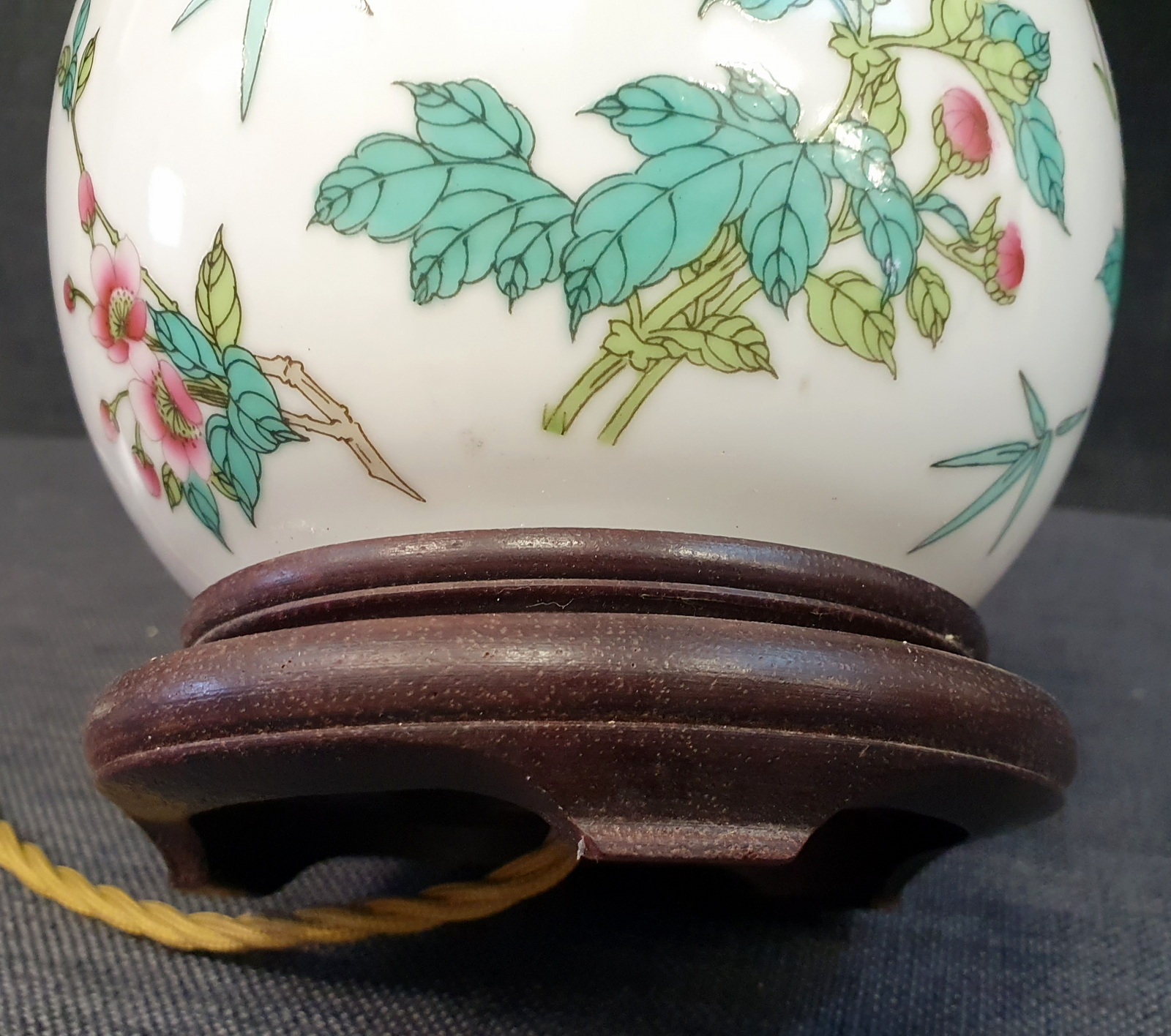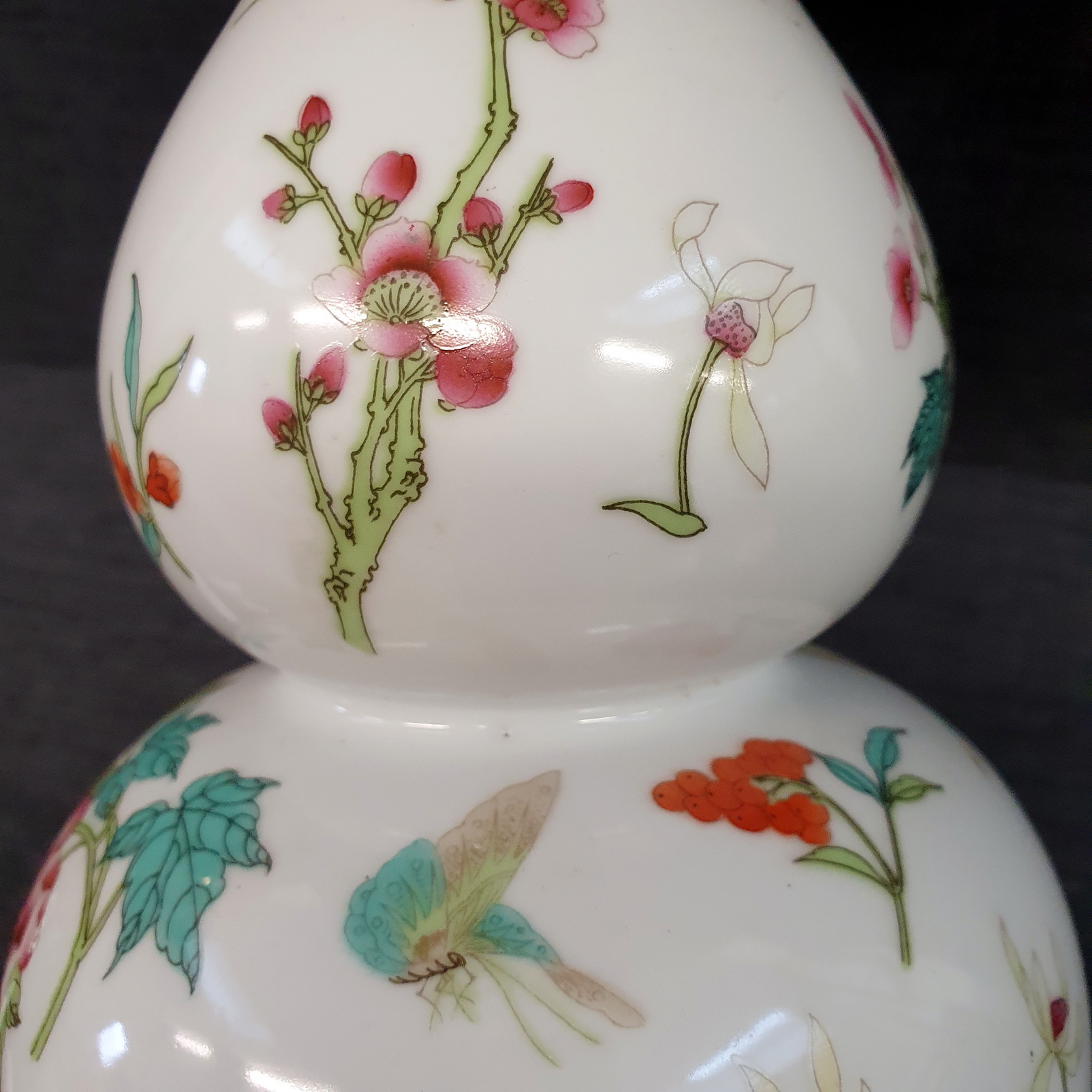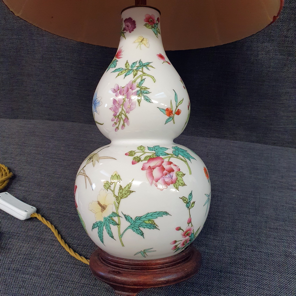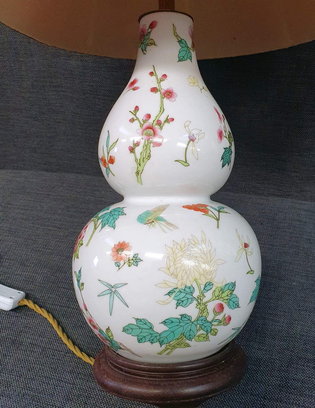 A finely made Chinese Quing Dynasty 'Butterfly' double-gourd porcelain vase, hand painted and decorated with delicate flowers and with whimsical butterflies, retaining its original carved timber plinth. Now sympathetically electrified and fitted with an adjustable-angle lampshade. China, circa 1900.