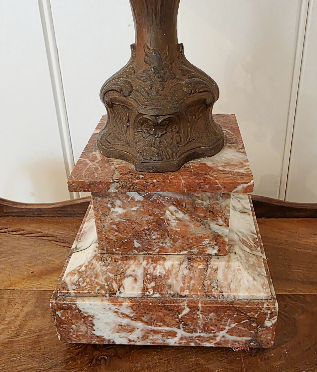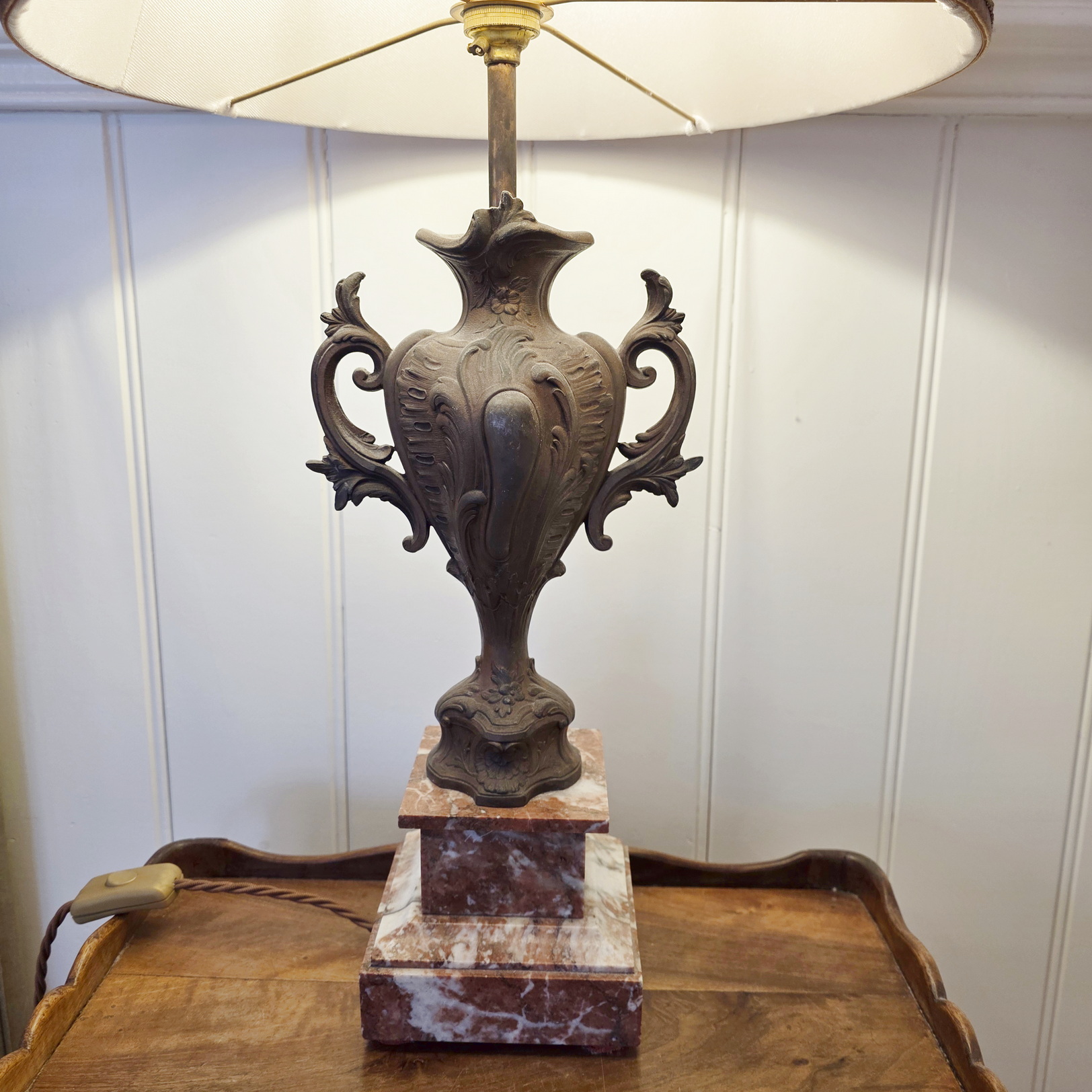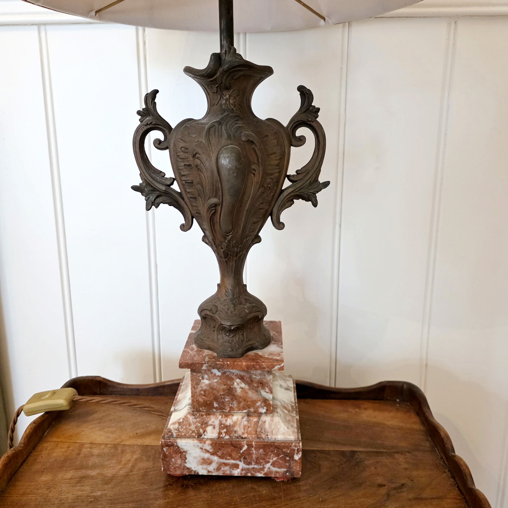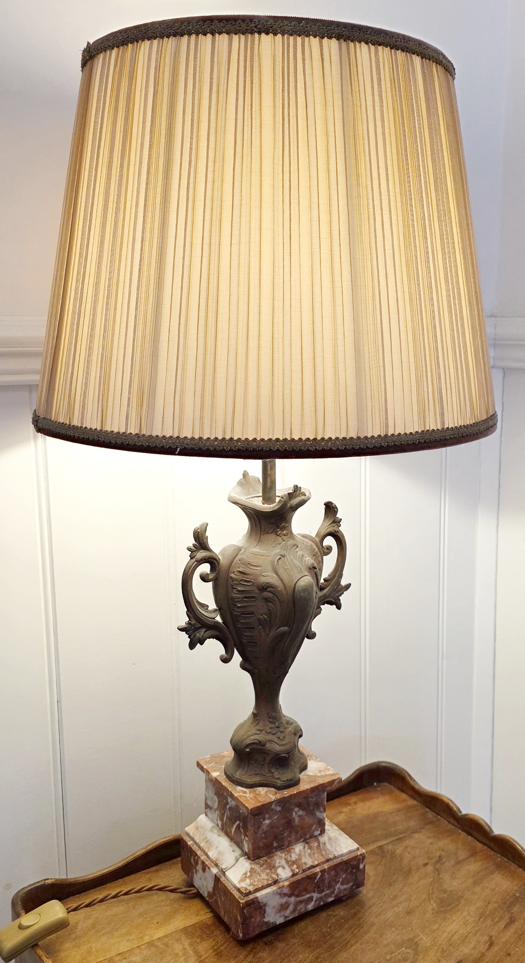 A fine pair of 19th century French Louis XV style cast and bronze-patinated spelter 'Cassoulette' urn lamps of Classic proportions, standing on 'Rouge de France' marble plinths. These urns have been electrified and are fitted with bespoke-made pleated silk lampshades. The urns are from the area of Paris, circa 1890.