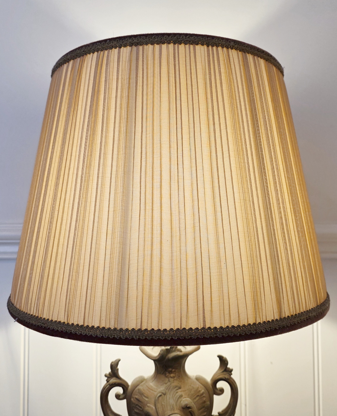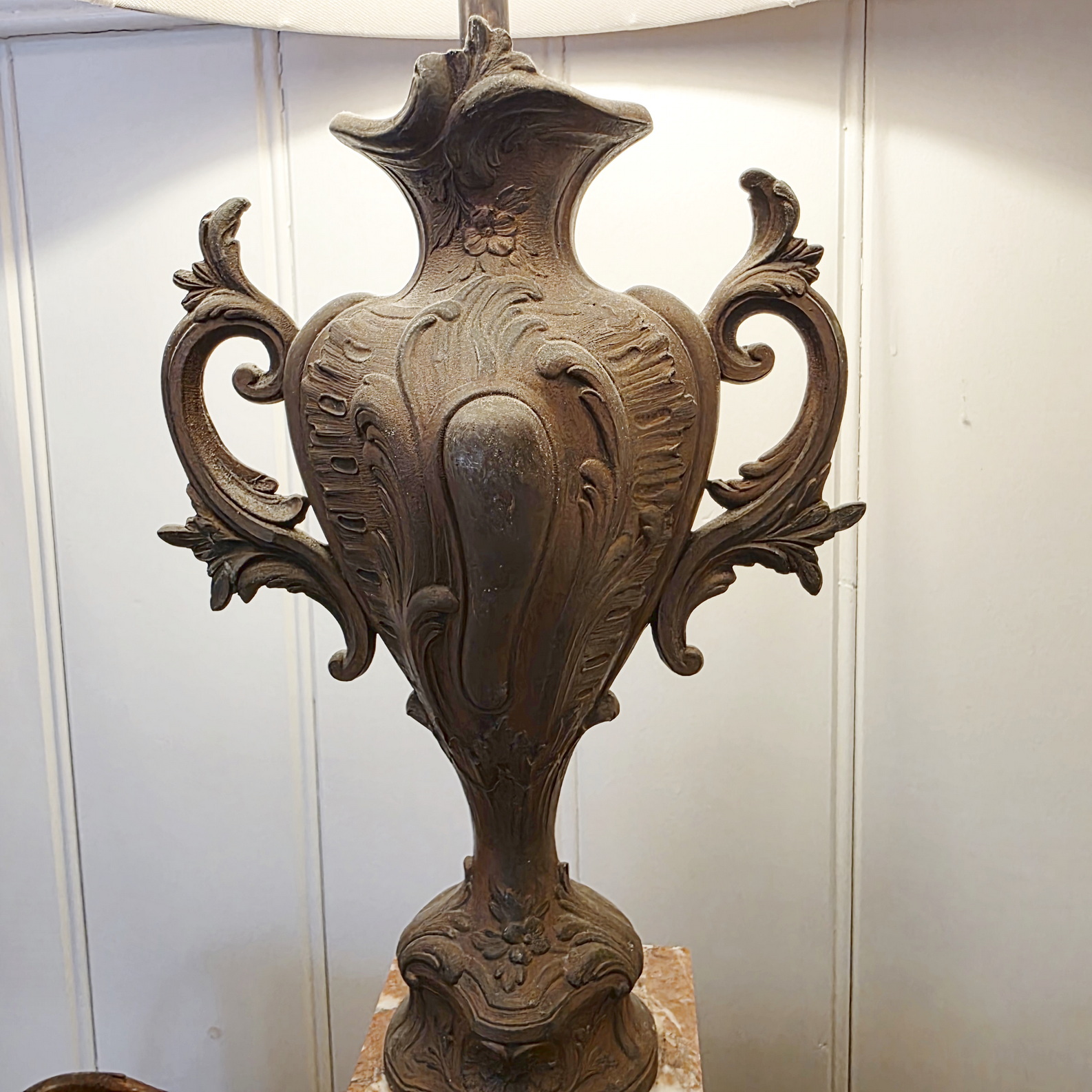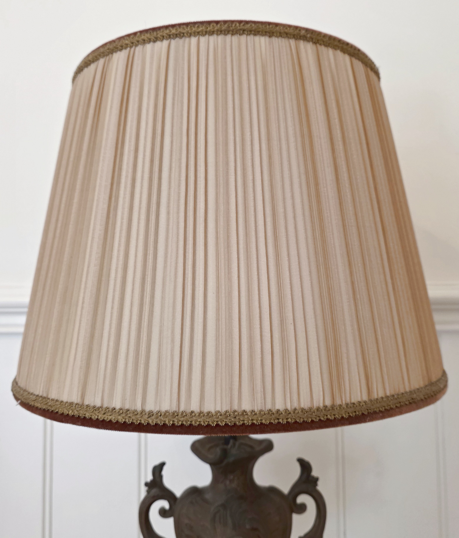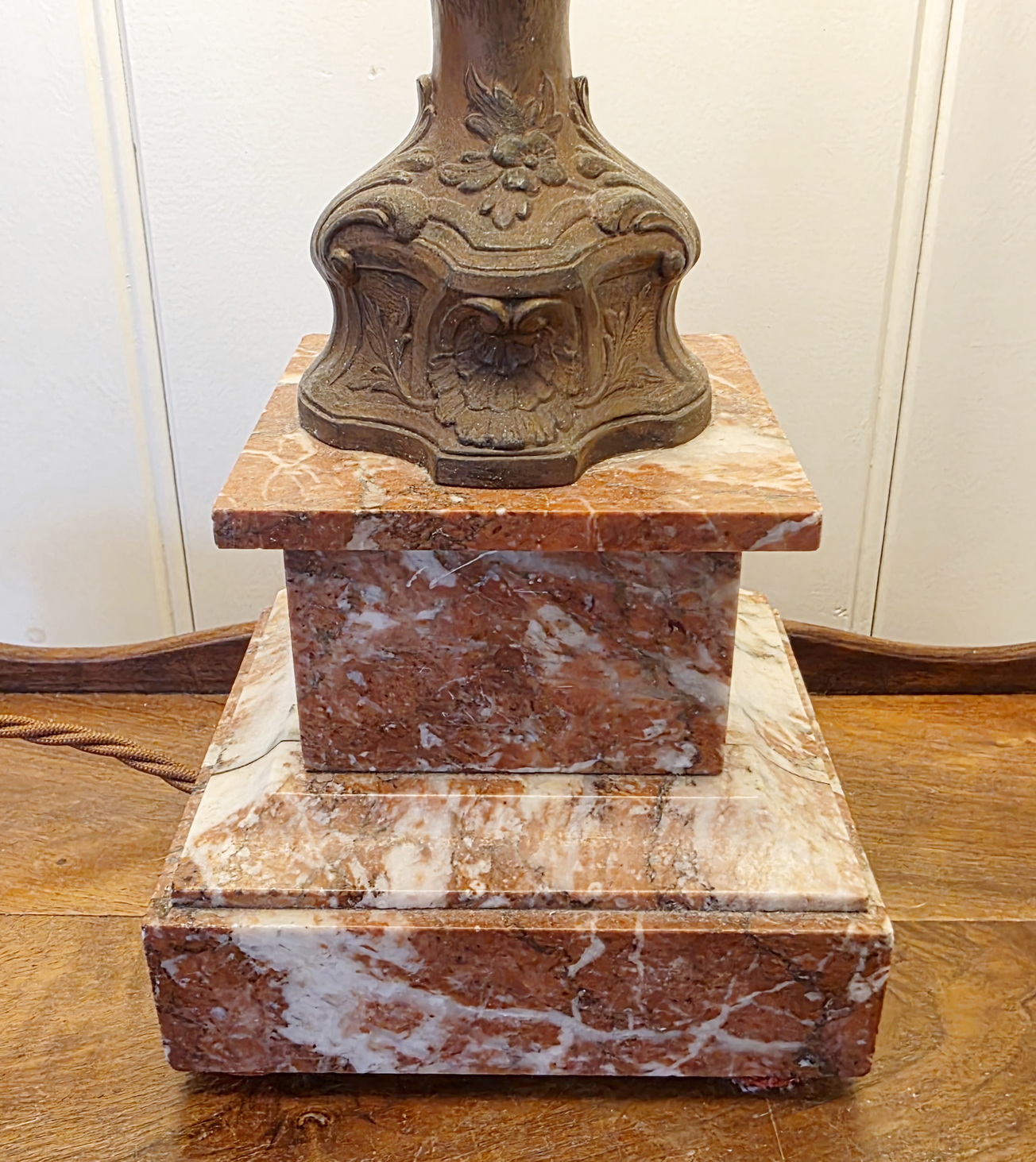 A fine pair of 19th century French Louis XV style cast and bronze-patinated spelter 'Cassoulette' urn lamps of Classic proportions, standing on 'Rouge de France' marble plinths. These urns have been electrified and are fitted with bespoke-made pleated silk lampshades. The urns are from the area of Paris, circa 1890.