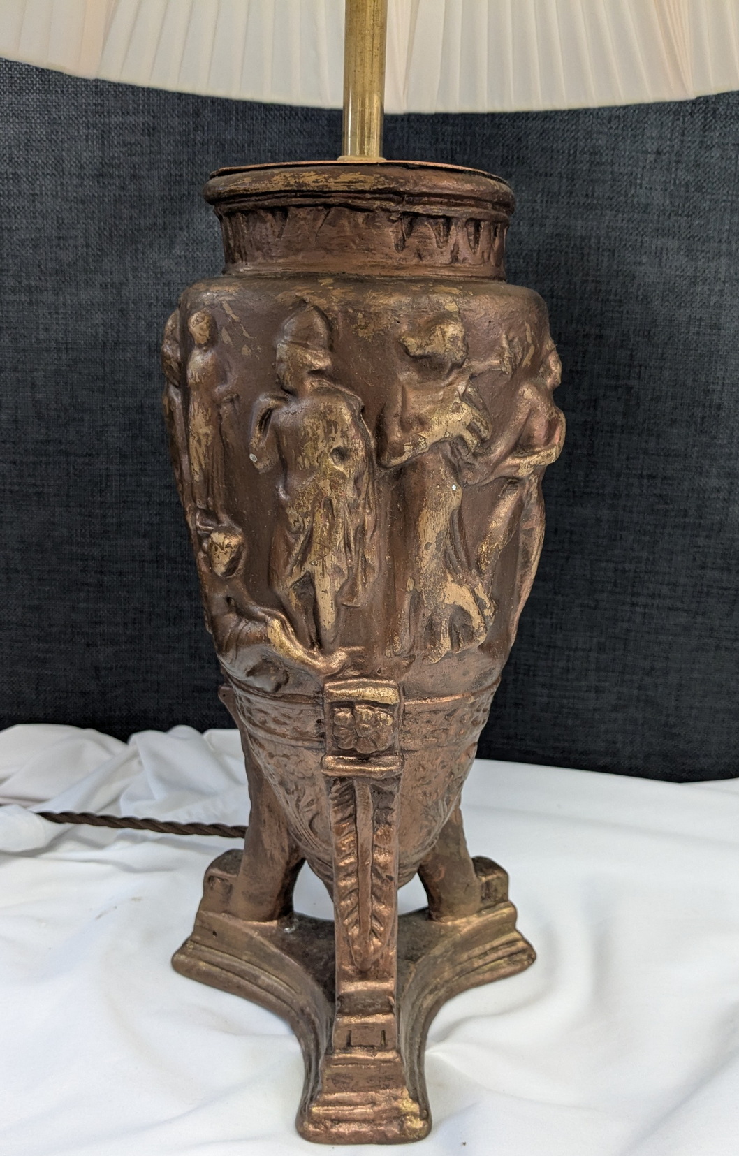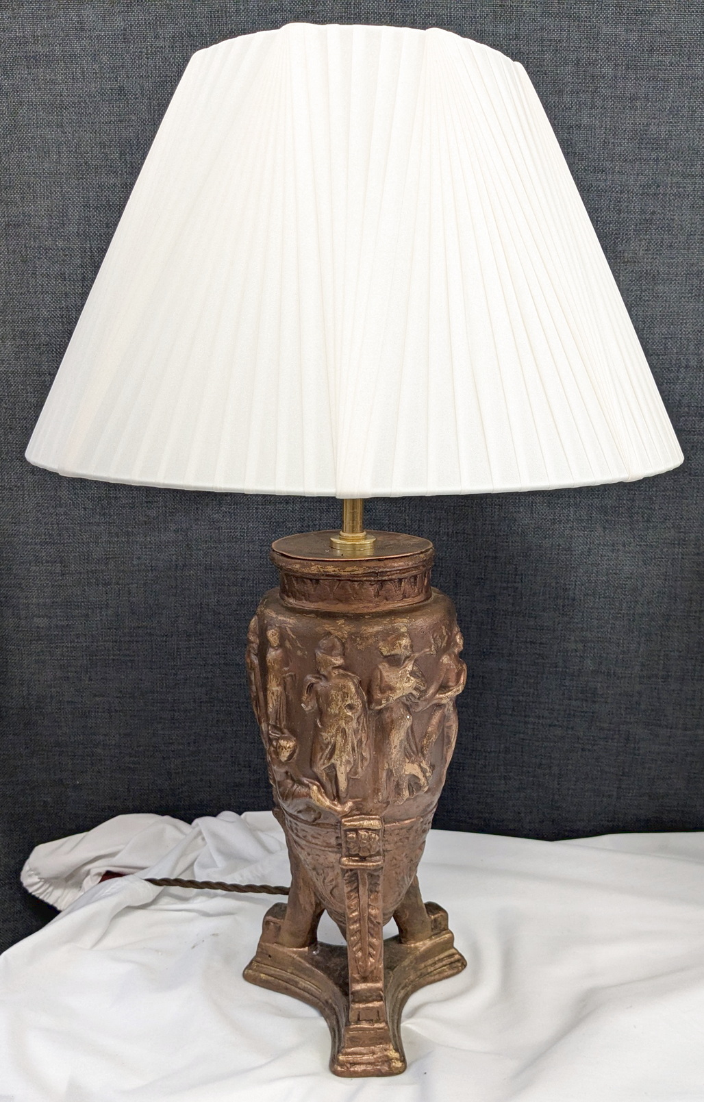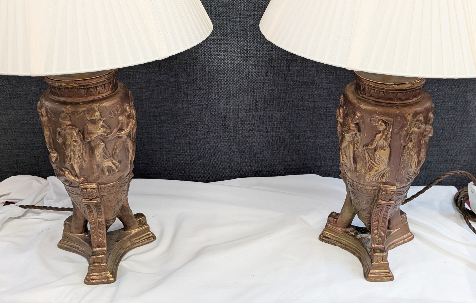 An elegant air of French Louis XVI style gilt spelter 'Athenian' table lamps, the urns decorated with Classical figures and standing on tripod bases. Fitted with purpose made Coco Chanel style silk lampshades. Area of Paris, circa 1930.Price is for the lamps including the lampshades.