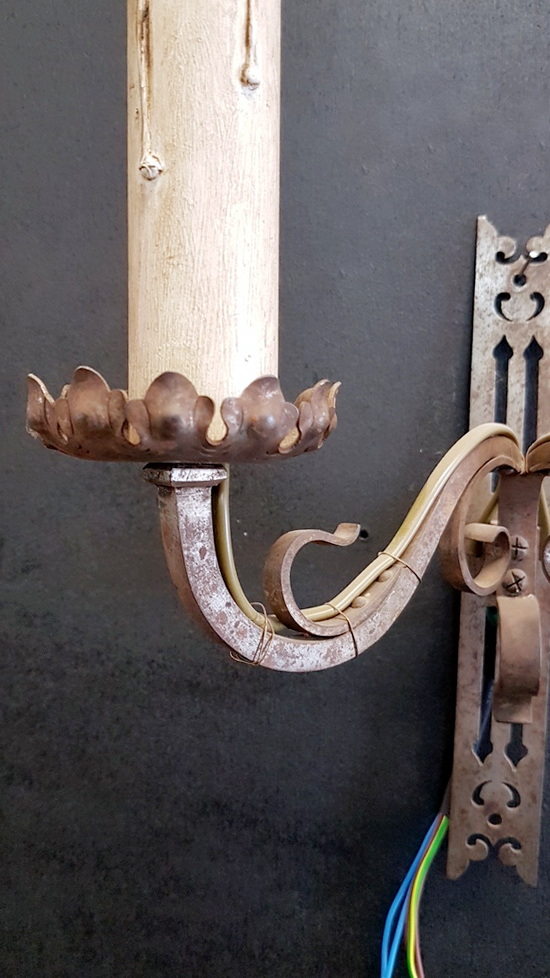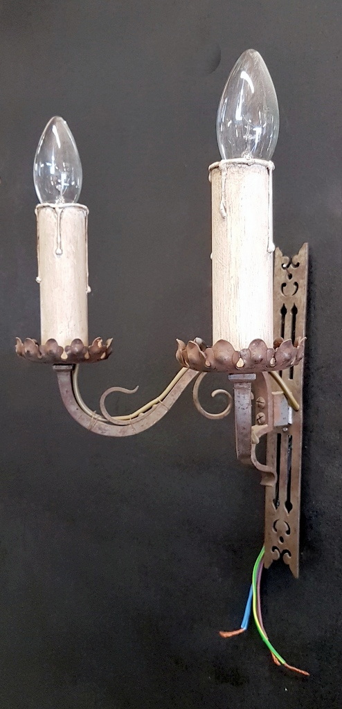 A pair of early 20th century French Provincial Gothic style forged and polished iron wall lights of two arms, the wall plates and candle-holders fretted. Of good size and proportions.
