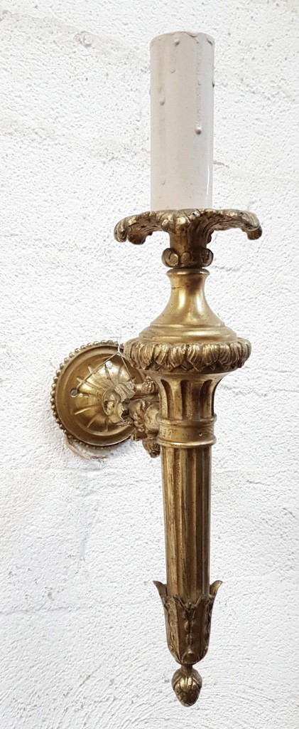 A pair of large French Louis XVI style brass wall lights in the shape of 'Torchères' (flame torches), decorated with Neoclassical motifs including acanthus leaf mouldings and fluting. Please note the fine quality of the chased and gilt metalwork. Area of Paris, circa 1900.