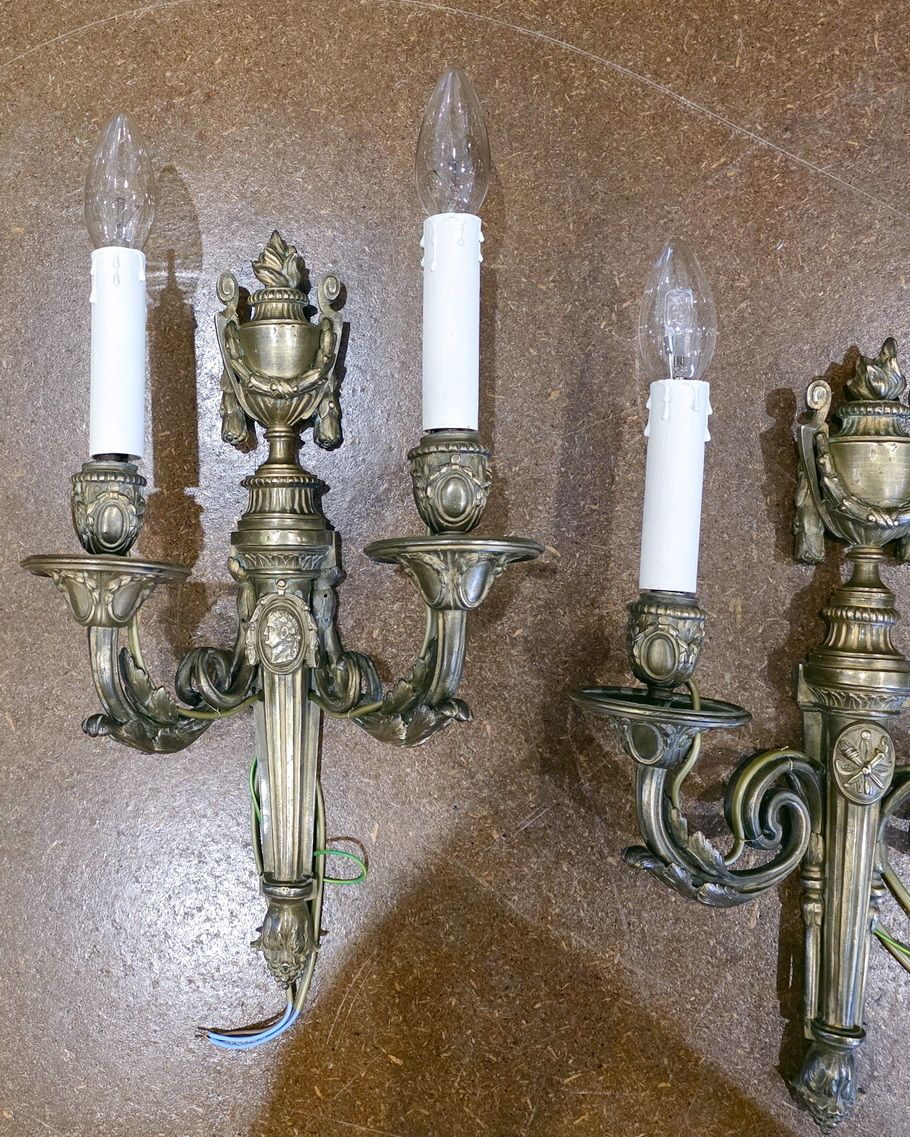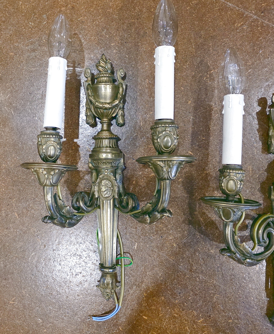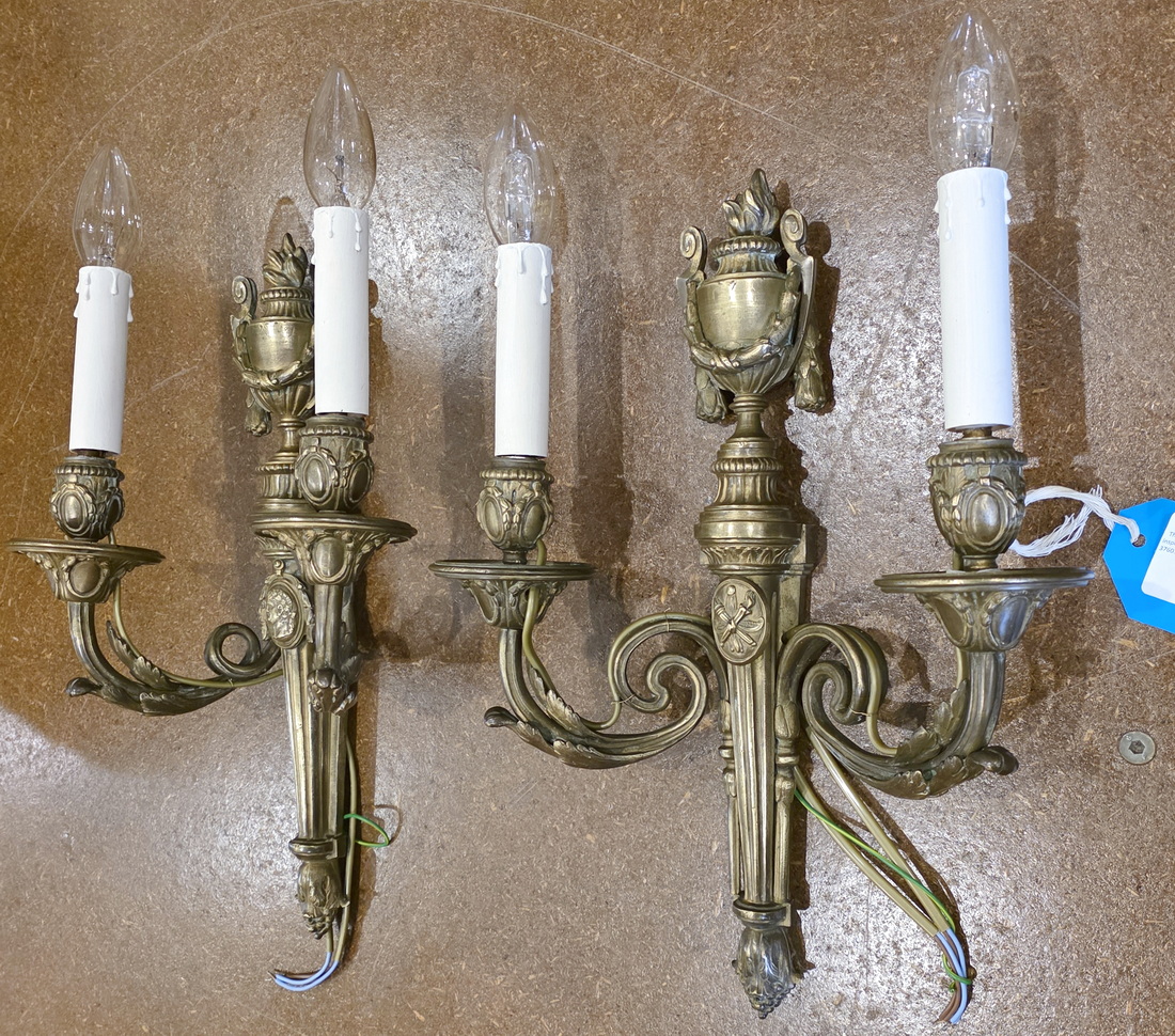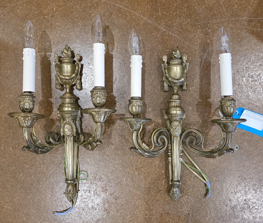 Two French Louis XVI style brass wall lights, an almost pair but with slight differences, each finely cast and decorated with a Classical urn finial, with garlands of leaves and with Classic medallion motifs, the arms in the shape of foliate scrolls. Please note the jewellery-like quality of the gilt brass. Area of Paris, circa 1930.