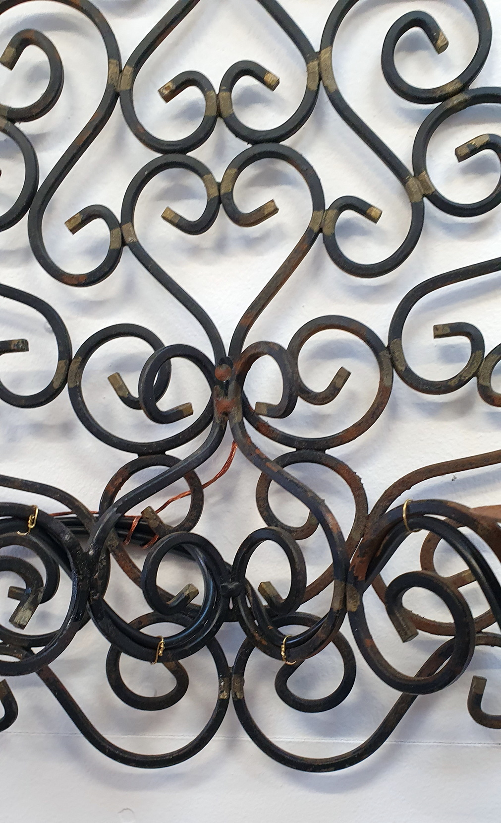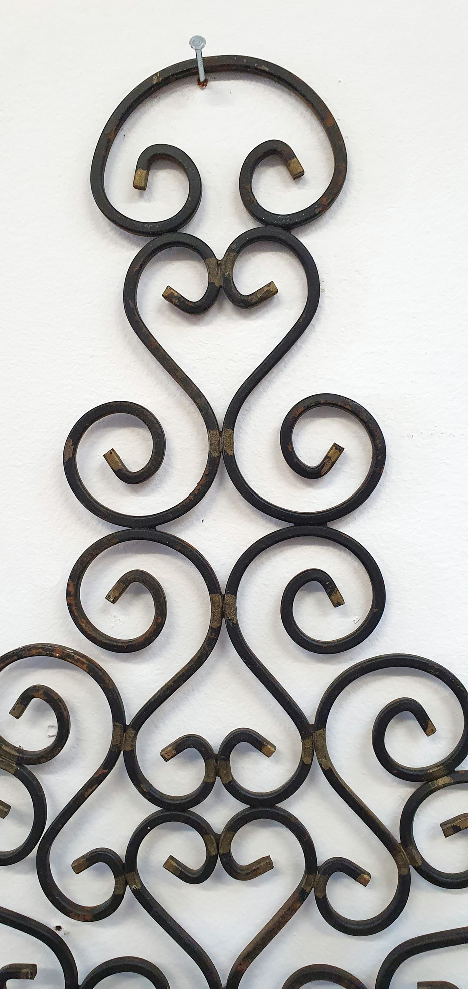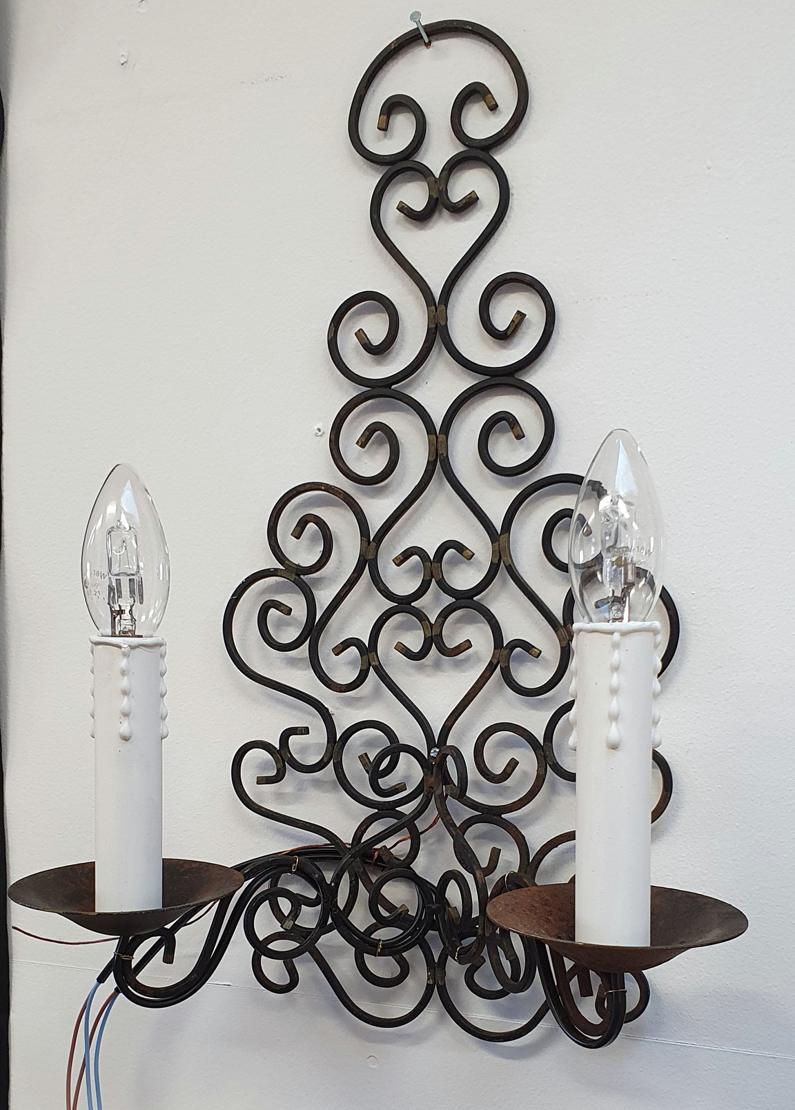 Three French Provincial wrought iron wall lights of traditional design, decorated with elegant 'C' and 'S' scrollwork, the metal retaining the original gun-barrel steel colour. Area of Normandy, circa 1970.