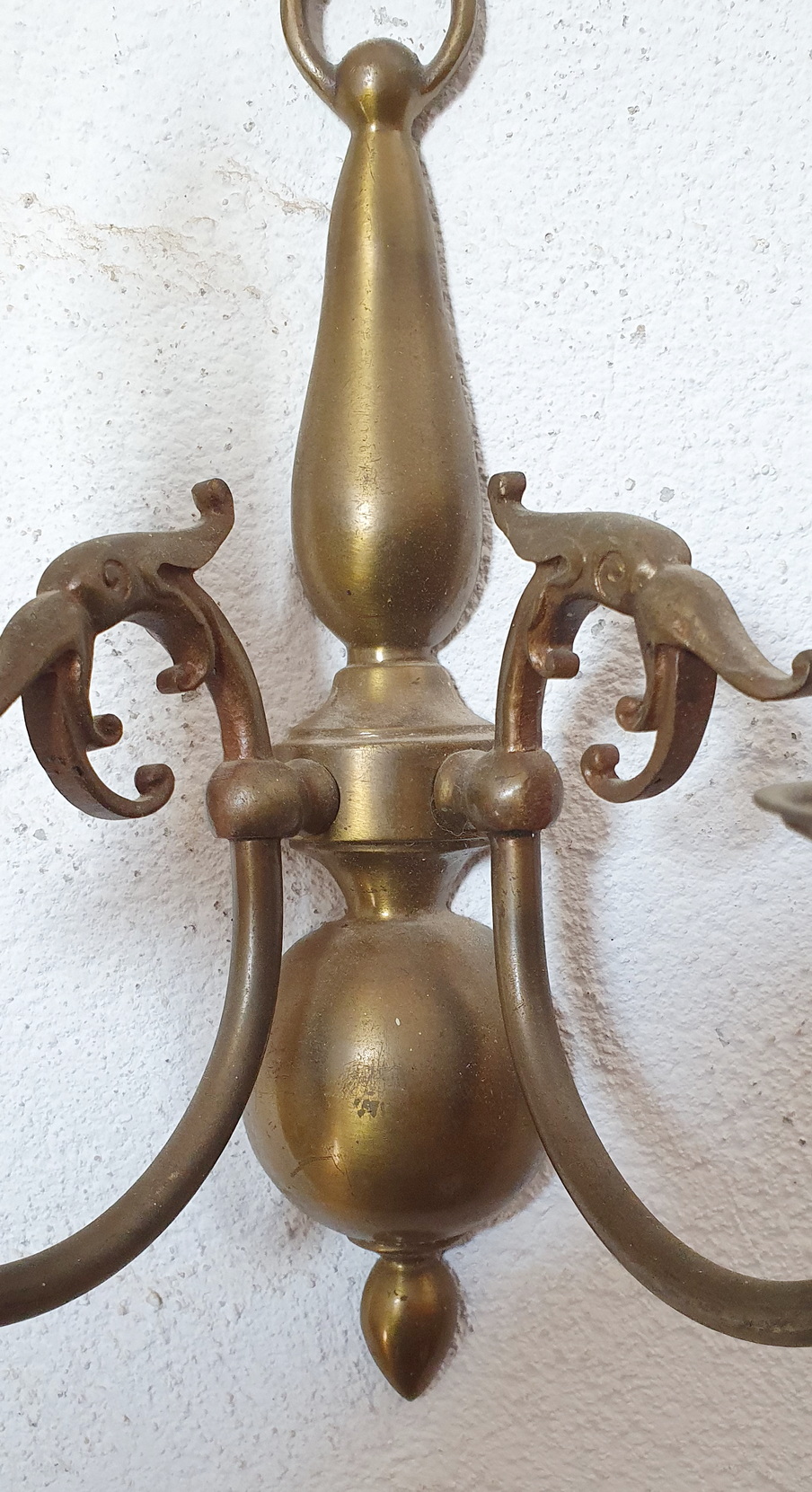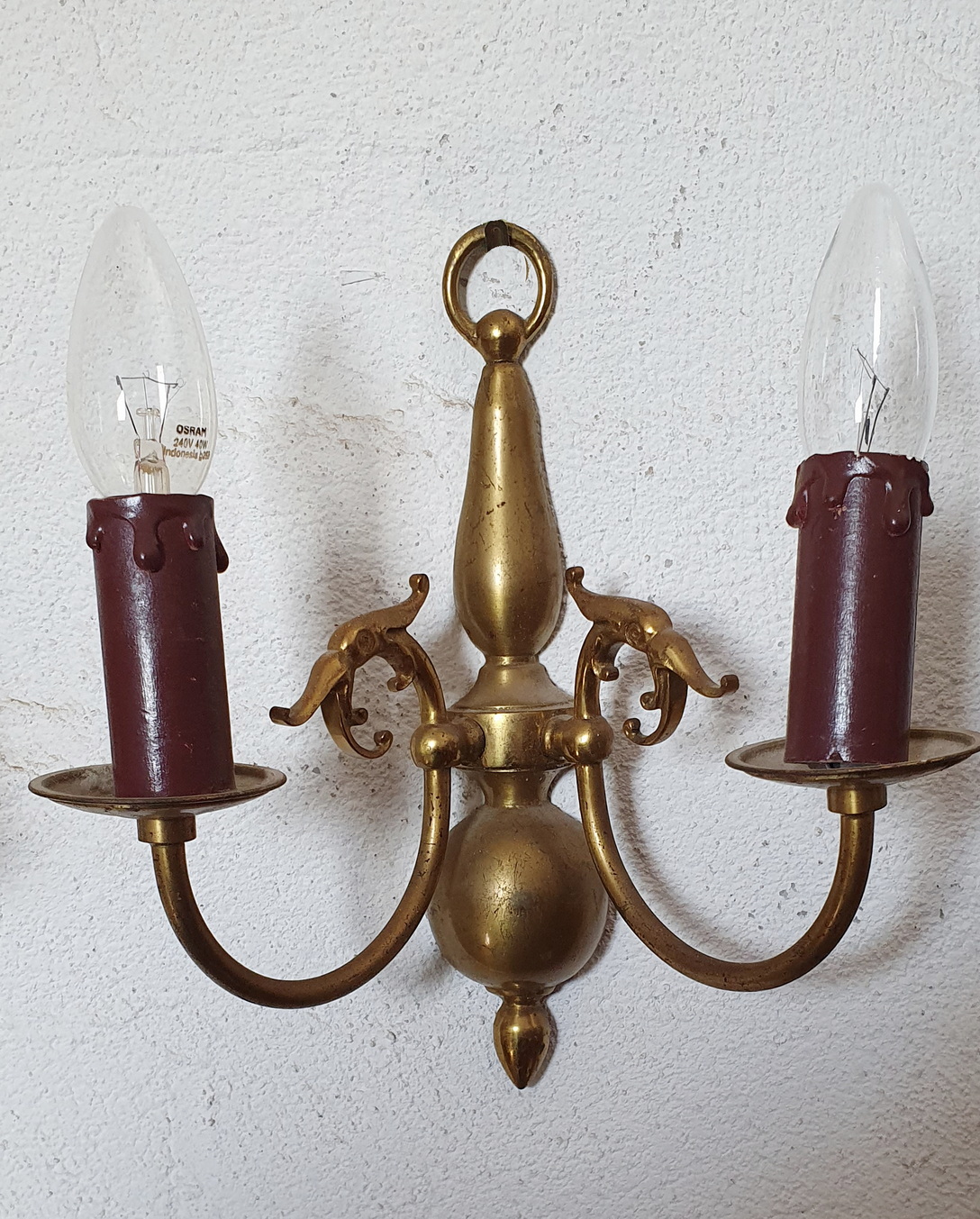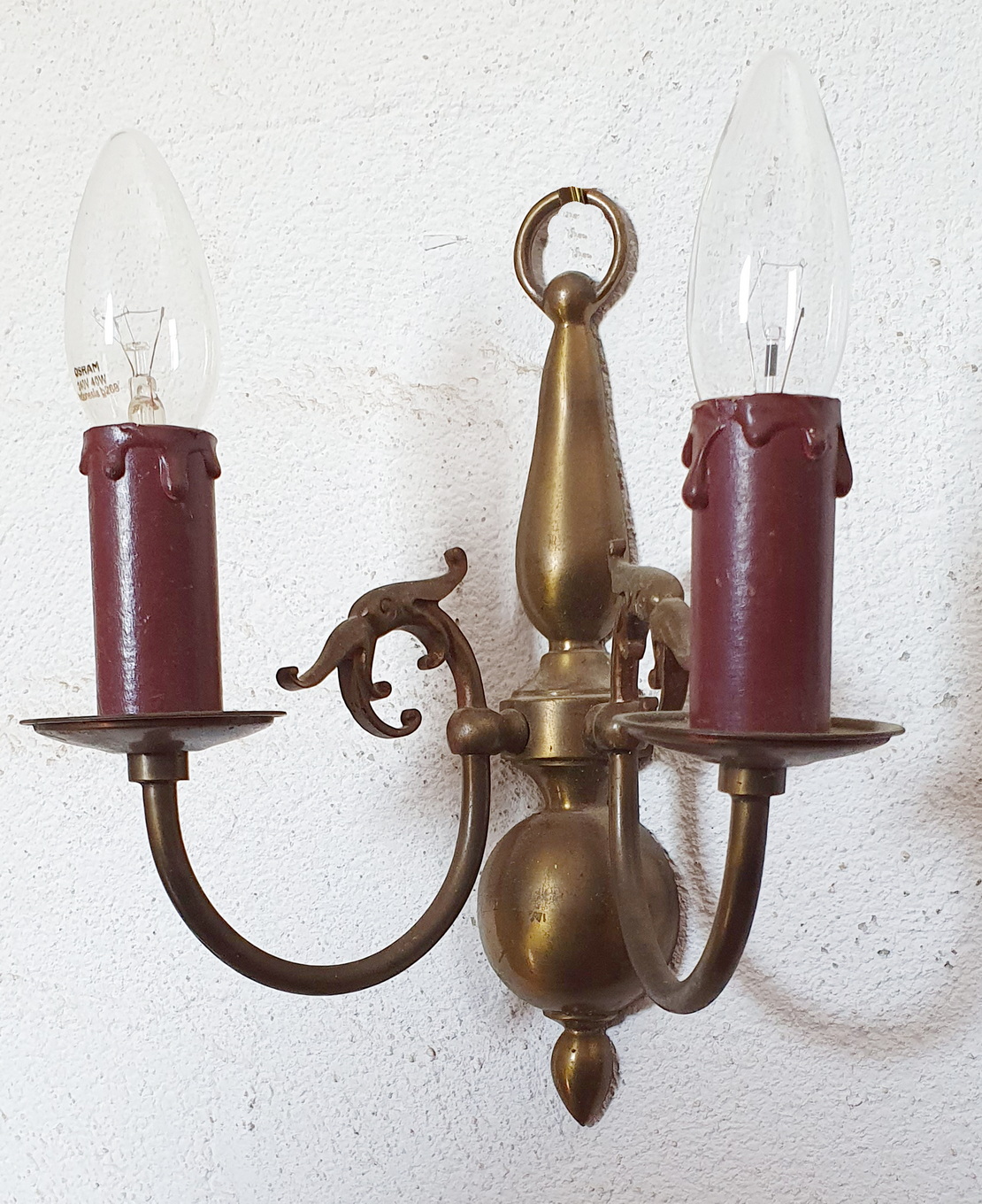 A pair of early 20th century french gilt brass wall lights, each of the lights with two sconces decorated with stylised lilies. Area of Paris, circa 1930.
