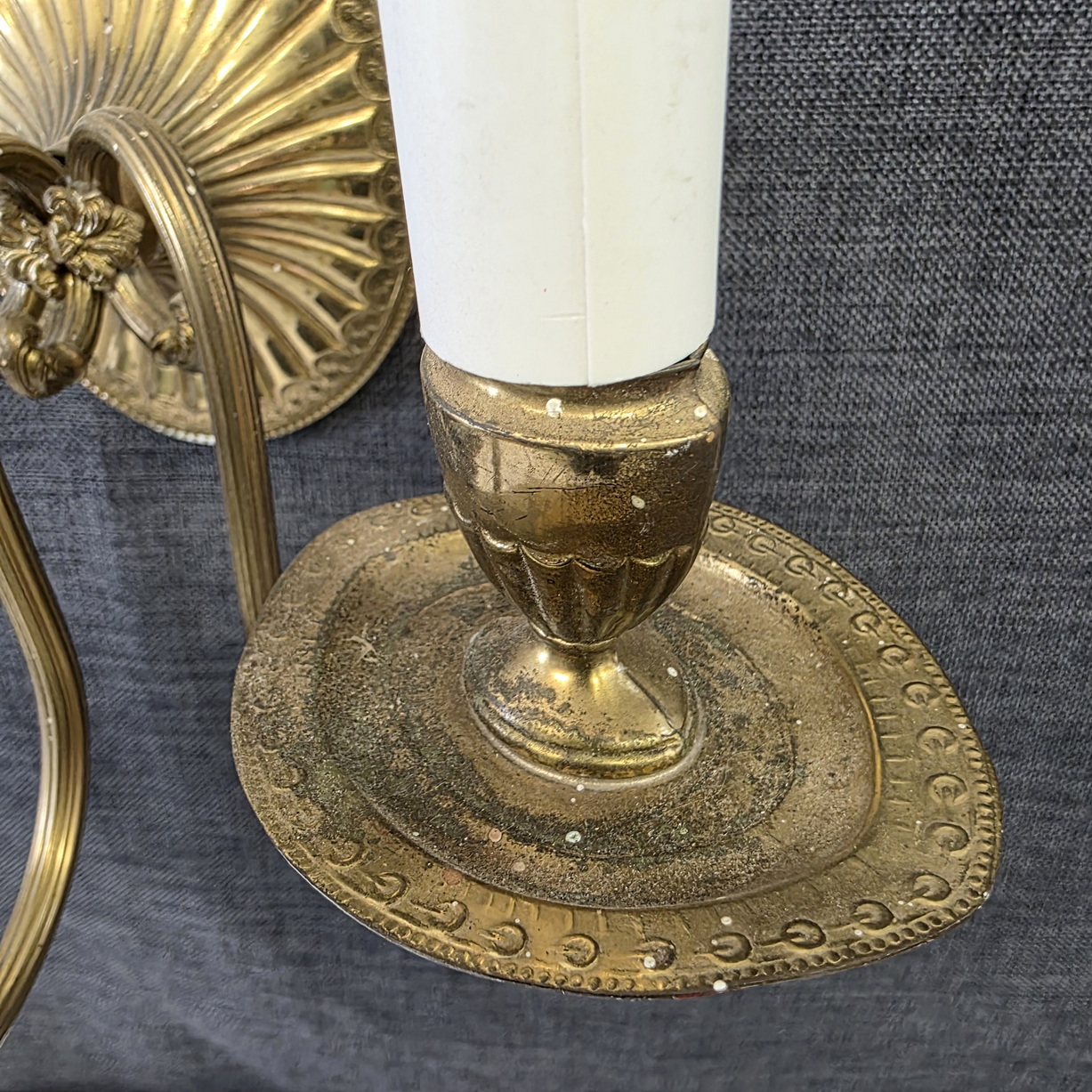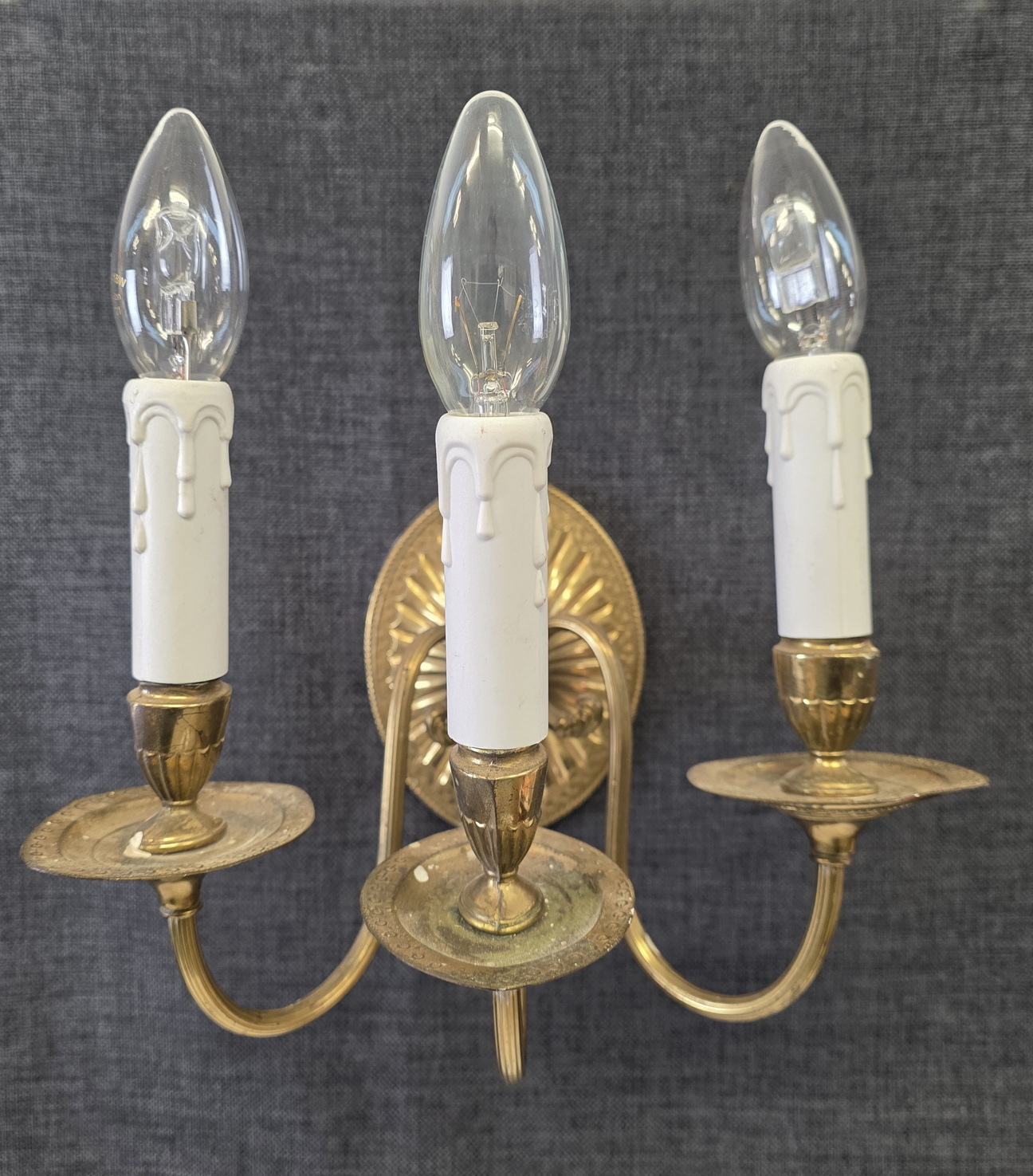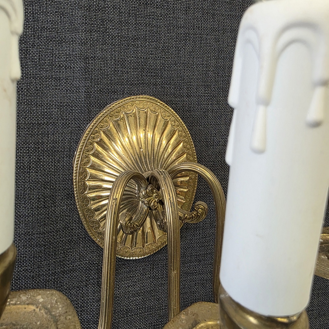 A pair of early 20th century Art Deco period gilt repoussé metal wall lights, the fan shaped wall-plates with three arms and 'urn' style holders, fitted with faux candles and light bulbs. Please note: this sse of wall lights came from the same Florentine Villa as lights #15984. Area of Florence, circa 1930.