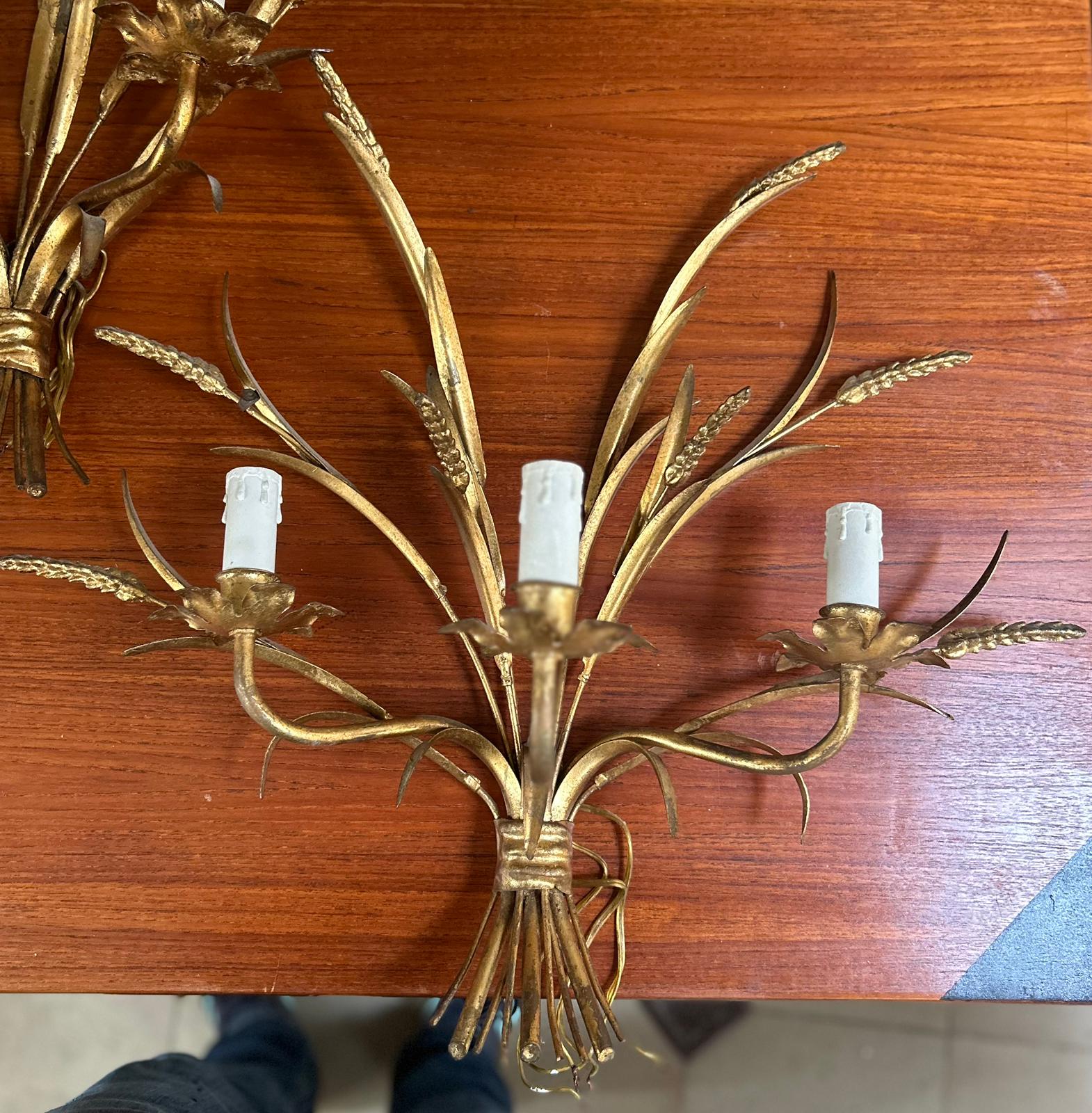 A pair of mid 20th century French gilt wrought iron and tole-work, three-light Maison Jansen design wall lights decorated as bouquets of wheat stalks tied together by a wire rope. In France, this design of light is referred to as a 'Coco Chanel' light, deriving from the original 'wheat sheaf' coffee table designed by Salvador Dali, for Coco Chanel's Parisian apartment. Area of Paris, circa 1960.