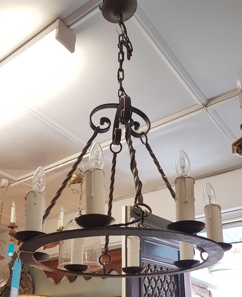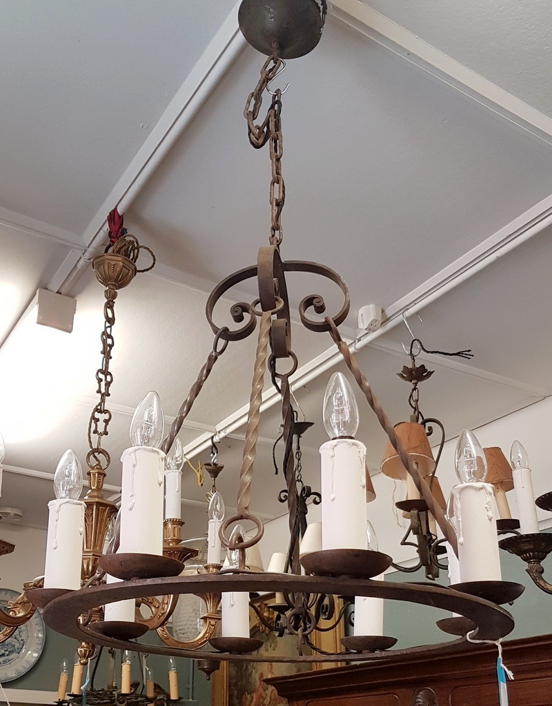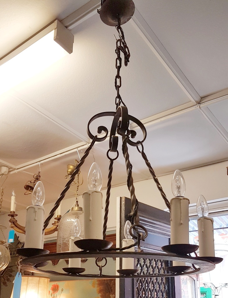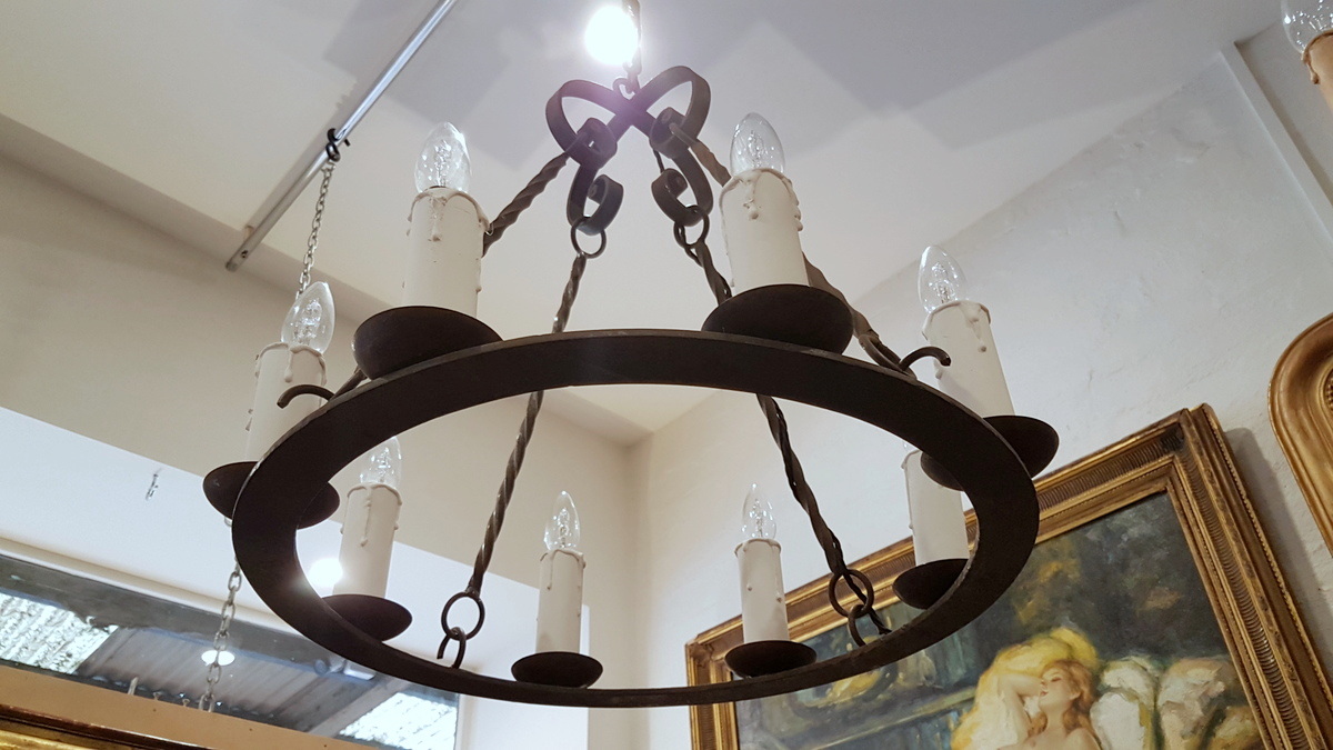 A French Provincial wrought iron ceiling light of eight lights fitted onto a circular-shaped structure, hanging from its original rod-chains. A characterful light, showing the hand-made steel rivets of its construction. France, circa 1930.
