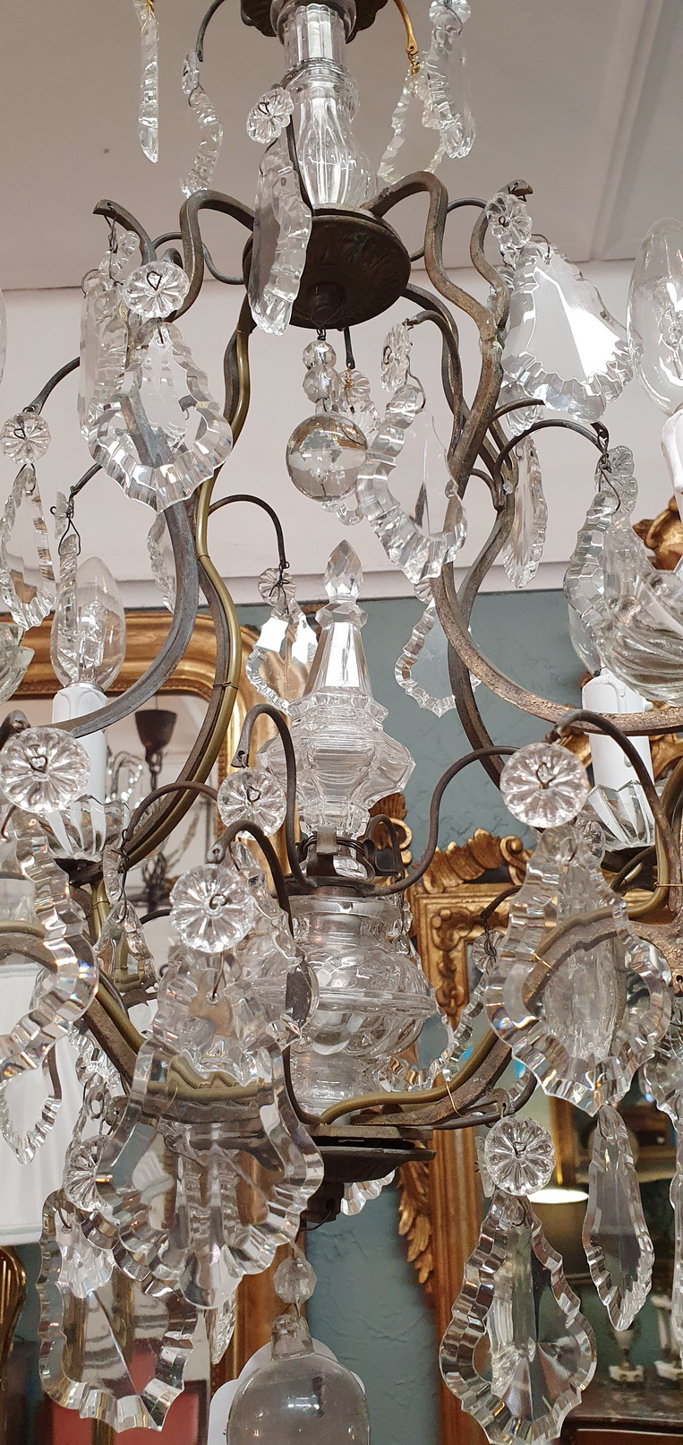 A small and fine quality 19th century French solid bronze and cut crystal ‘baluster’ chandelier of four lights. Of a size suitable for a bedroom or a small drawing room, this chandelier has proportionally large sized crystal drops, crystal drip trays and a central crystal 'poignard' finial. Area of Paris, circa 1880.