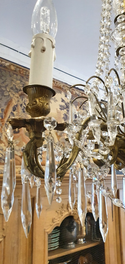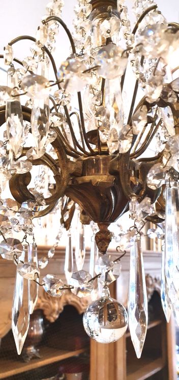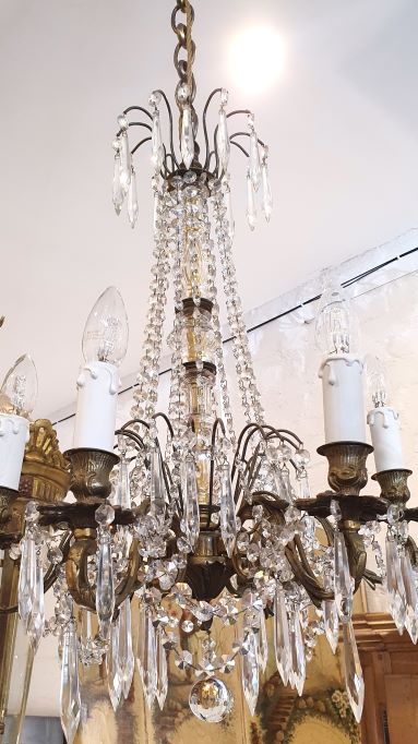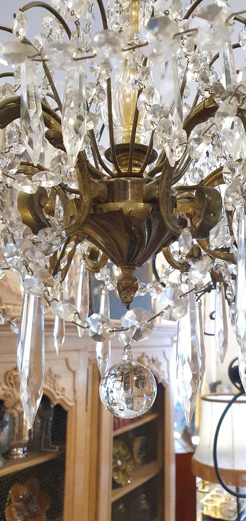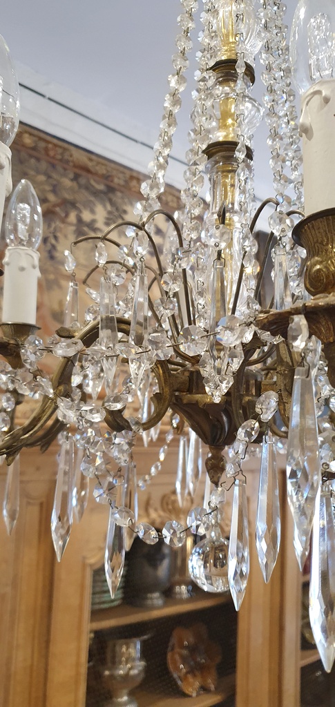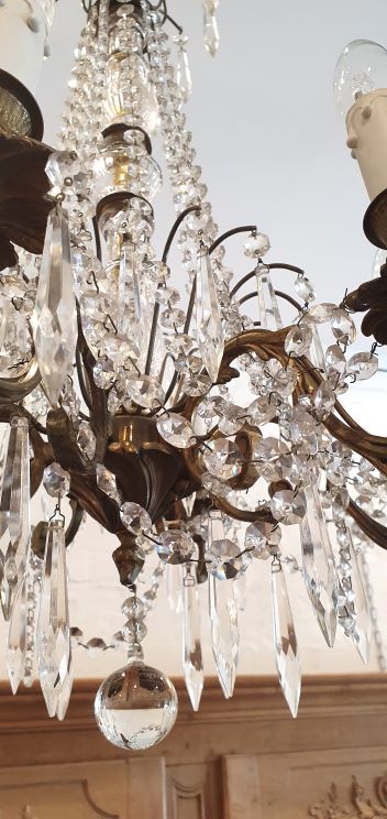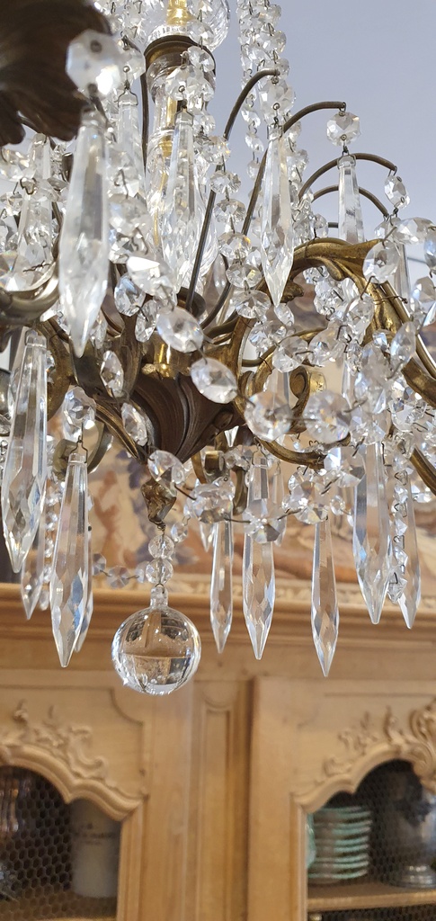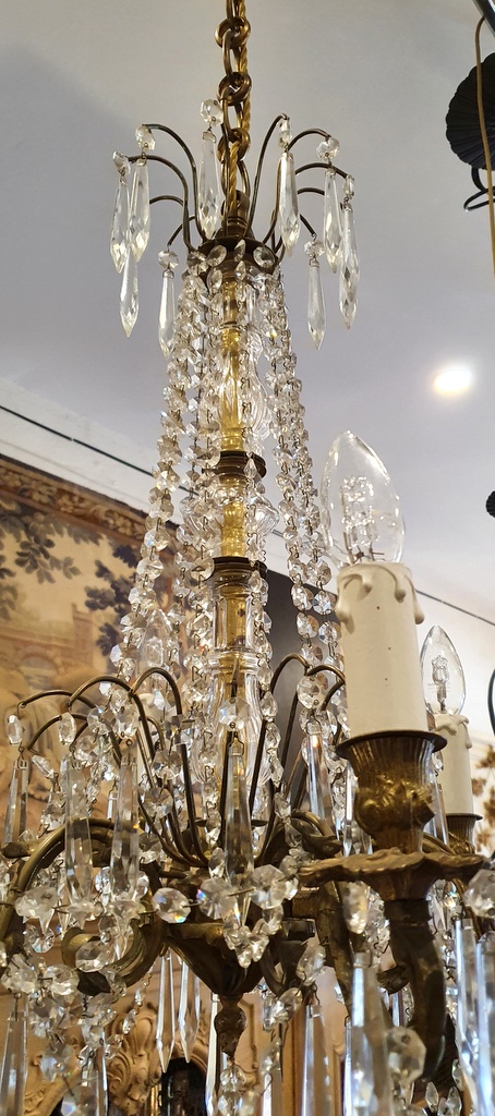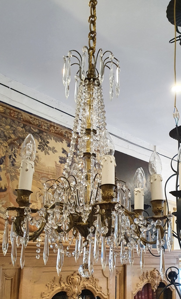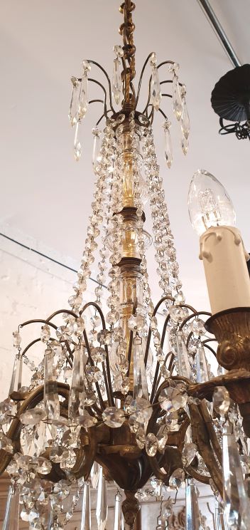 An elegant 19th century Parisian quality, Louis XVI style, gilt brass Salon bedroom chandelier of six arms decorated with 'pencil' cut crystals drops and with sweeping crystal bead chains. Of wonderful proportions and with an elegant, central crystal baluster (with golden reflexes from the internal gilt rod), and retaining the original crystal plinth ball. The metal of the arms has a wonderful, original patination. Area of Paris, circa 1880.