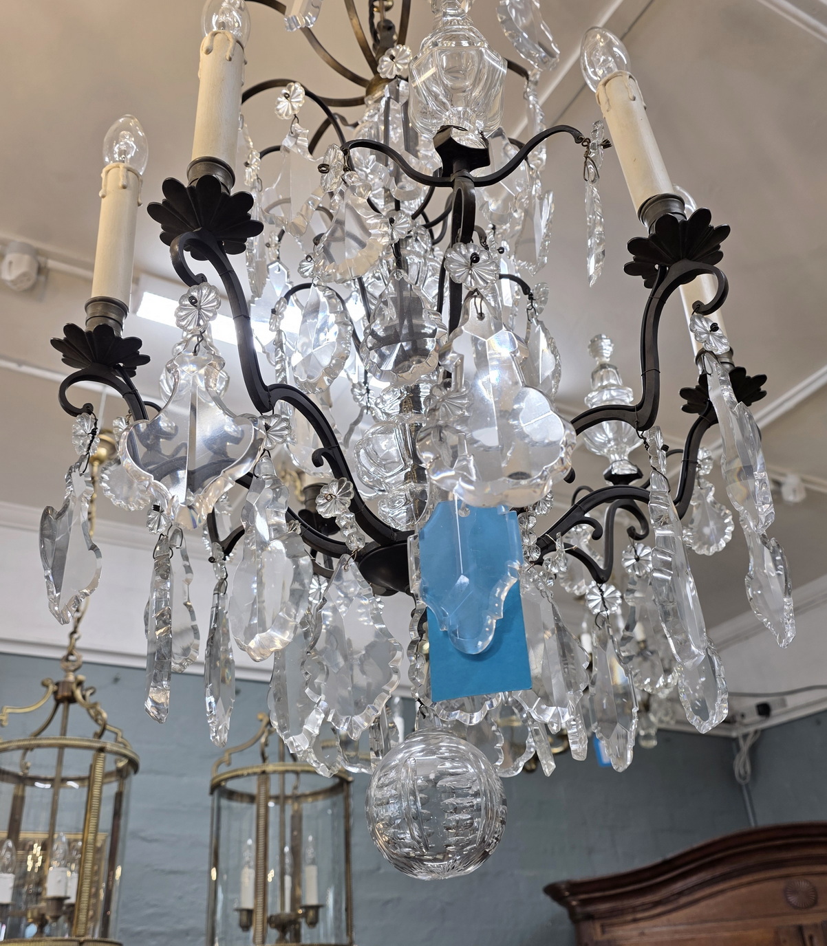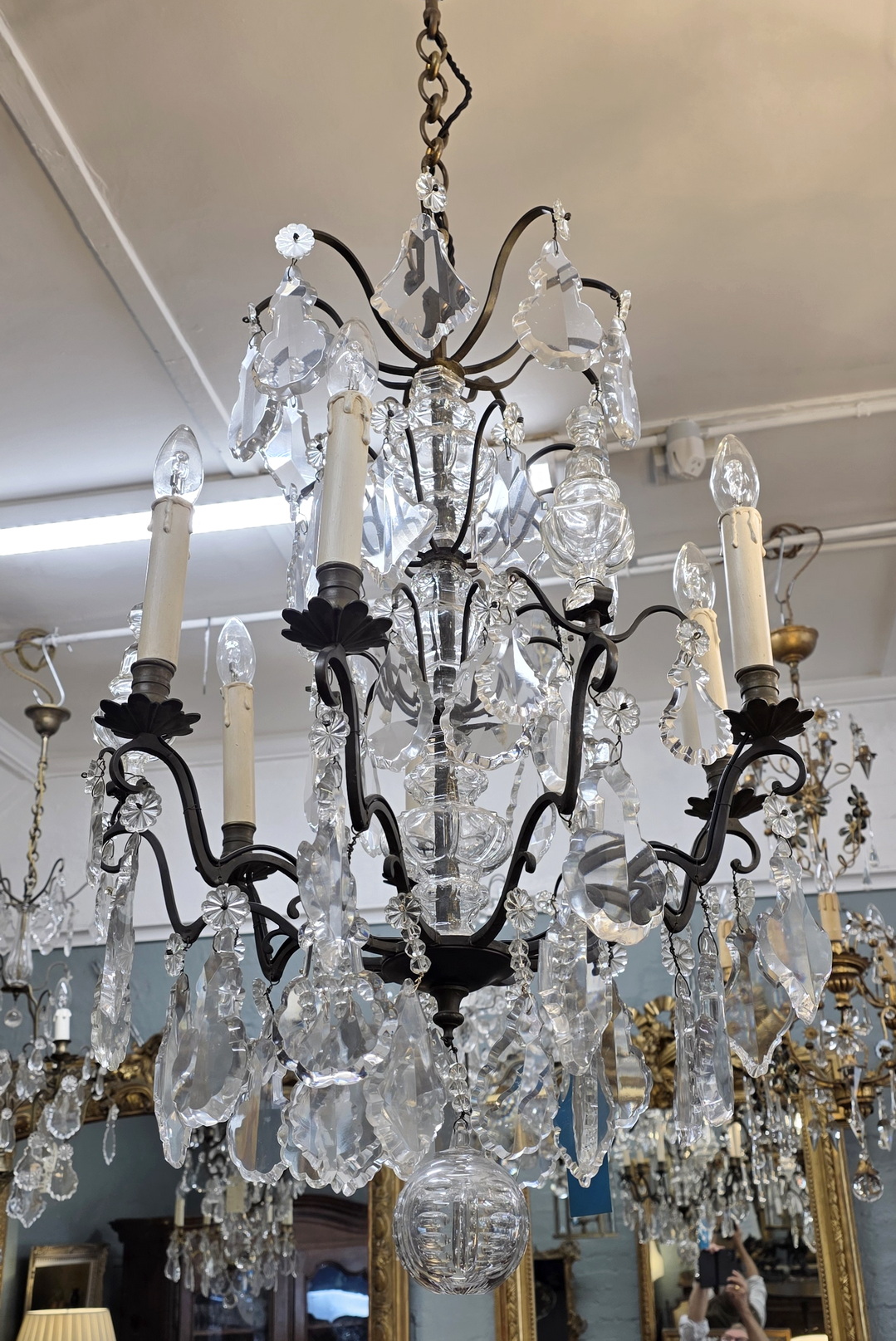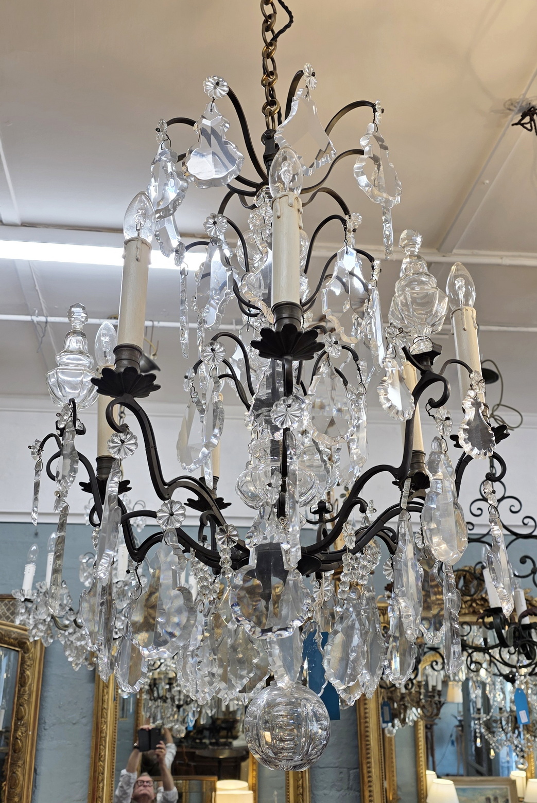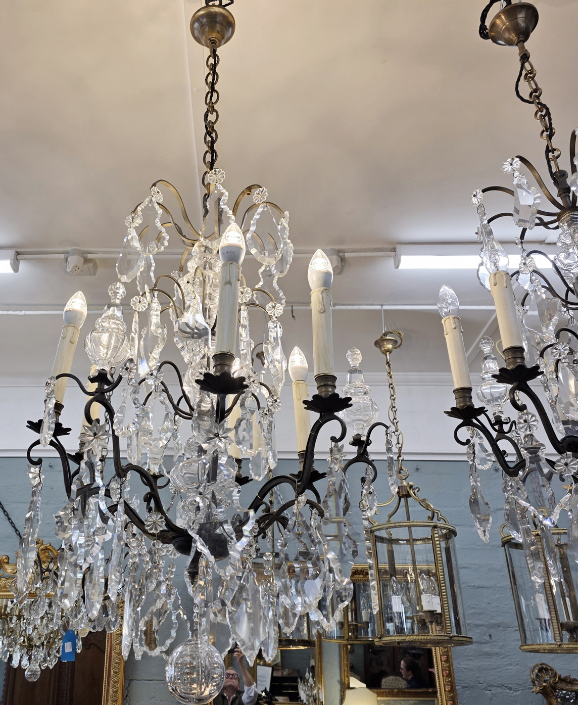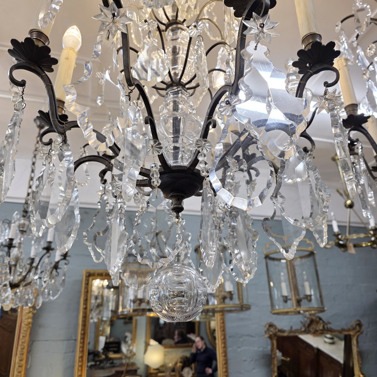A pair of 18th century French Louis XVI period bronze and cut crystal 'baluster' chandeliers of six lights each, of a suitable size for a drawing or dining room, these Classically proportioned 'baluster' chandeliers are densely decorated with large, shaped and waterwheel-cut crystal drops, with 'rosette' crystals and with large crystal 'poignards' (turret-shaped finials). The chandeliers' bronze structures have an excellent patination, retaining their original and large plinth-balls. Please note the high quality and wonderful shapes of the central balusters. Area of Paris, circa 1780.