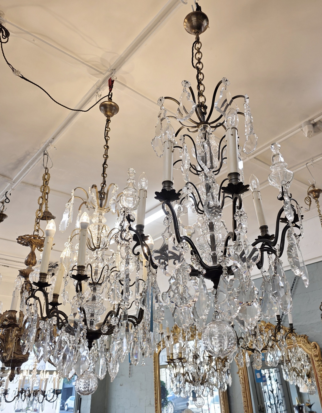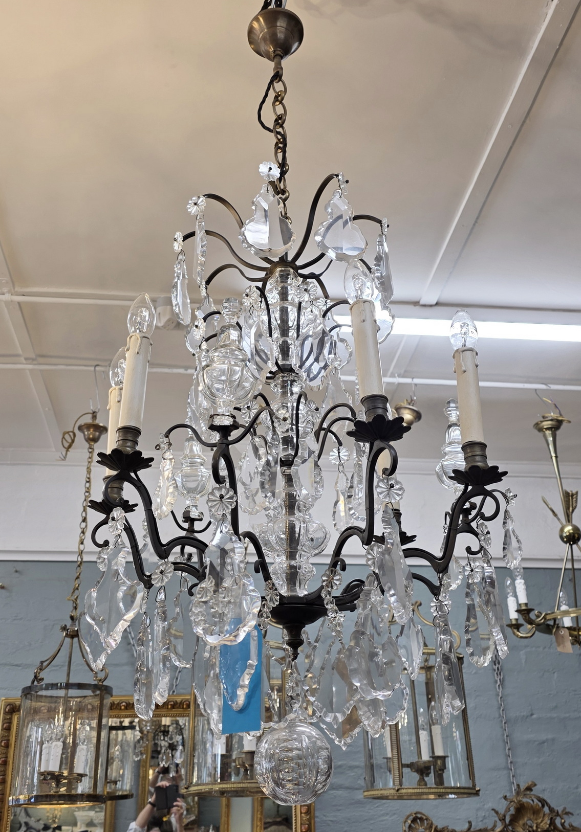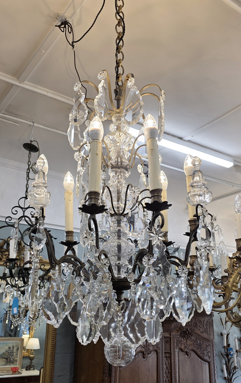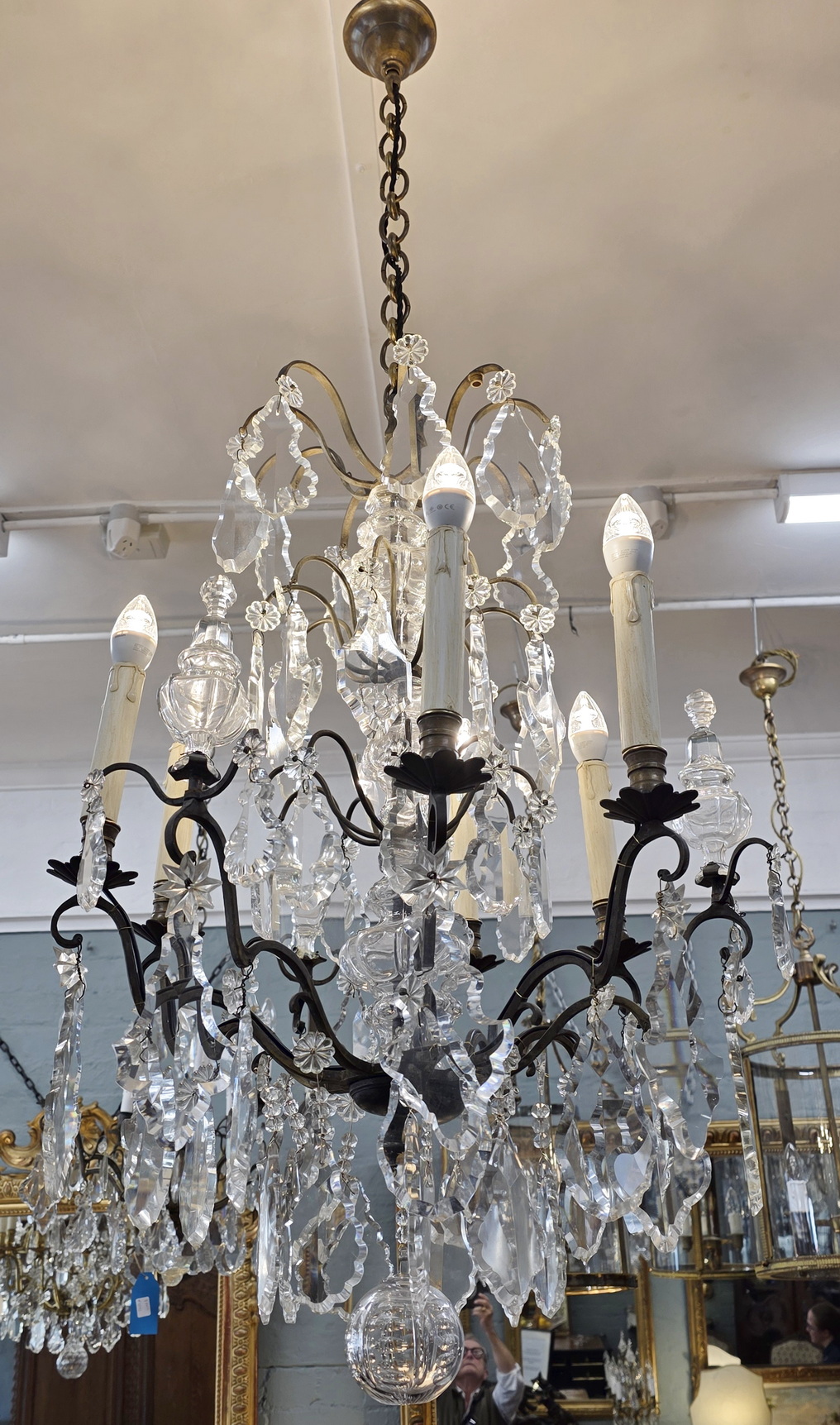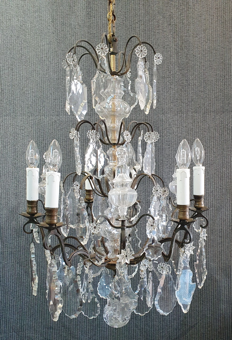 A pair of 18th century French Louis XVI period bronze and cut crystal 'baluster' chandeliers of six lights each, of a suitable size for a drawing or dining room, these Classically proportioned 'baluster' chandeliers are densely decorated with large, shaped and waterwheel-cut crystal drops, with 'rosette' crystals and with large crystal 'poignards' (turret-shaped finials). The chandeliers' bronze structures have an excellent patination, retaining their original and large plinth-balls. Please note the high quality and wonderful shapes of the central balusters. Area of Paris, circa 1780.