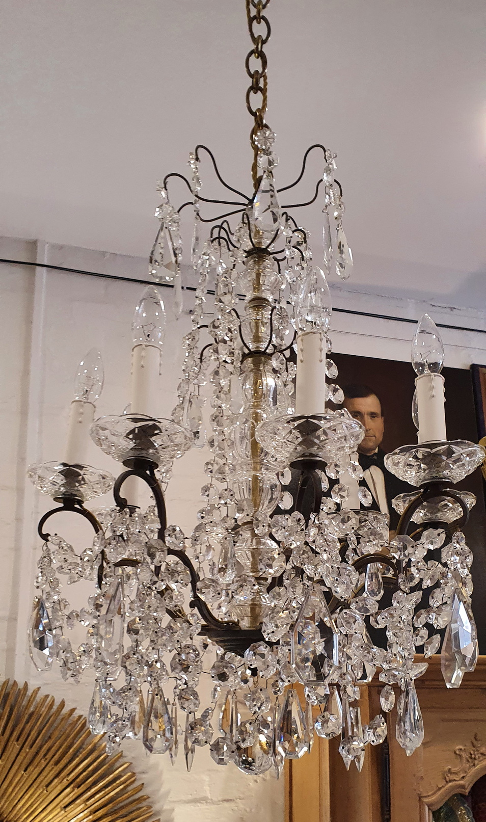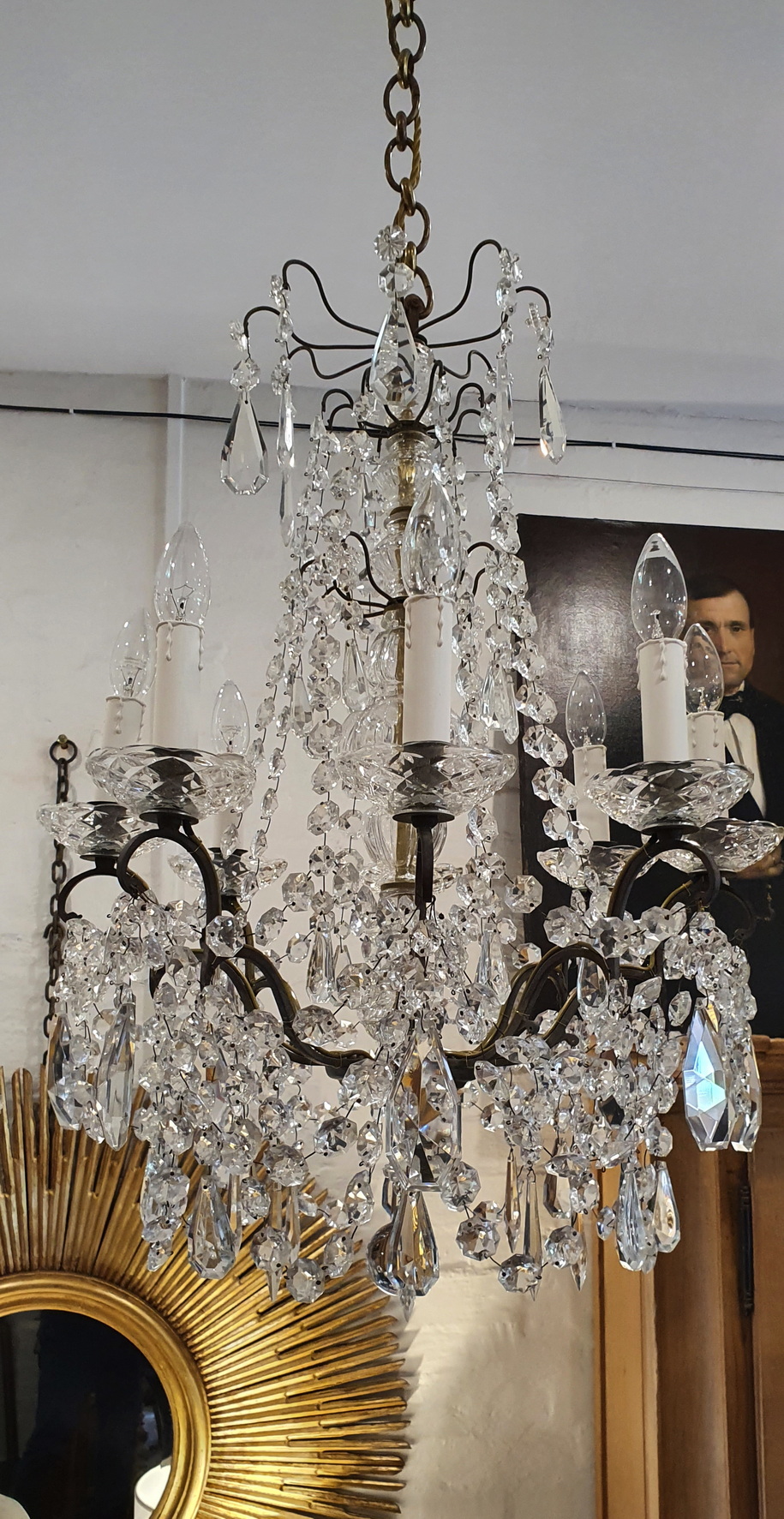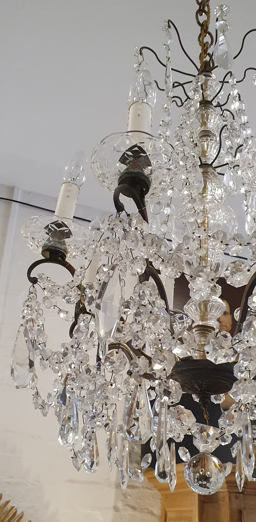 A luminous 19th century French Louis XVI style, eight arm, bronze and Bohemian clear crystal chandelier, decorated with a central baluster surrounded by flowing crystal-bead chains, and with cut crystals drops. Each of the lights retaining its original cut-crystal drip-tray. Retaining the original, cut crystal plinth ball. Area of Paris, circa 1880.