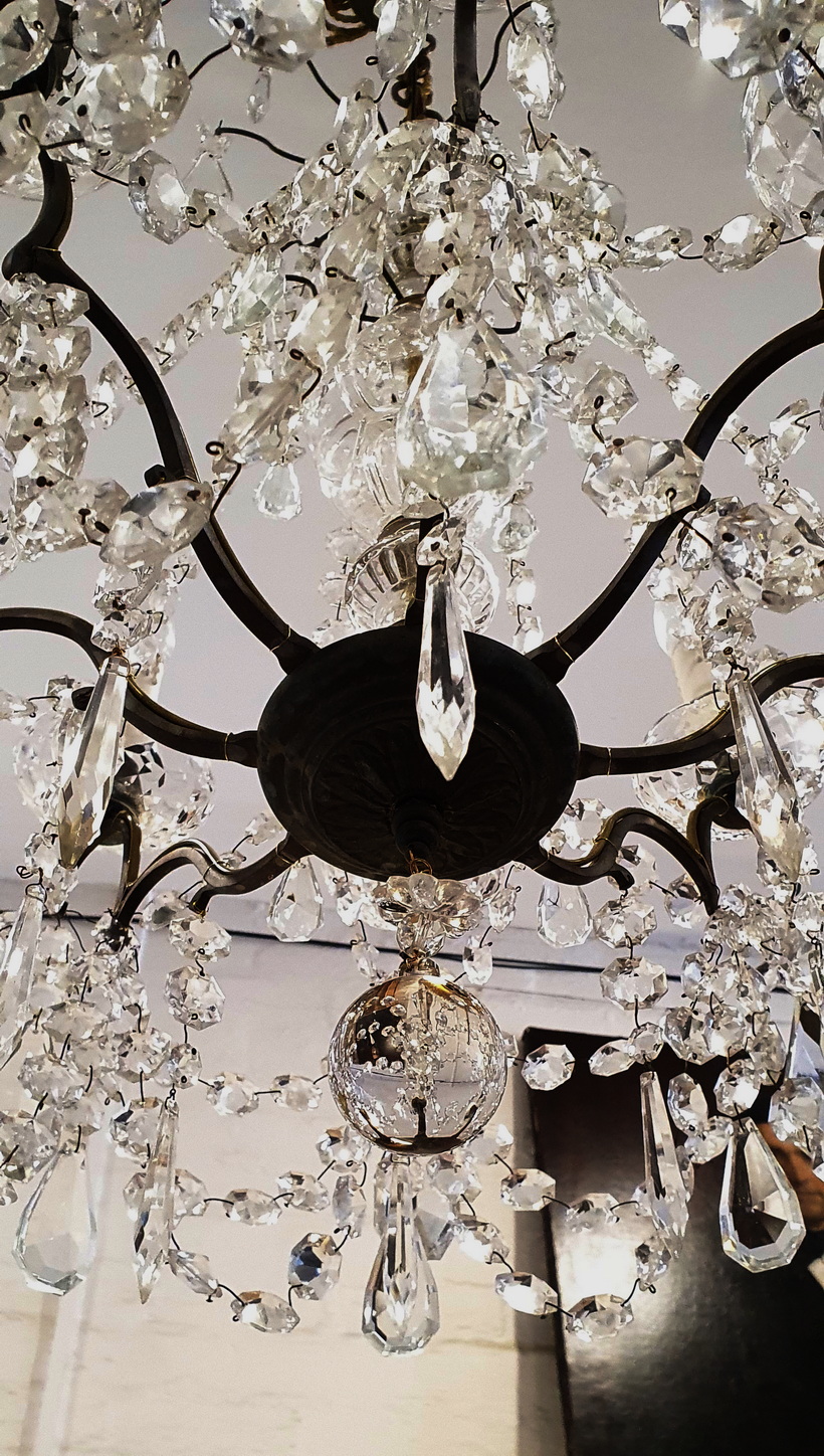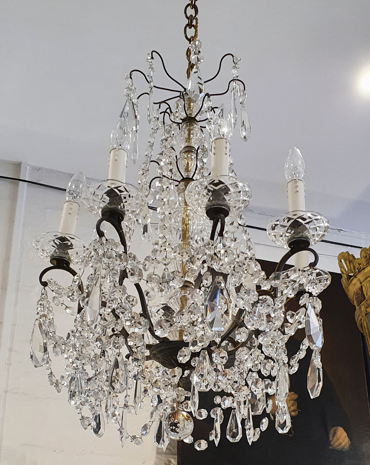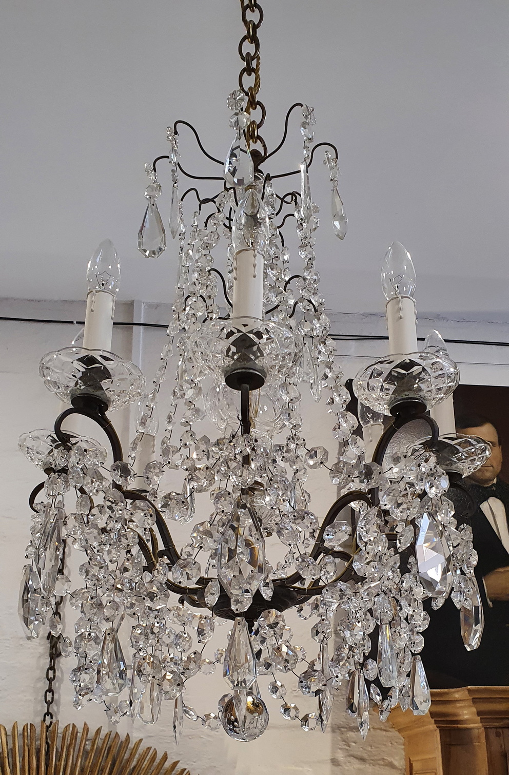 A luminous 19th century French Louis XVI style, eight arm, bronze and Bohemian clear crystal chandelier, decorated with a central baluster surrounded by flowing crystal-bead chains, and with cut crystals drops. Each of the lights retaining its original cut-crystal drip-tray. Retaining the original, cut crystal plinth ball. Area of Paris, circa 1880.
