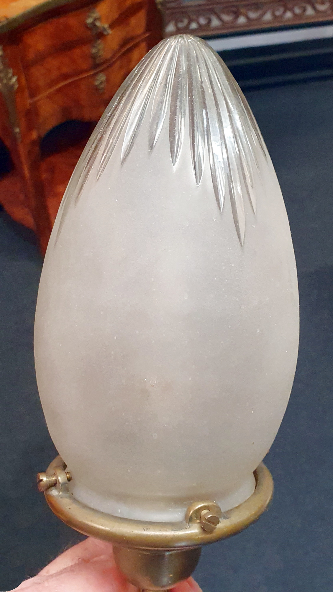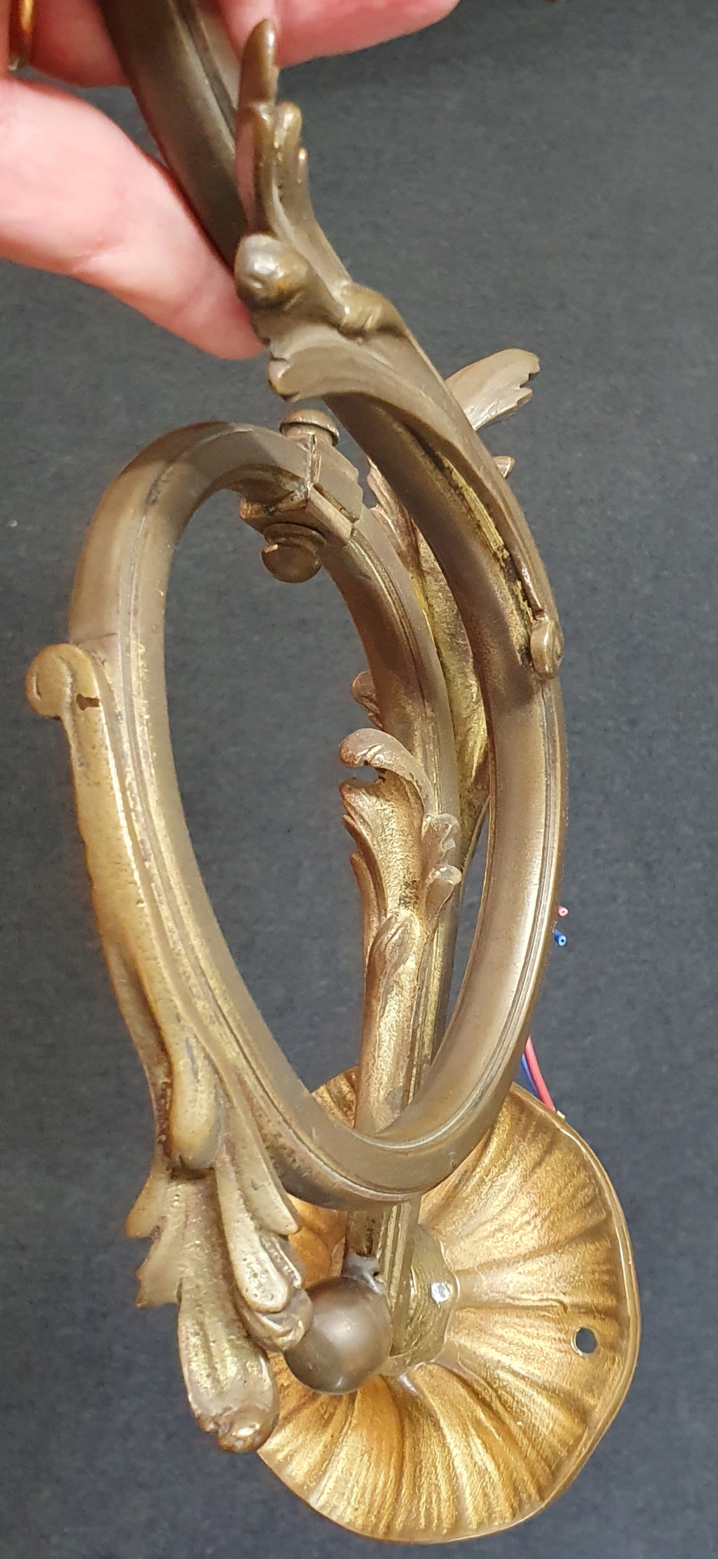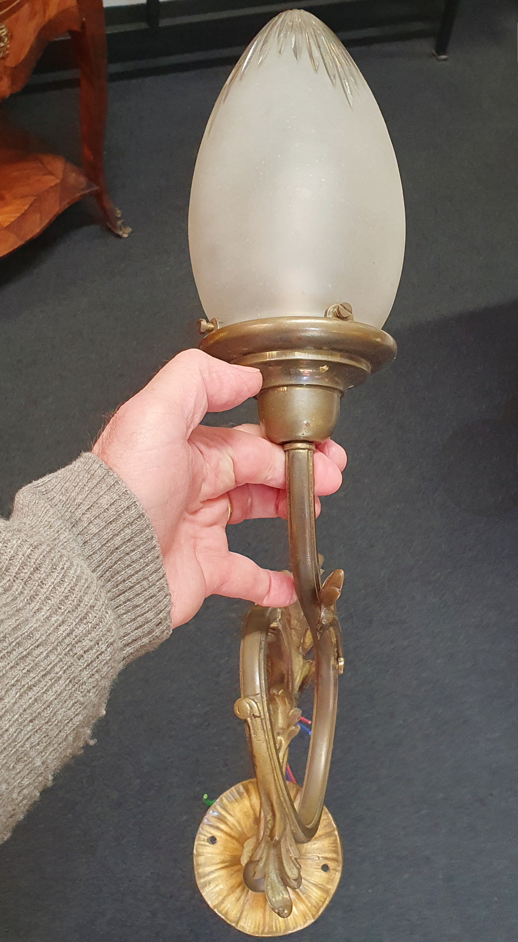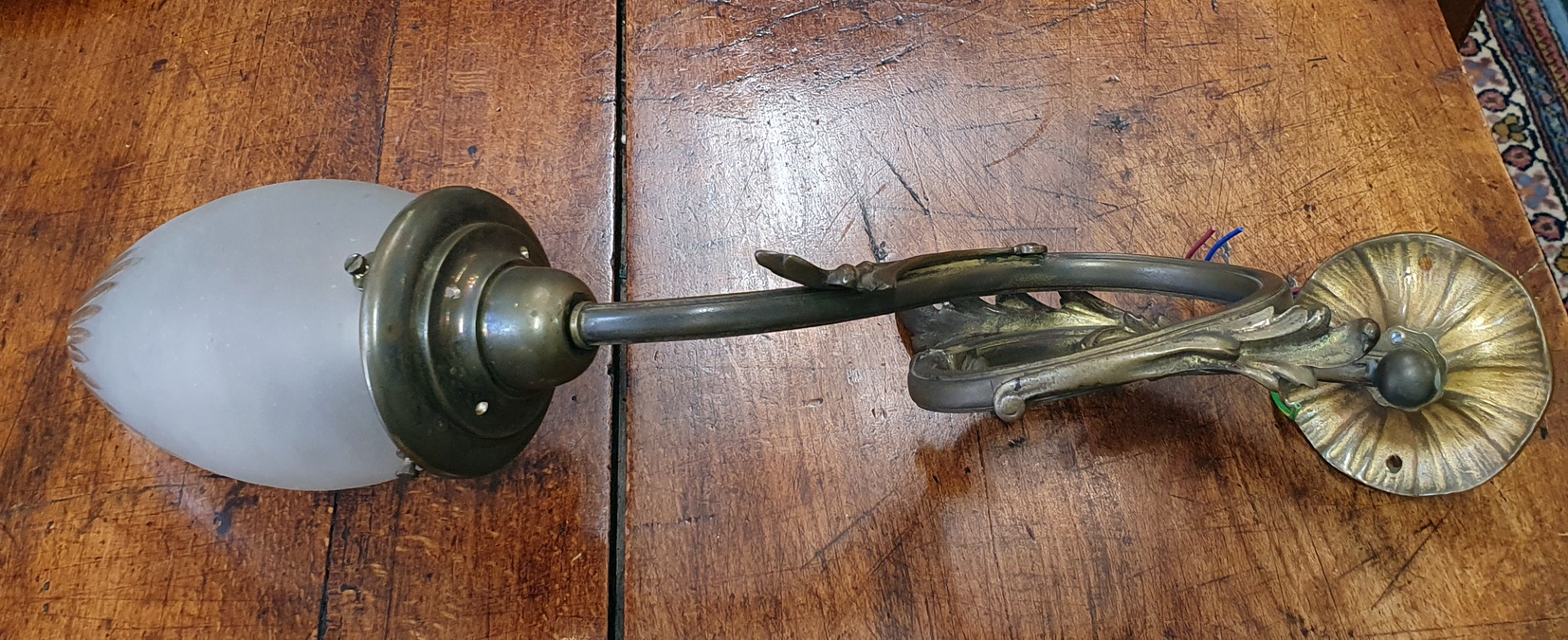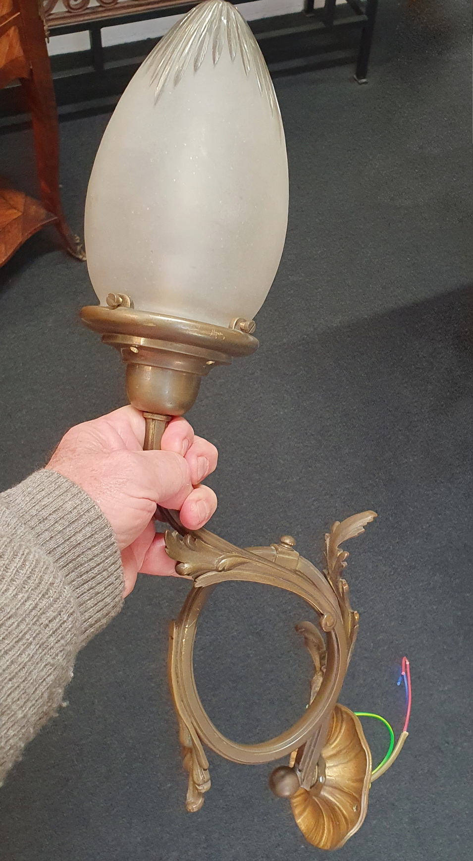 A mid 19th century French Louis XV style, Napoleon III period 'Gasolier' wall lantern, the scroll-shaped gilt brass arm decorated with haut relief leaves, holding the original frosted and cut glass shade. Area of Paris, circa 1870.