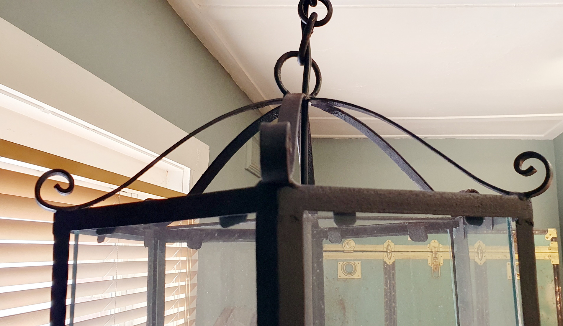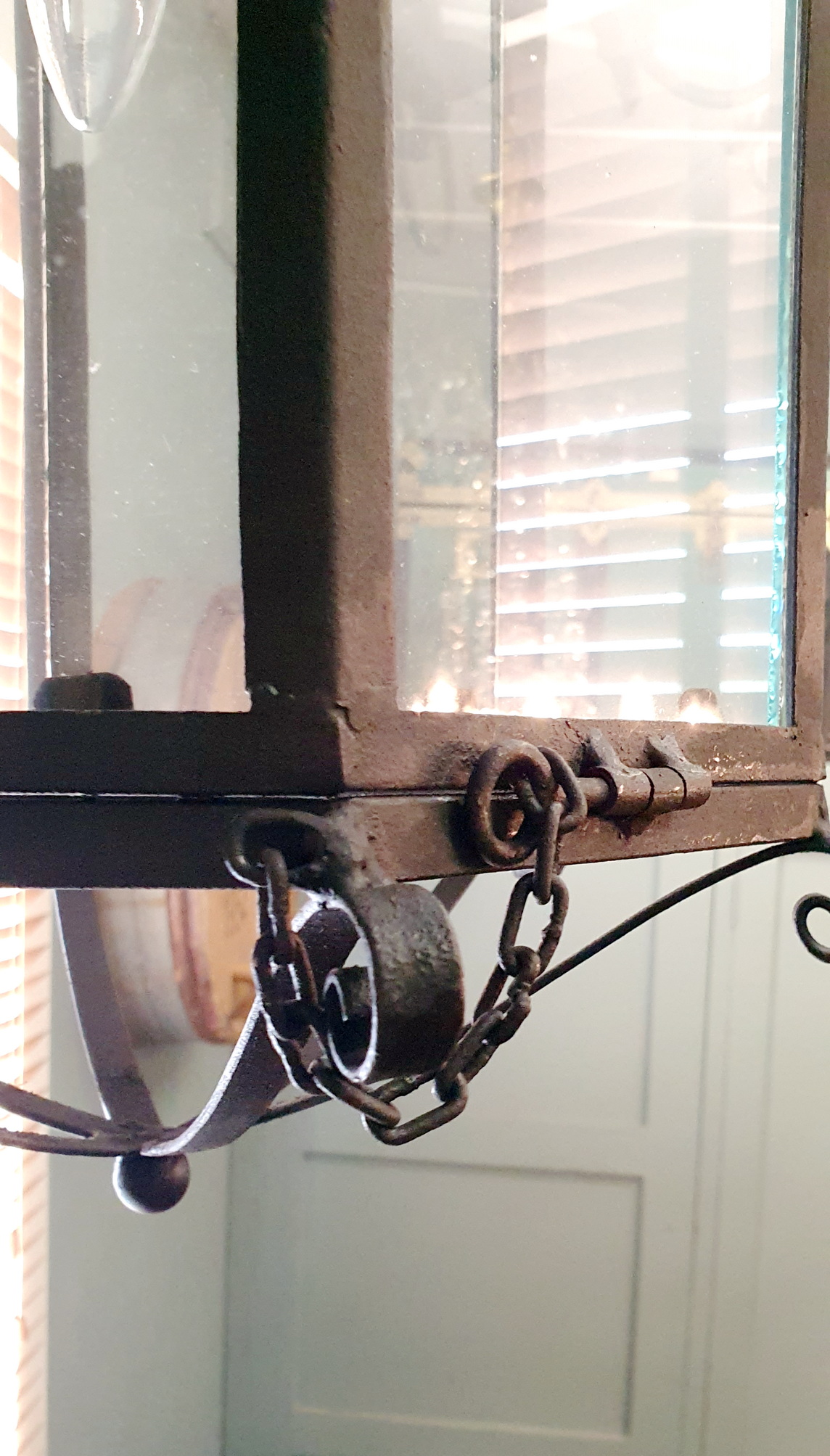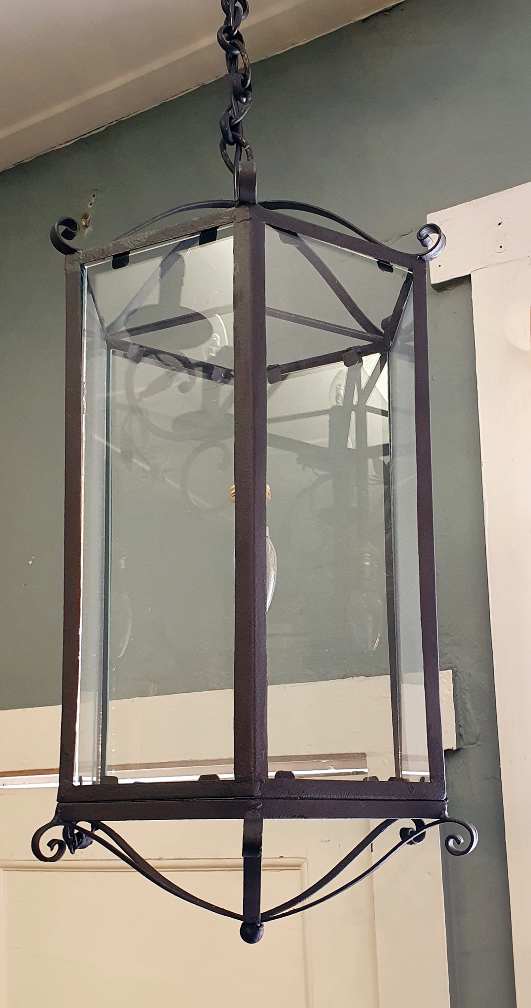A vintage French Provincial , glass panelled and hexagonal-shaped wrought iron lantern, fitted with a domed chimney pediment and plinth, the metal surfaces nicely-worn. Retaining the original hanging-hoop and chain. Please note the rustic hinged door to access the interior. Area of Normandy, circa 1950.
