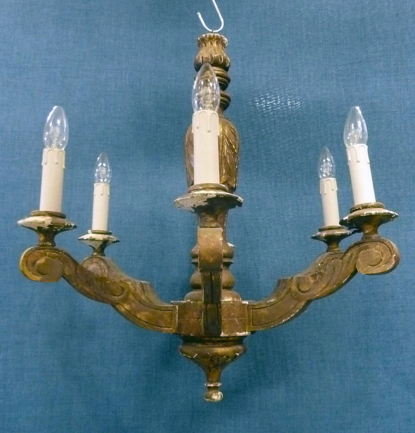A French Louis XVI style carved and gilded six light chandelier of good size and proportions. The gilding is nicely worn and of good, faded colour. Please note the influence of the Art Deco style in the arms and the baluster. Area of Greater Paris, circa 1930.