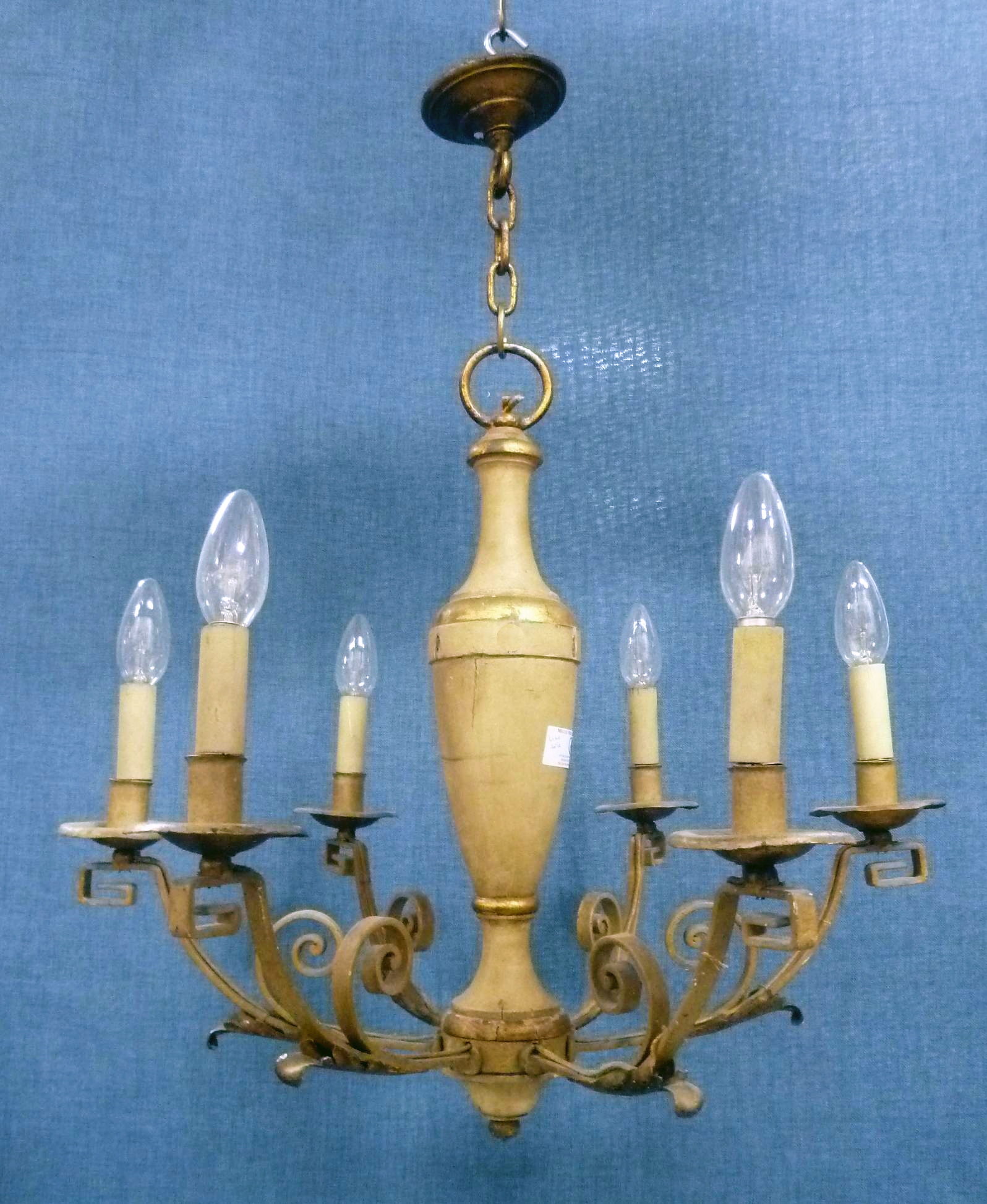 An early 20th century French Art Deco wrought iron, gilt tole work and parcel-gilt chandelier of six arms. Retaining the original, faded painted and gilt tonalities.