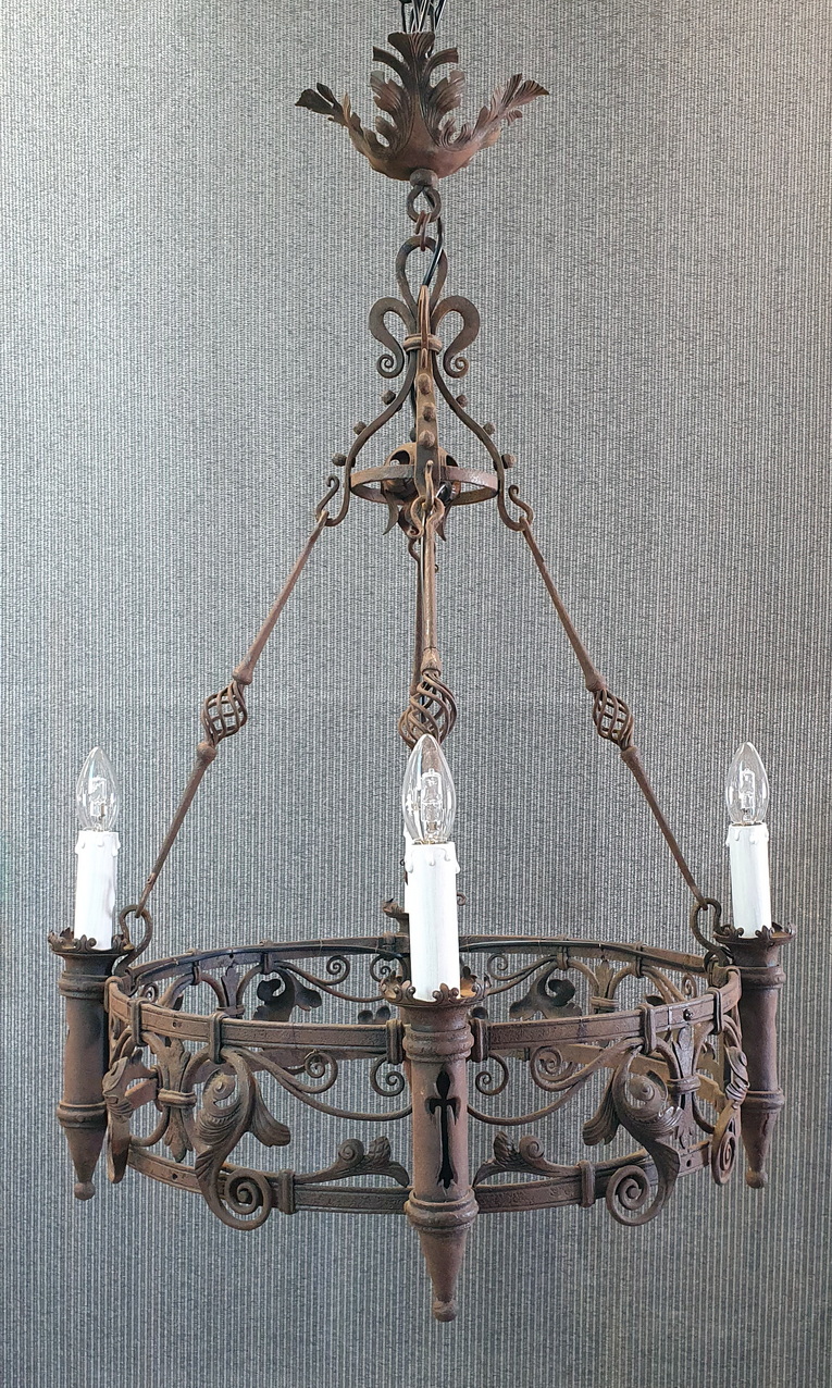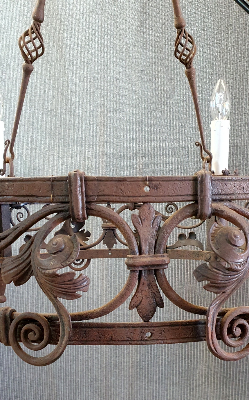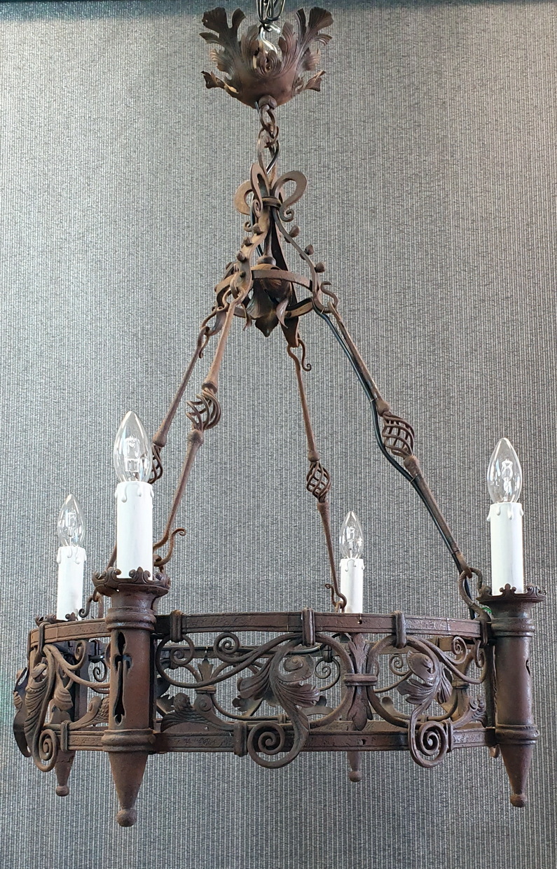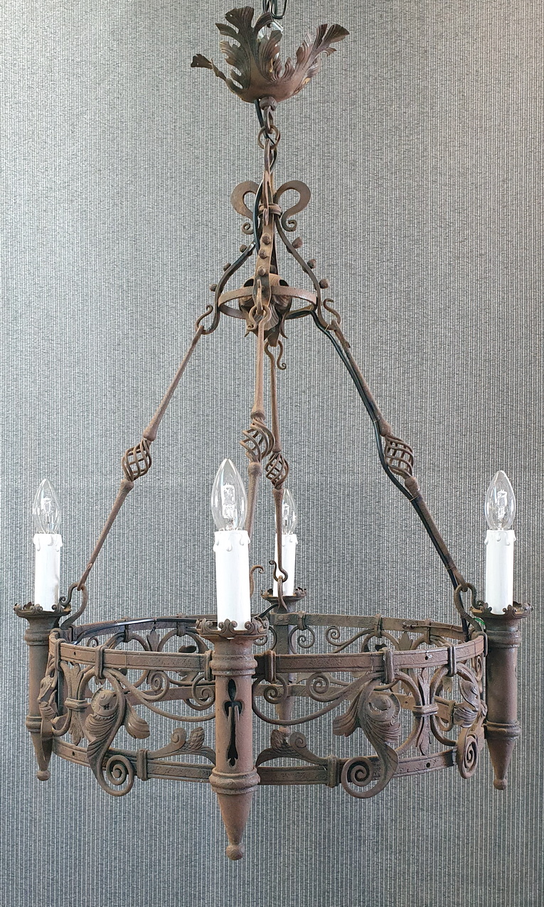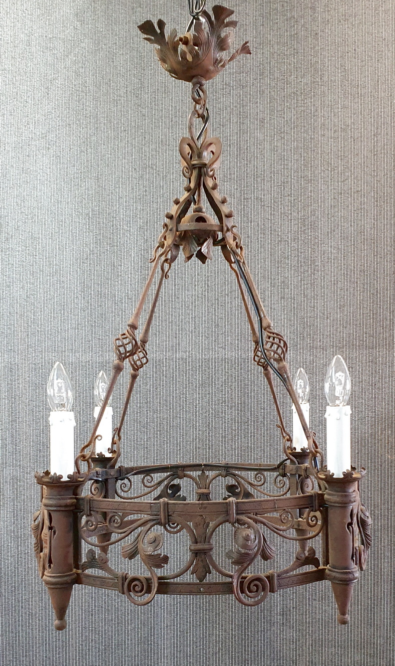 A French Gothic style circular-shaped wrought iron chandelier of 4 "torchere" lights, hanging from its original decorative chains and fleur-de-lys canopy, decorated with stylised foliate and scroll-work motifs. Showing the hand-wrought iron techniques of its early construction. Area of Normandy, circa 1880.
