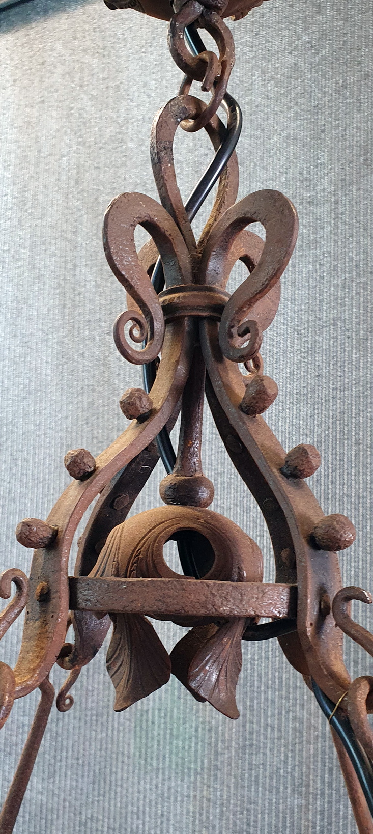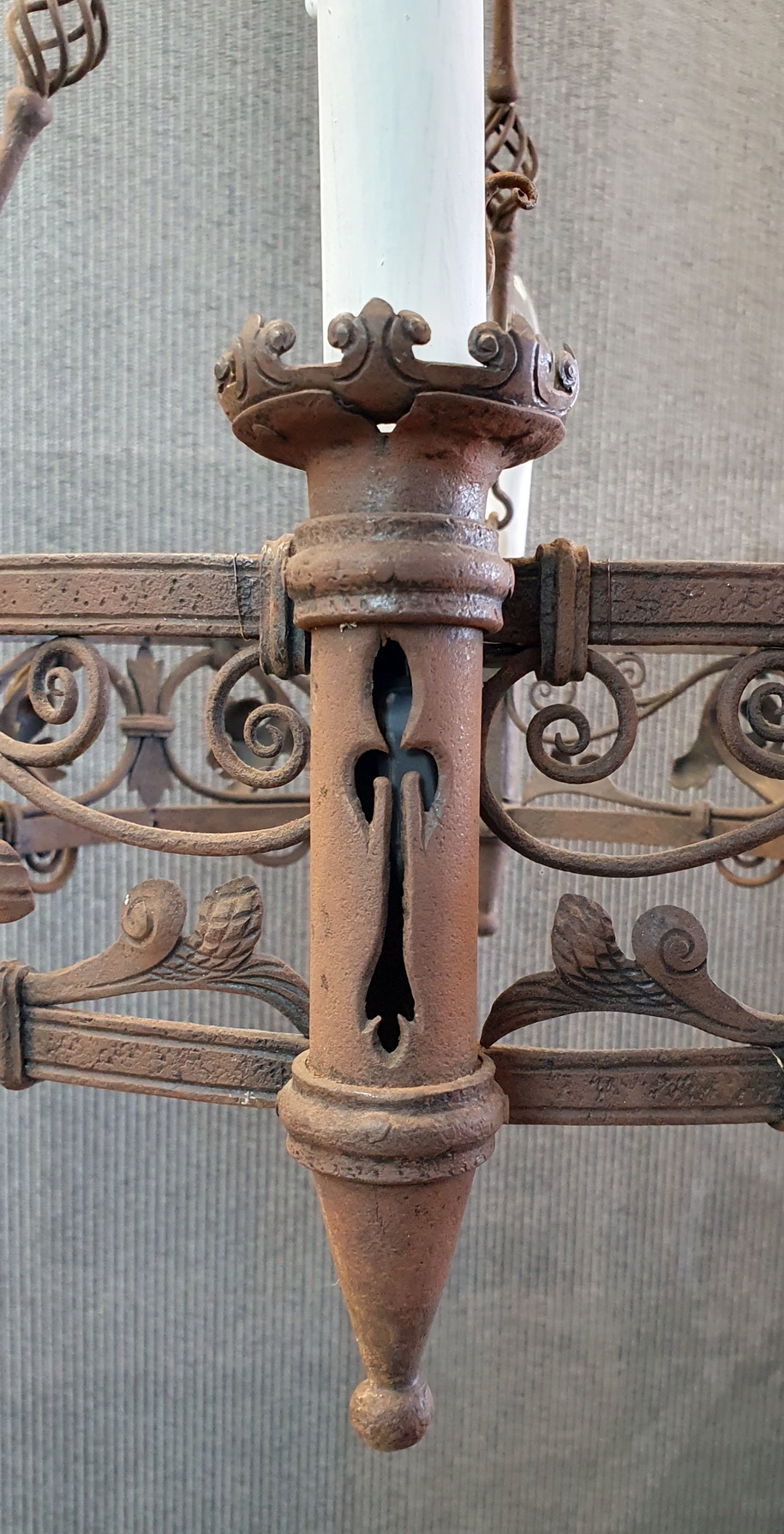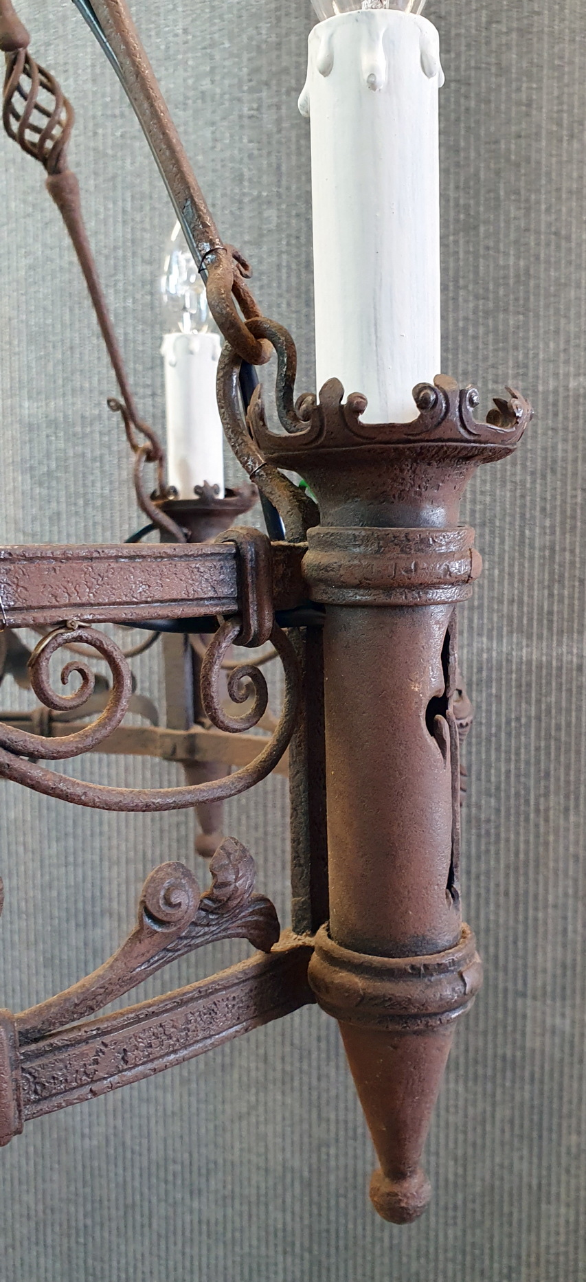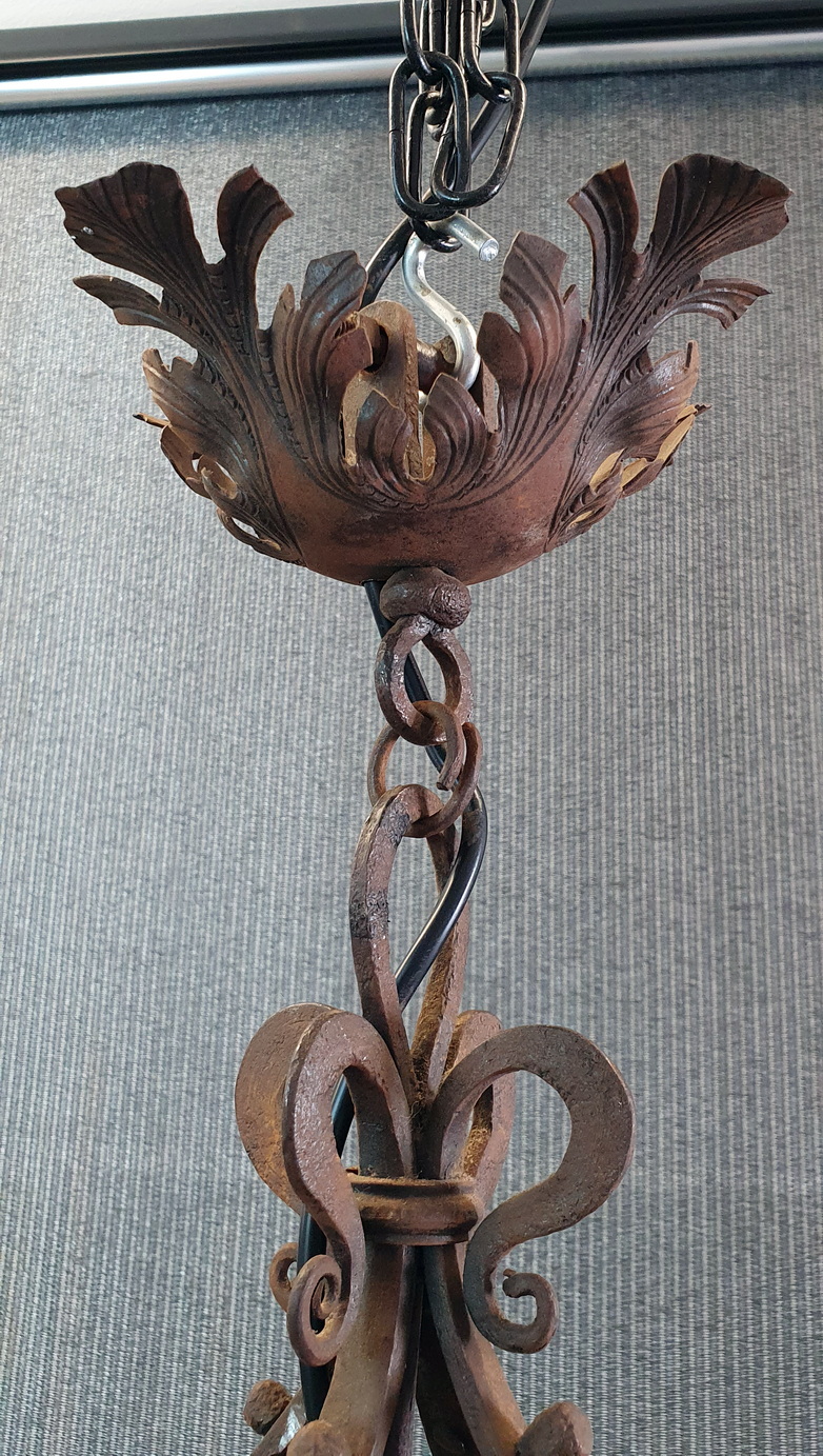 A French Gothic style circular-shaped wrought iron chandelier of 4 "torchere" lights, hanging from its original decorative chains and fleur-de-lys canopy, decorated with stylised foliate and scroll-work motifs. Showing the hand-wrought iron techniques of its early construction. Area of Normandy, circa 1880.