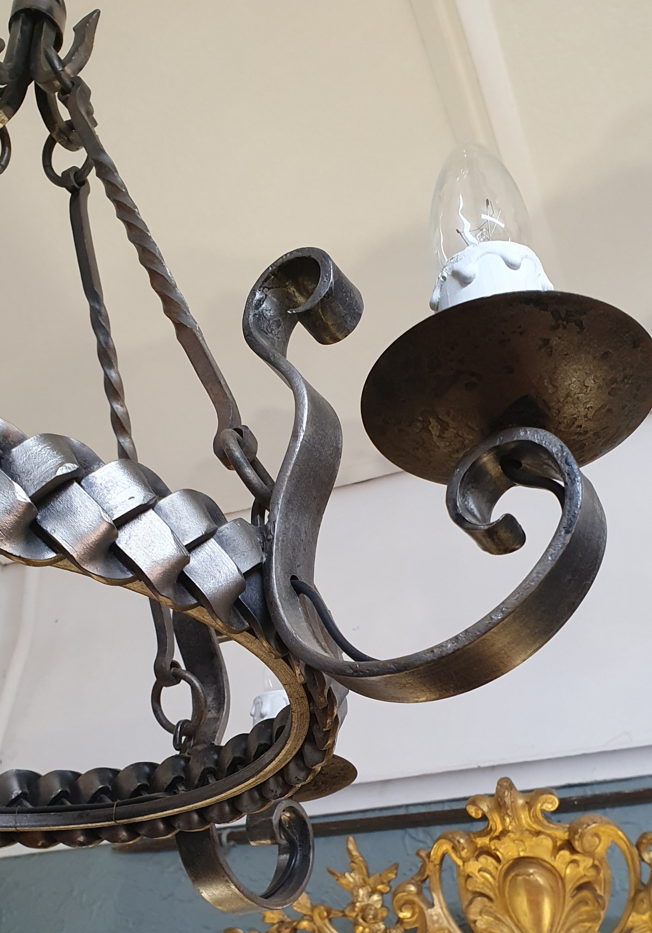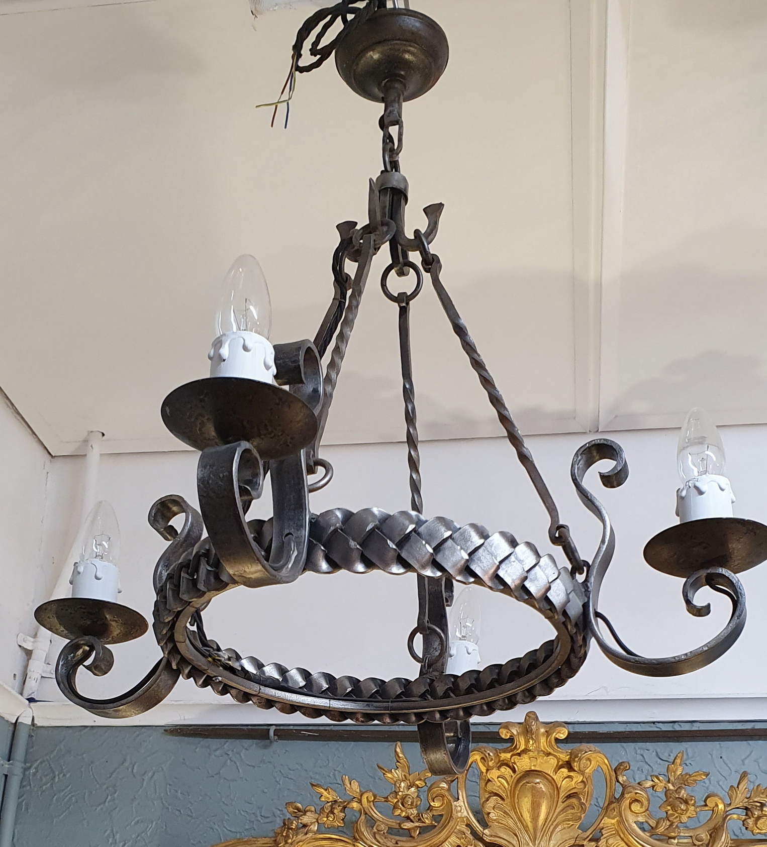 An early 20th century French Provincial wrought iron, four light chandelier composed of a circular body decorated with metal weave-work, four scrolled arms holding the lights, and hanging from the original solid steel baluster and ornamental ceiling hooks. Please note the hand-beaten character of the forged iron. Area of Normandy, circa 1930.