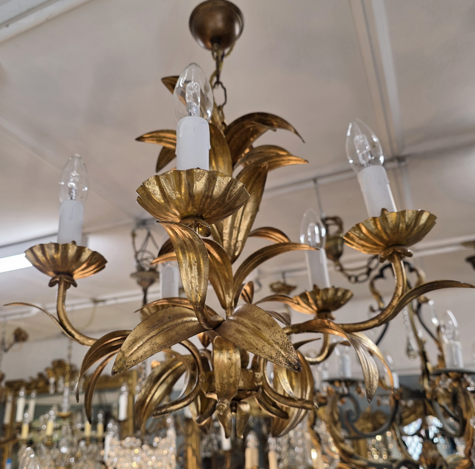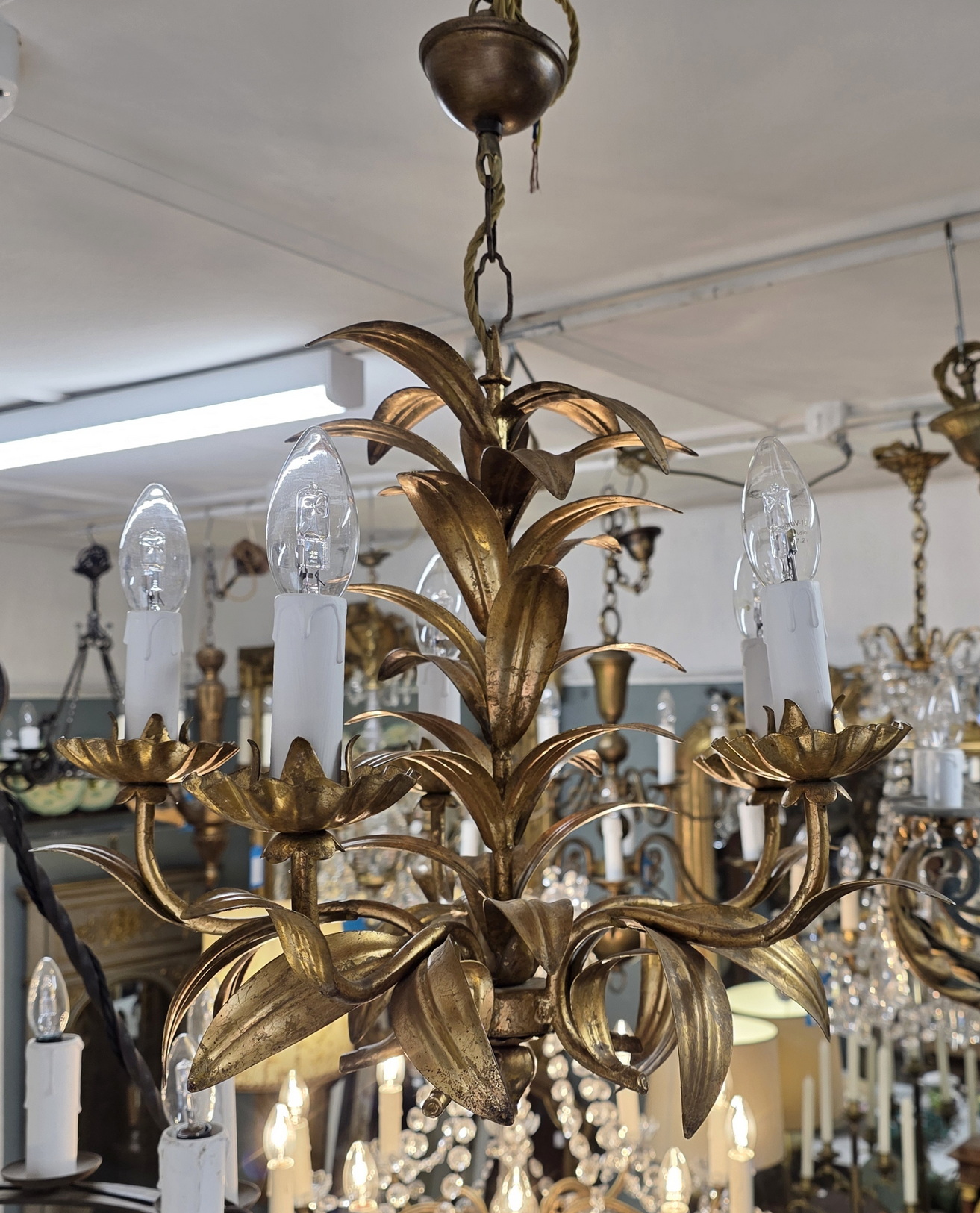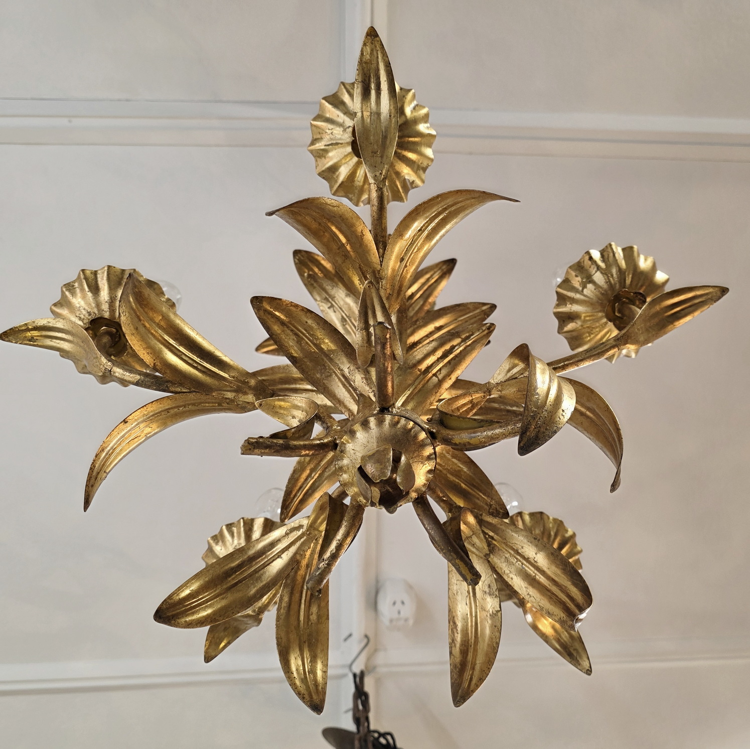 A vintage 20th century German gilt wrought iron and tole-work five light, decorated as a bouquet of foliage. Attributed to Hans Kögl, who was renown for his gilt tole chandeliers work depicting foliate and flower motifs. Retaining the original ceiling cup. Area of Germany, circa 1970.
